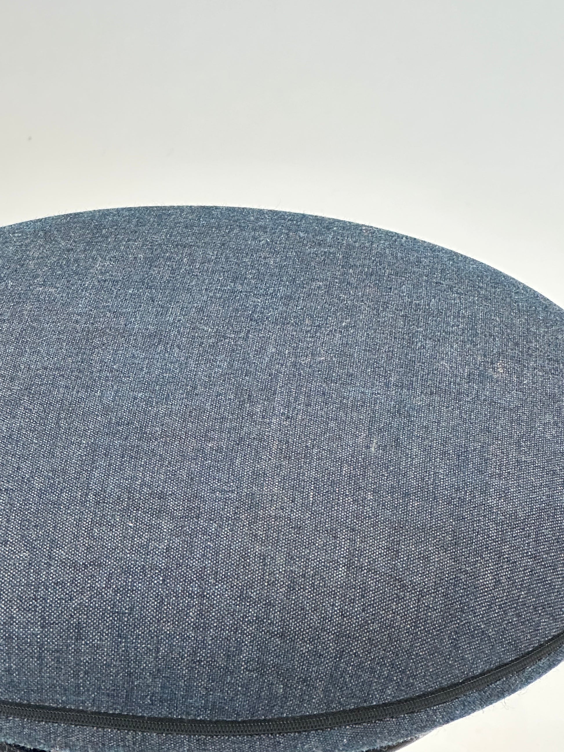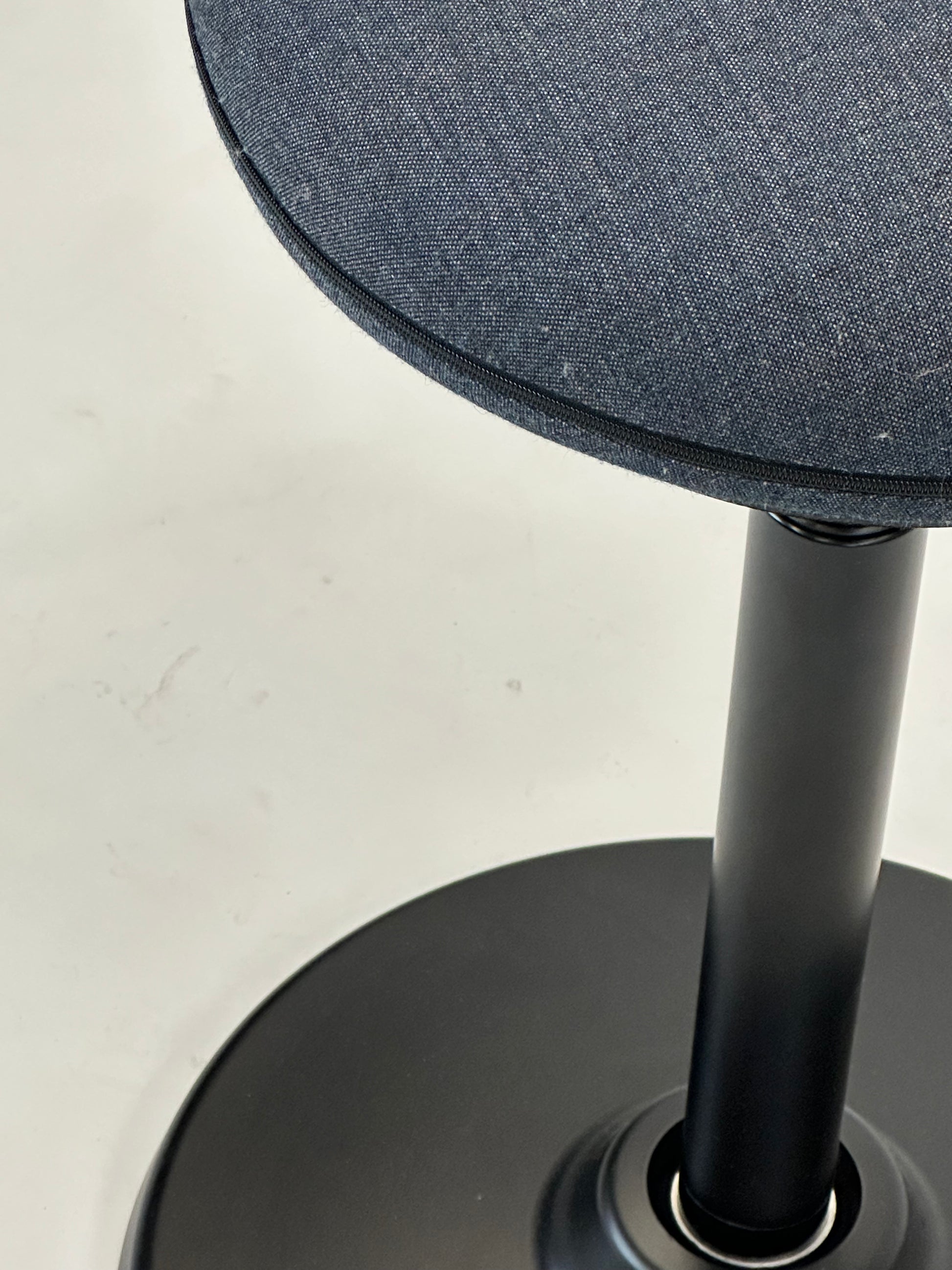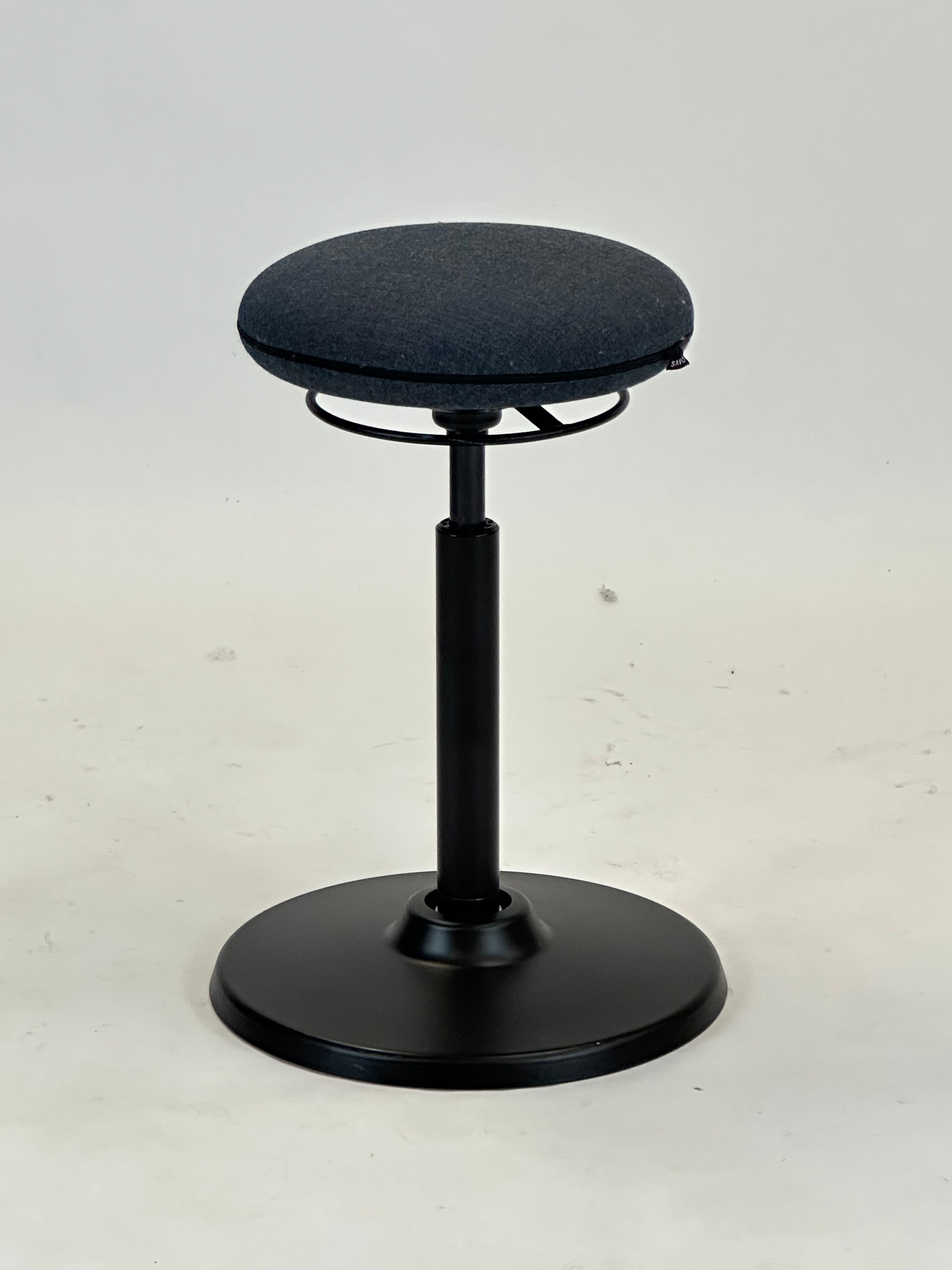 Stolen er udført med en rund, polstret sædeplade i mørkegråt stof, som giver både komfort og et elegant udtryk. Den solide sorte base sikrer stabilitet, mens den justerbare gaslift gør det nemt at tilpasse højden efter behov – uanset om du ønsker at sidde, stå eller noget midt imellem.