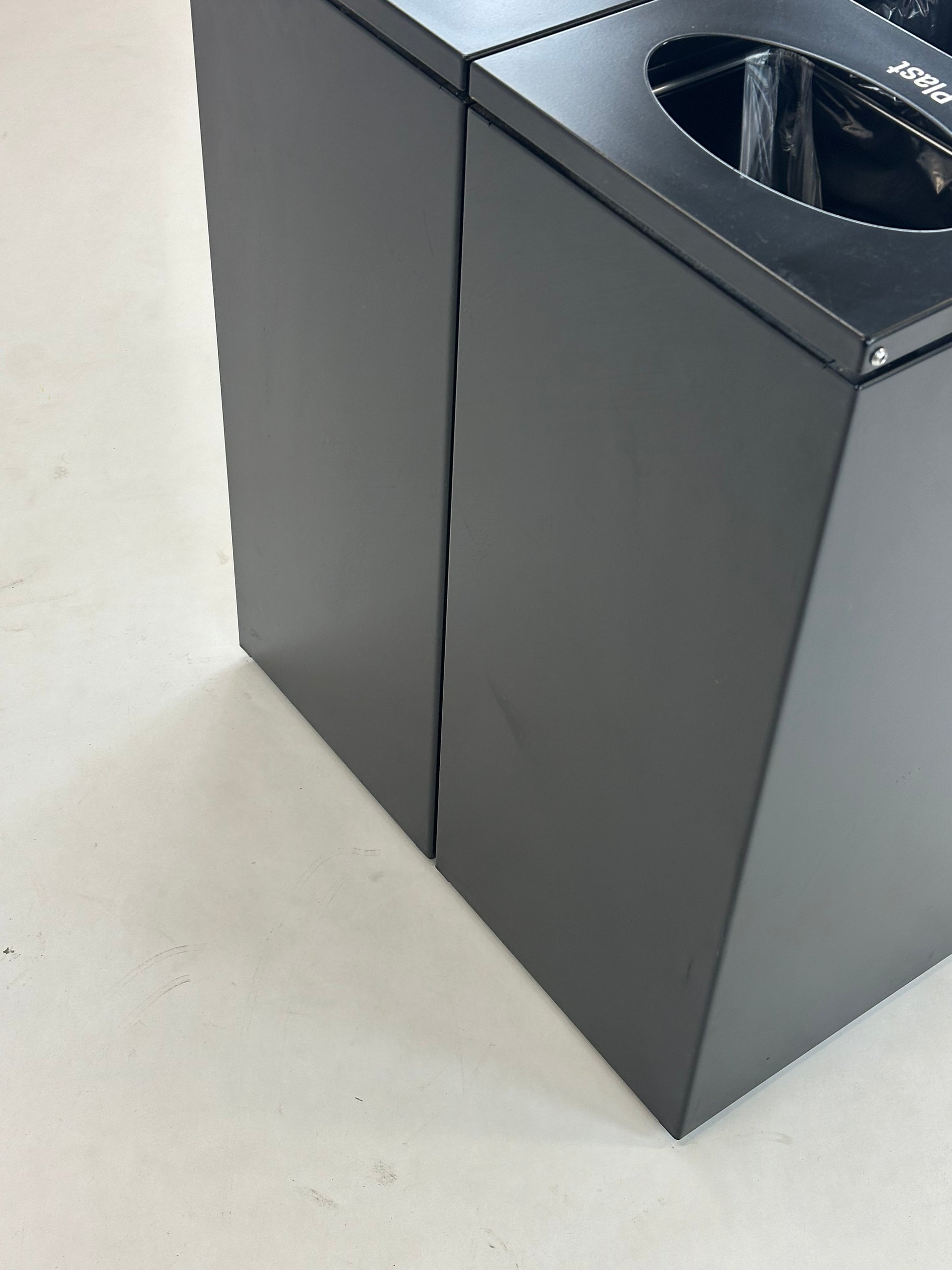 Denne affaldssorteringsstation er en funktionel og stilren løsning til korrekt affaldshåndtering på kontorer, i kantiner og offentlige rum. Med sit elegante sorte design og tydelige sorteringsmarkeringer bidrager den aktivt til den grønne omstilling, samtidig med at den opretholder et ryddeligt og organiseret miljø.