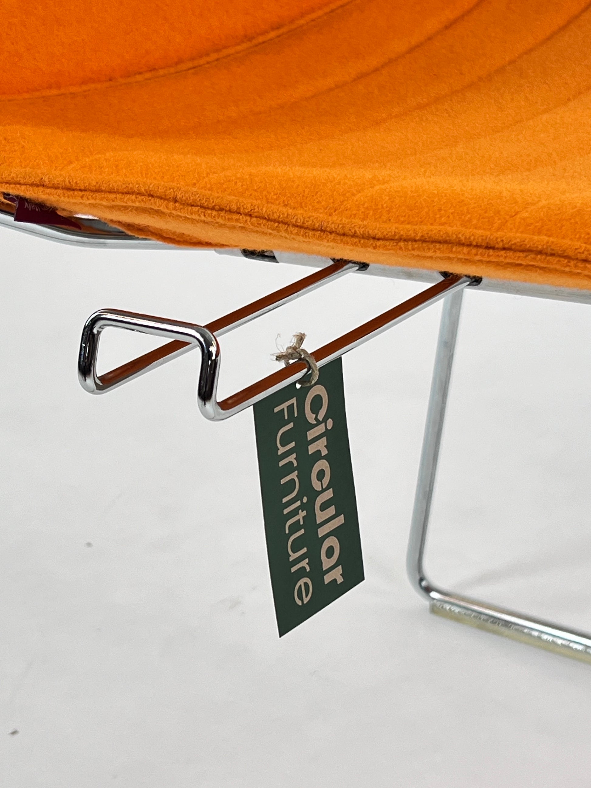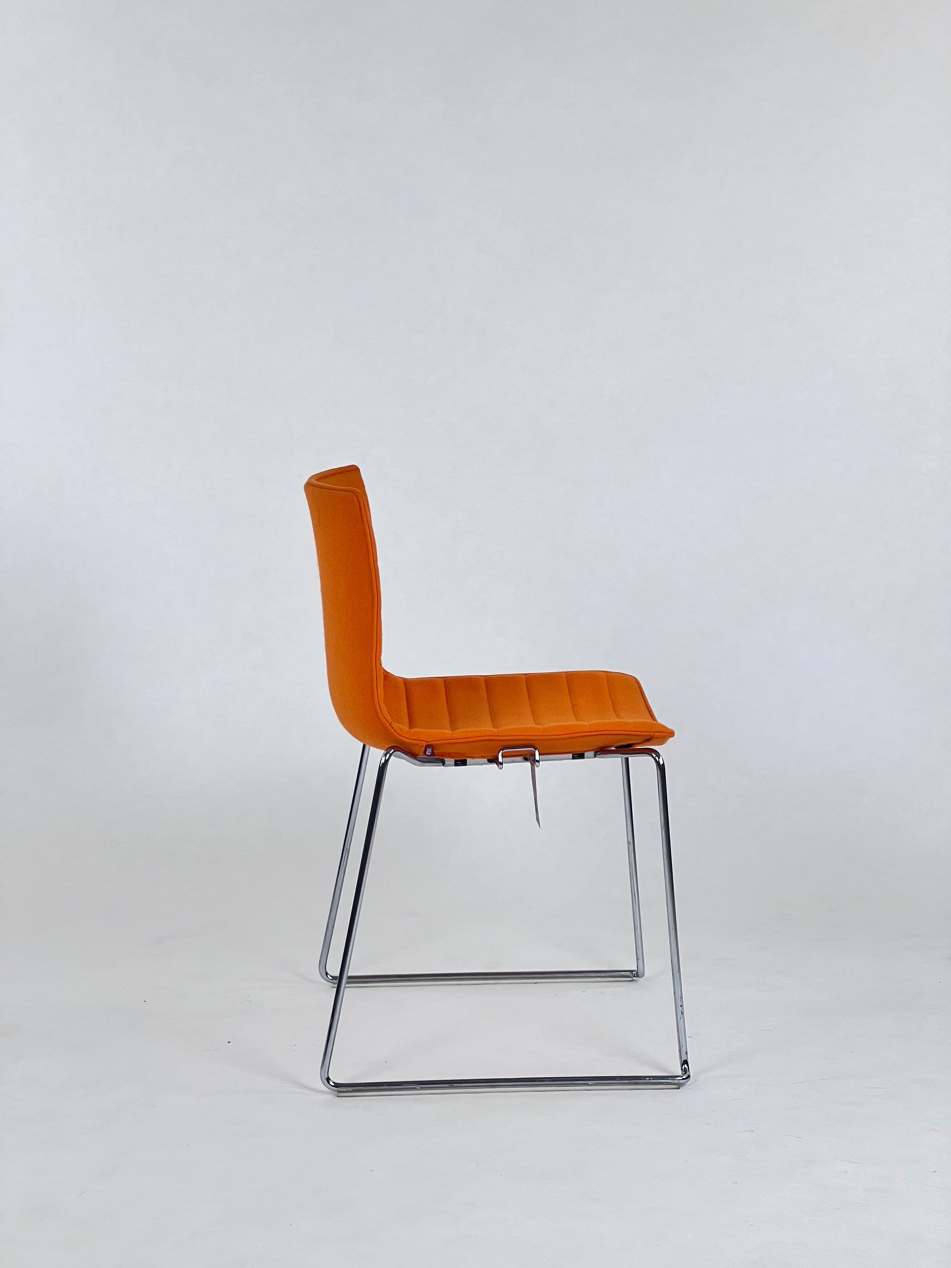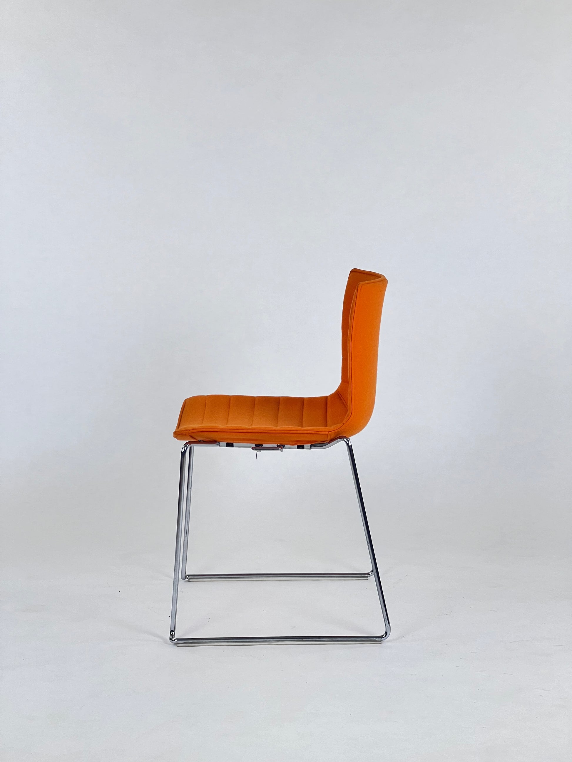 - Sæde: Stolen er polstret i en varm orange farve, som giver en let og elegant fremtoning.