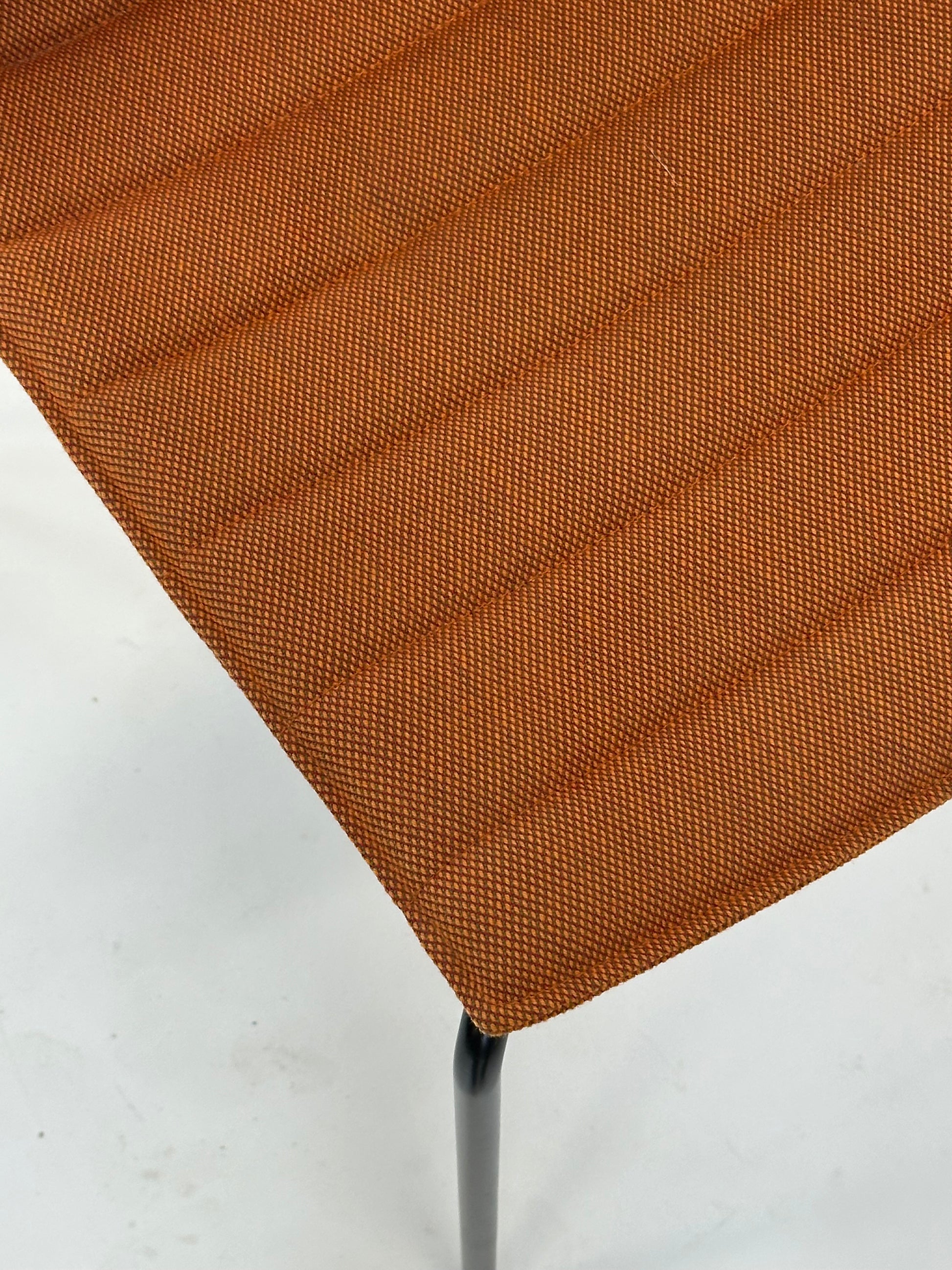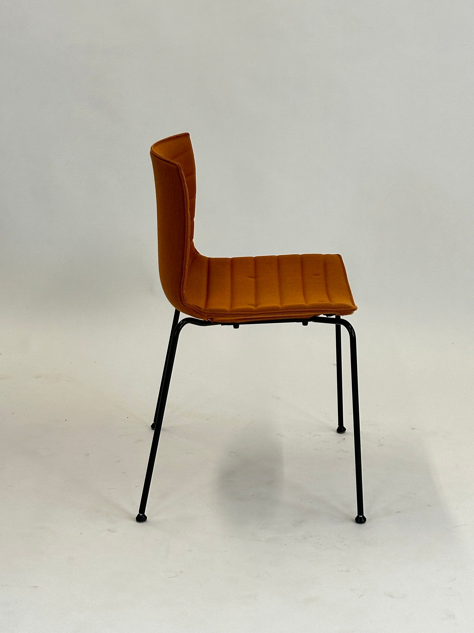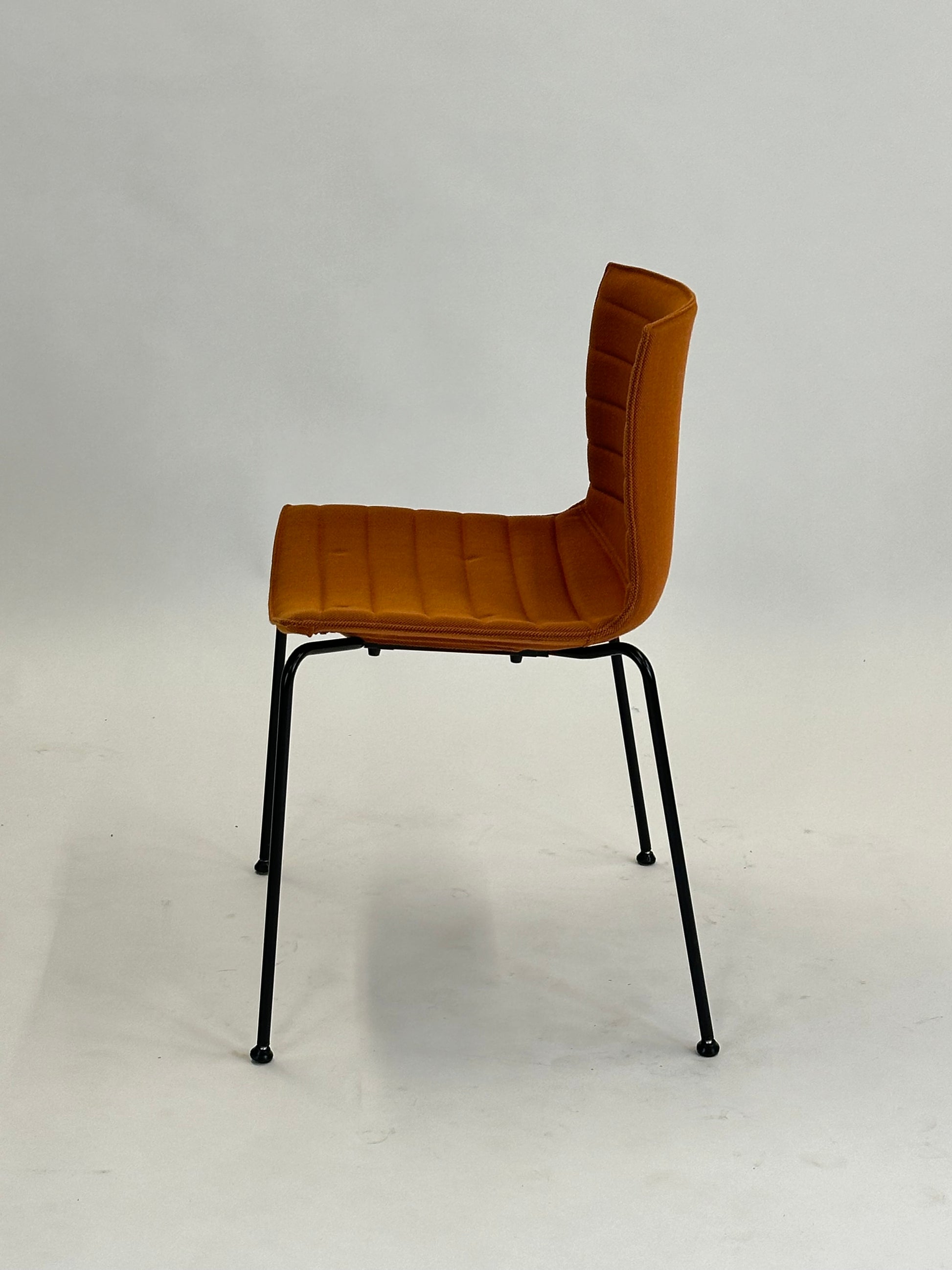- Sæde: Stolen er polstret i orange stof, som giver en let og rolig fremtoning.