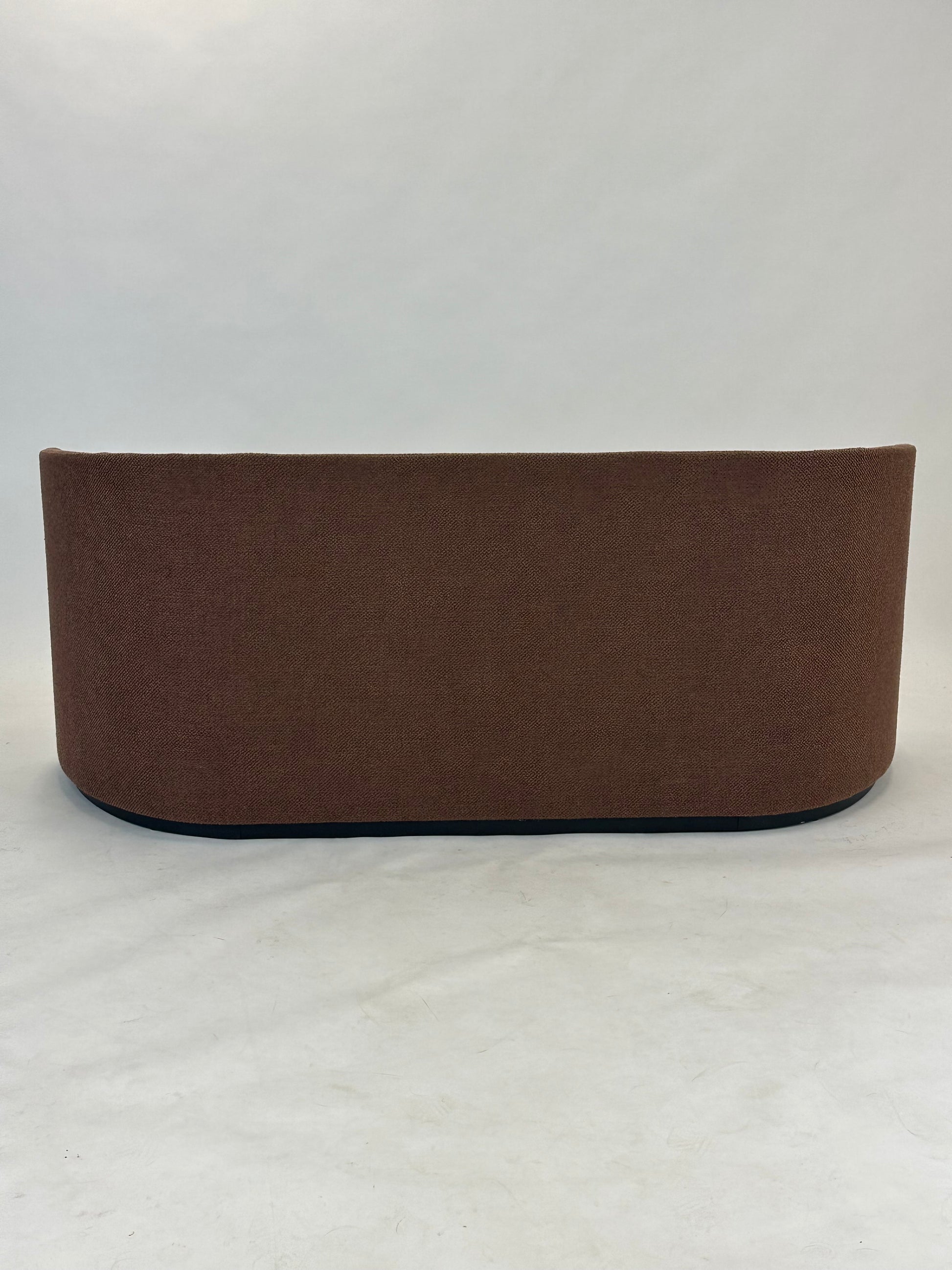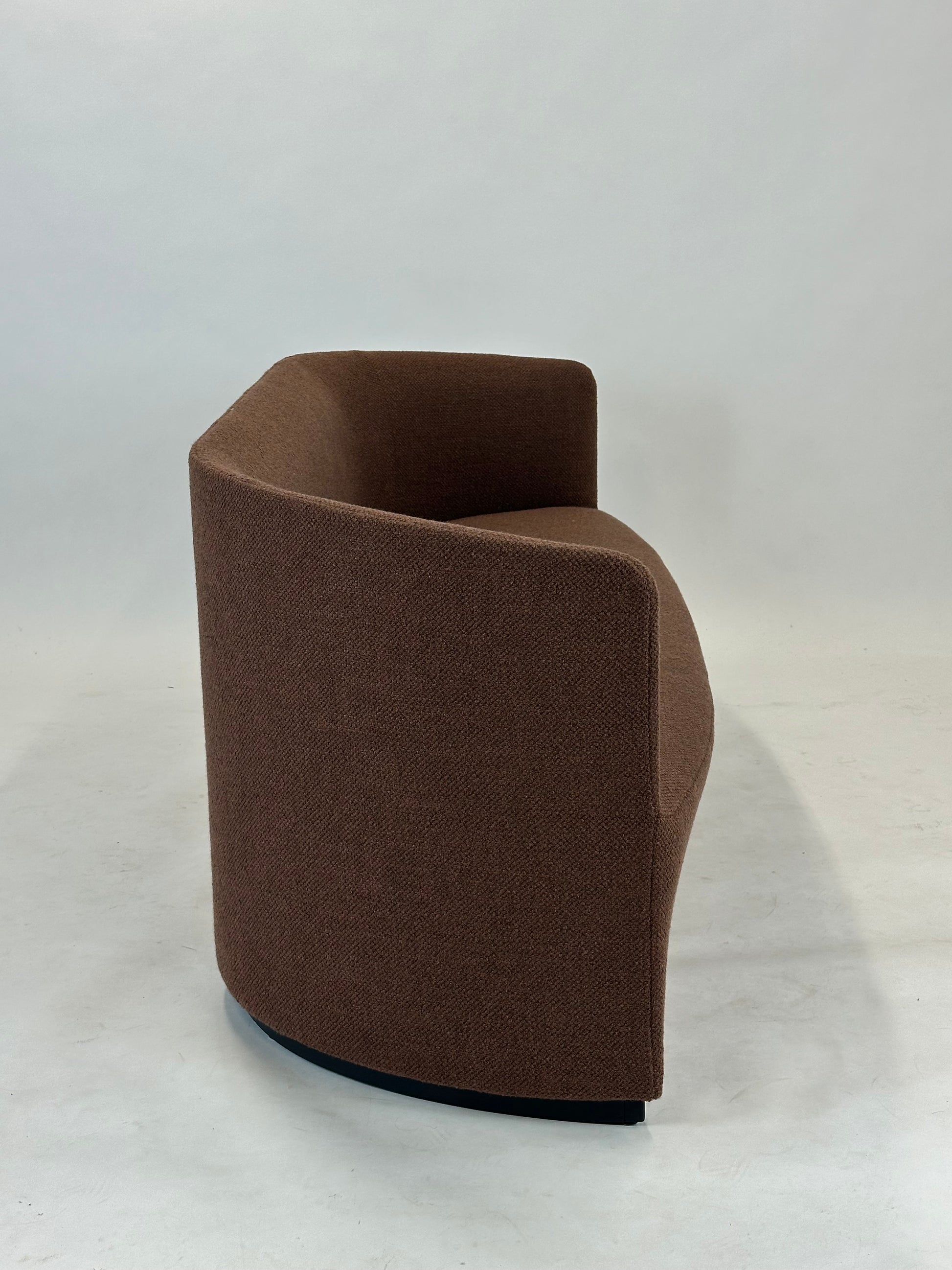 Den buede ryg og faste polstring giver sofaen et skulpturelt og indbydende udtryk, mens den dybe siddekomfort gør den ideel til både loungeområder, receptioner og eksklusive kontormiljøer. Den brune polstring tilføjer varme og karakter til rummet og skaber en sofistikeret atmosfære.