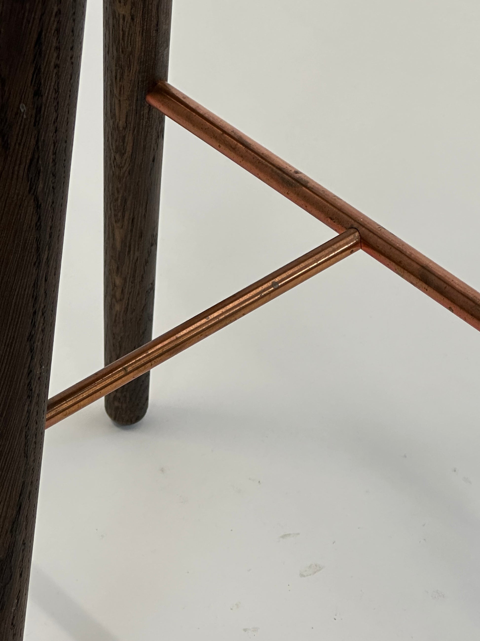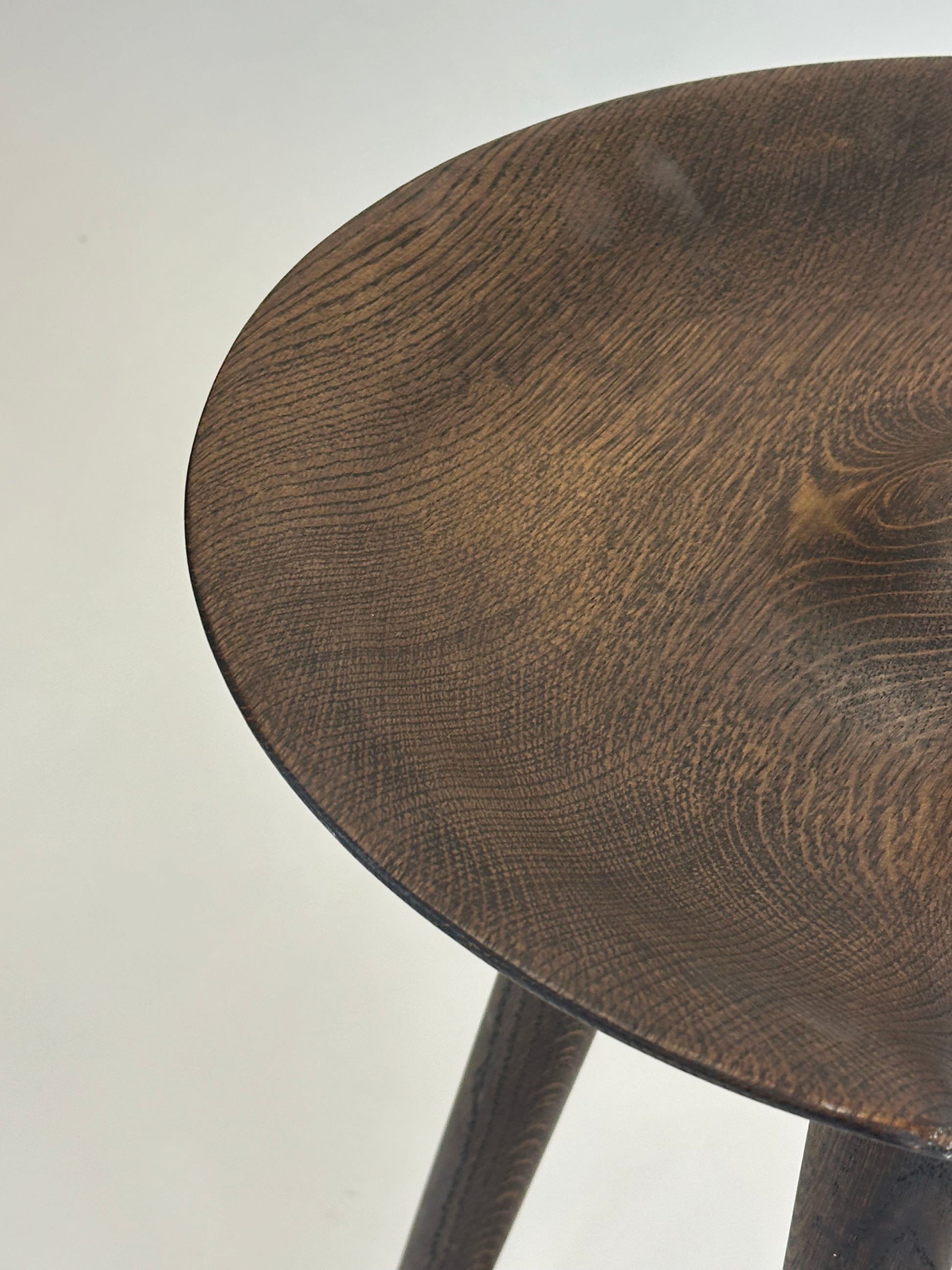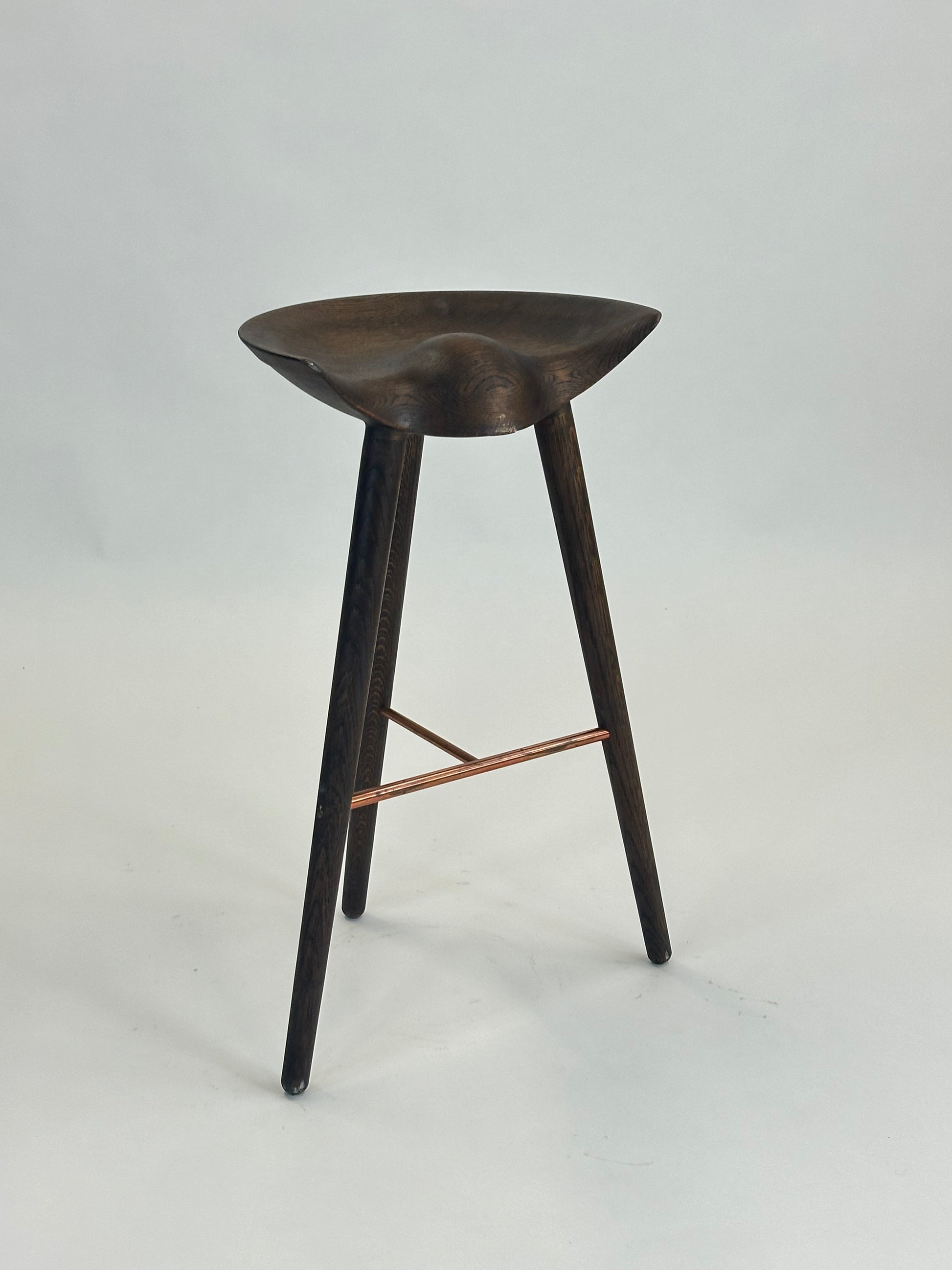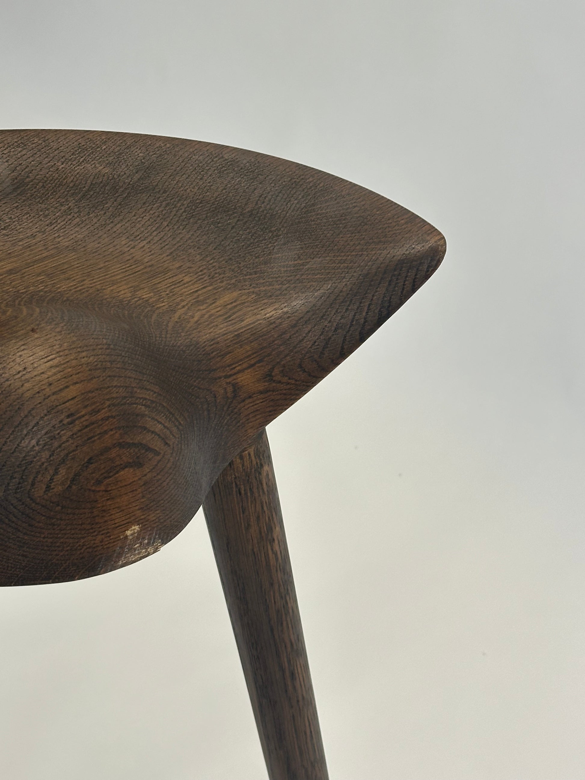 Sædet er udført i mørkbejdset træ og har en organisk udformning, der sikrer både æstetik og komfort. De tre slanke ben giver stolen et let og elegant udtryk, mens den integrerede fodstøtte i messing tilfører varme og et raffineret visuelt element. Kombinationen af tidløst design og kvalitetsmaterialer gør ML42 til en klassiker inden for dansk møbeldesign.