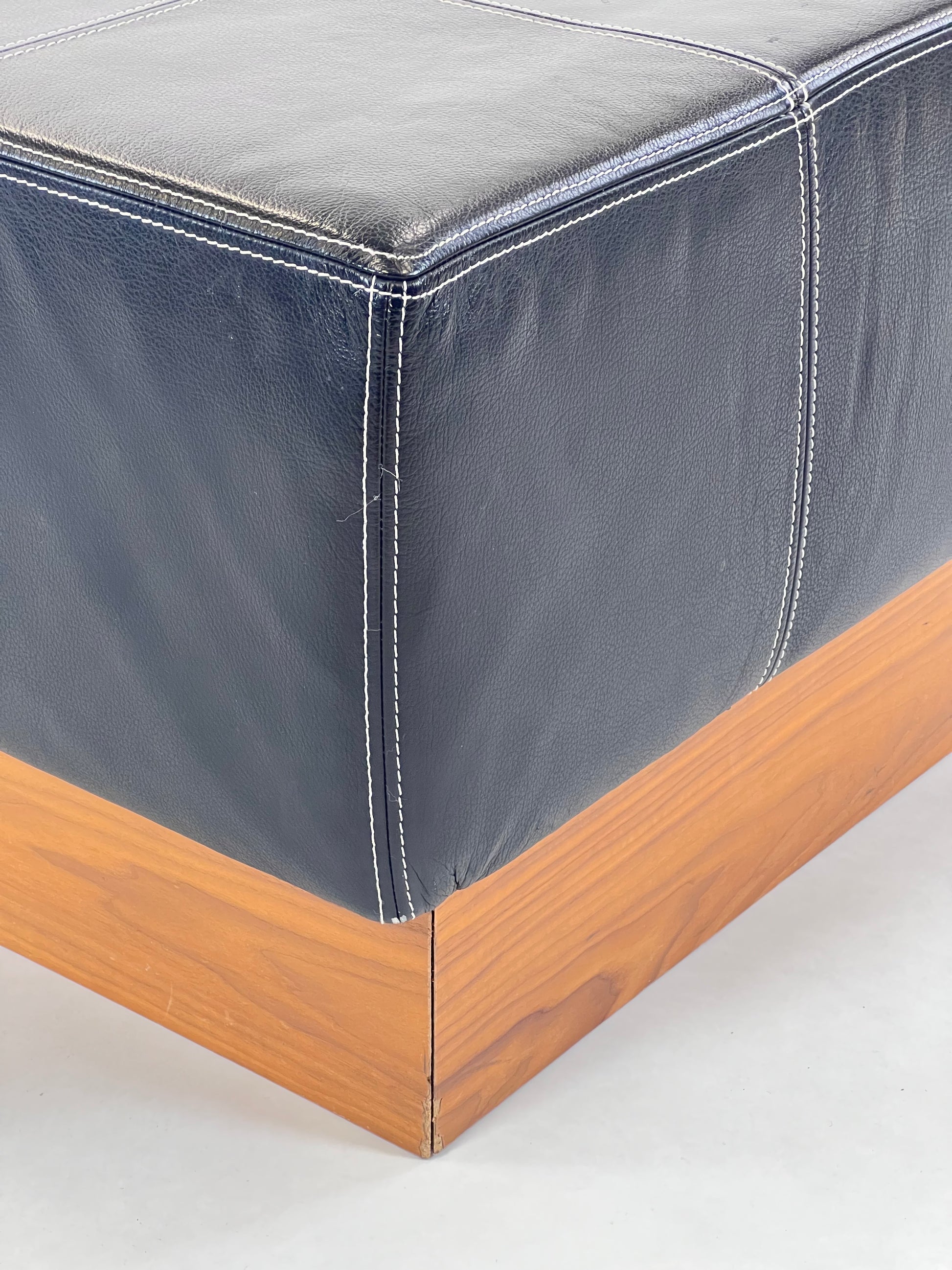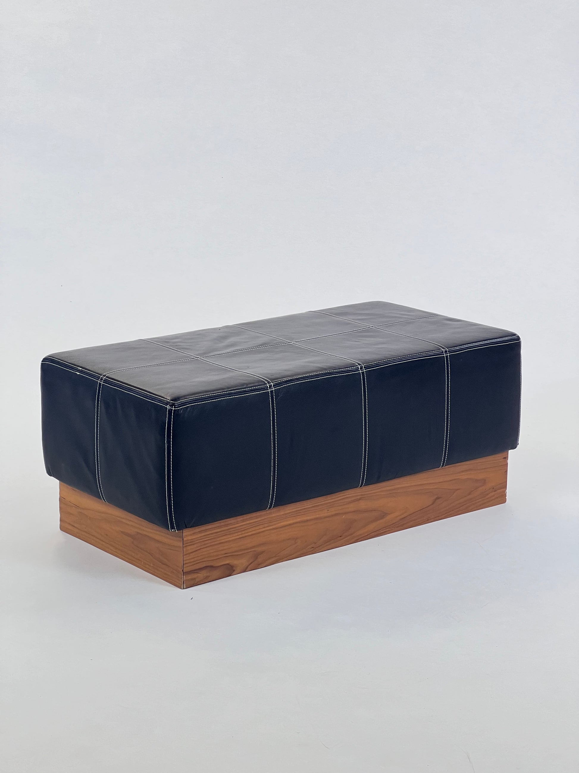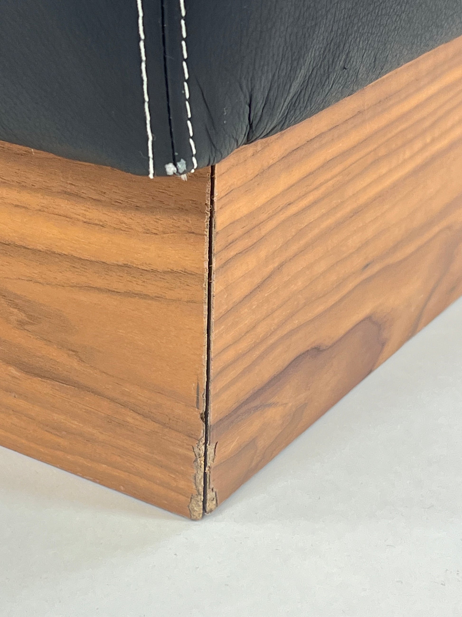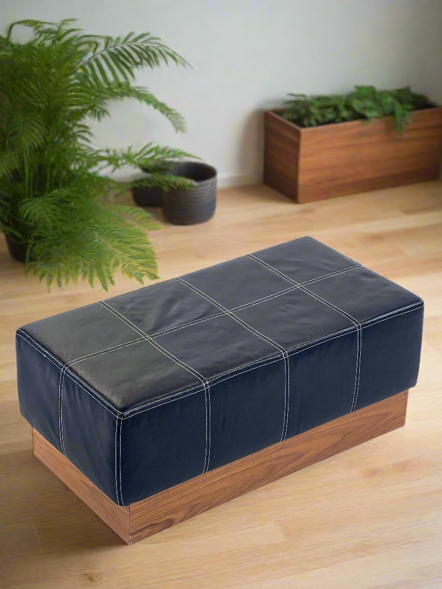 - Polstring: Bænken er betrukket med sort læder, der giver en glat og sofistikeret overflade. Læderet er udført i et kvadratisk mønster med kontrastsyninger, der tilføjer en ekstra dimension af elegance og raffinement til designet.