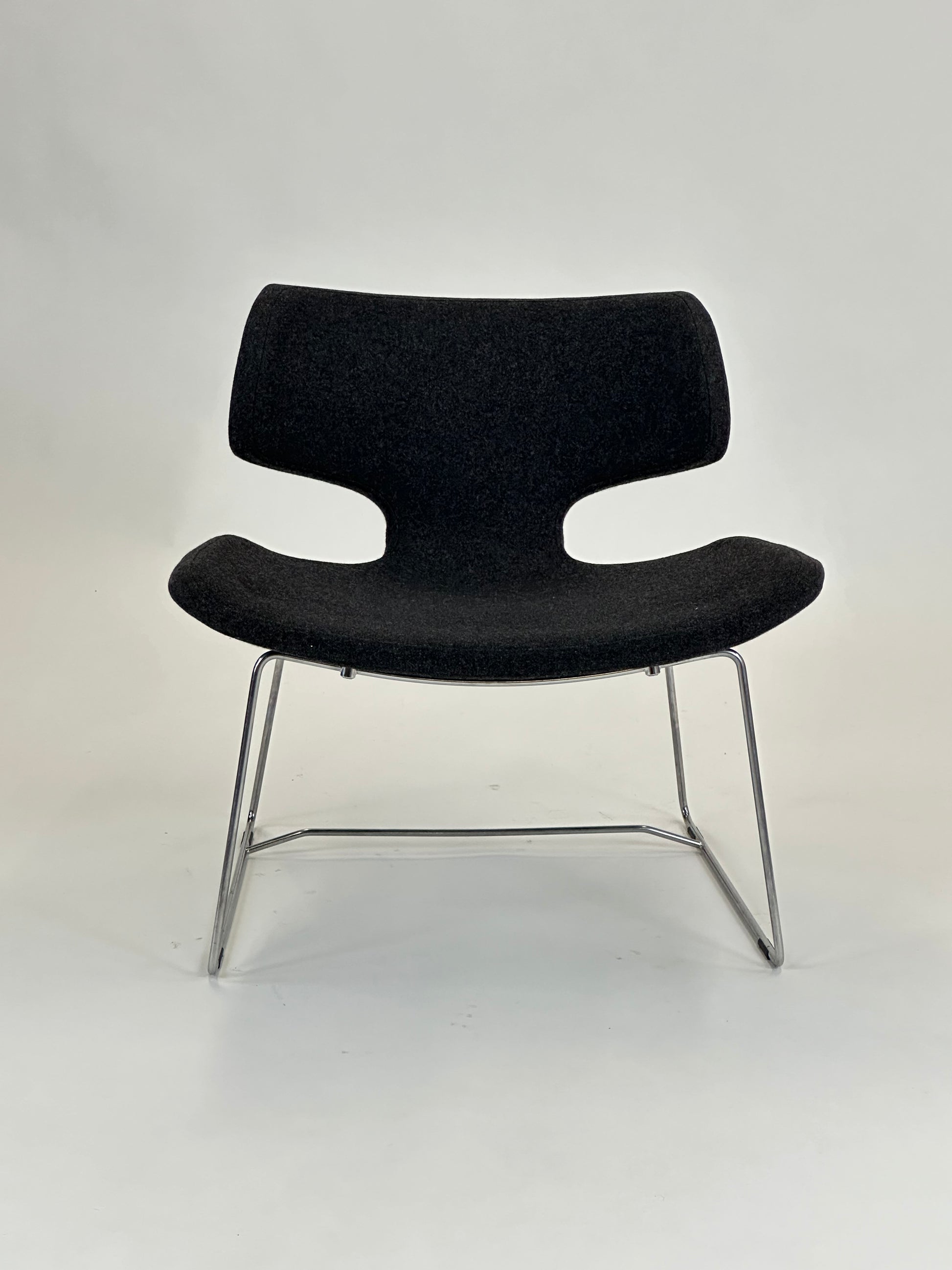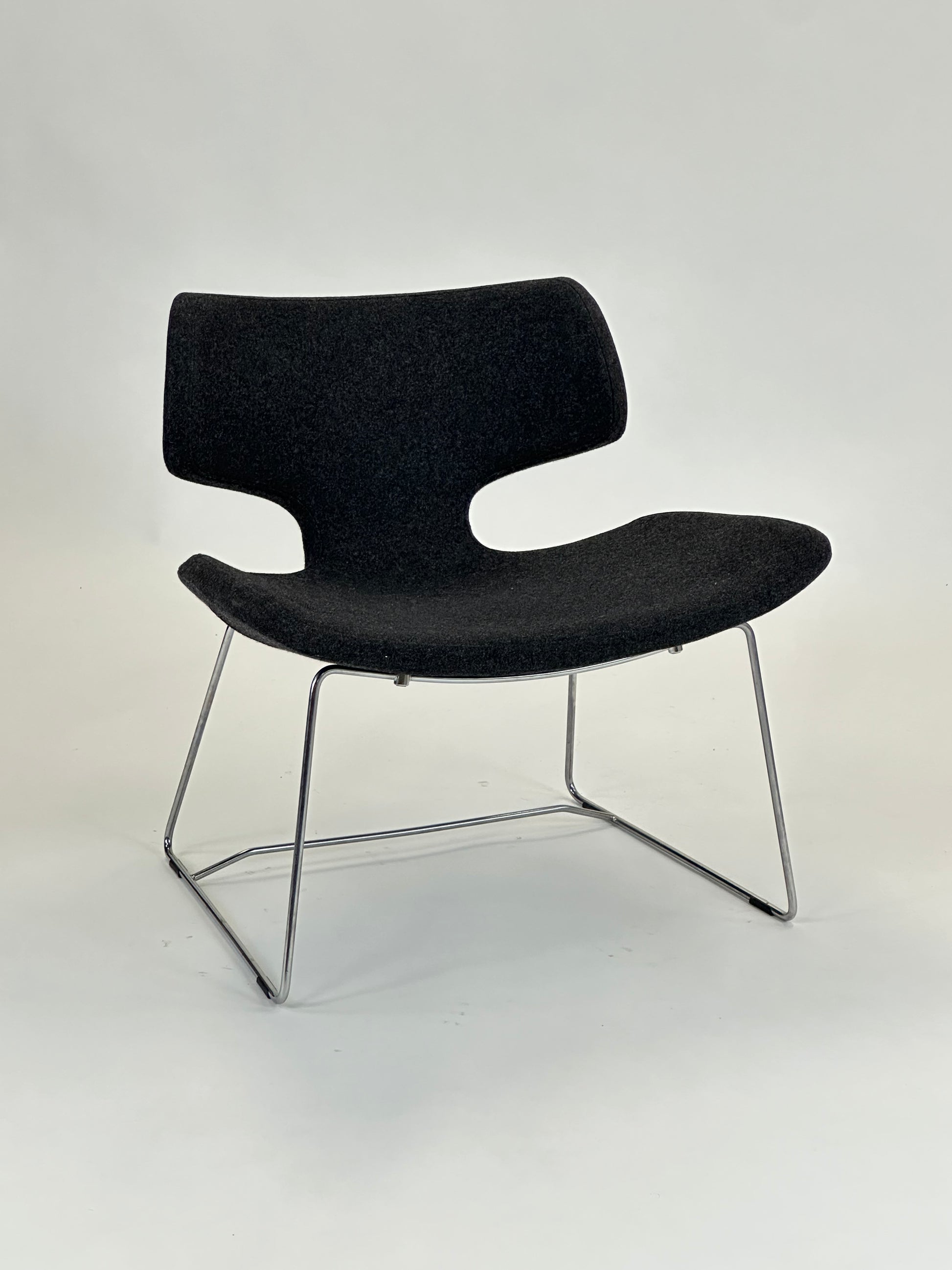 Stolen er polstret i sort slidstærkt tekstil, der giver en behagelig siddeoplevelse, mens den åbne ryglænskonstruktion tilfører designet et unikt og iøjnefaldende præg. Stellet i krombelagt stål giver stolen et let, svævende udtryk og sikrer samtidig stabilitet og holdbarhed.