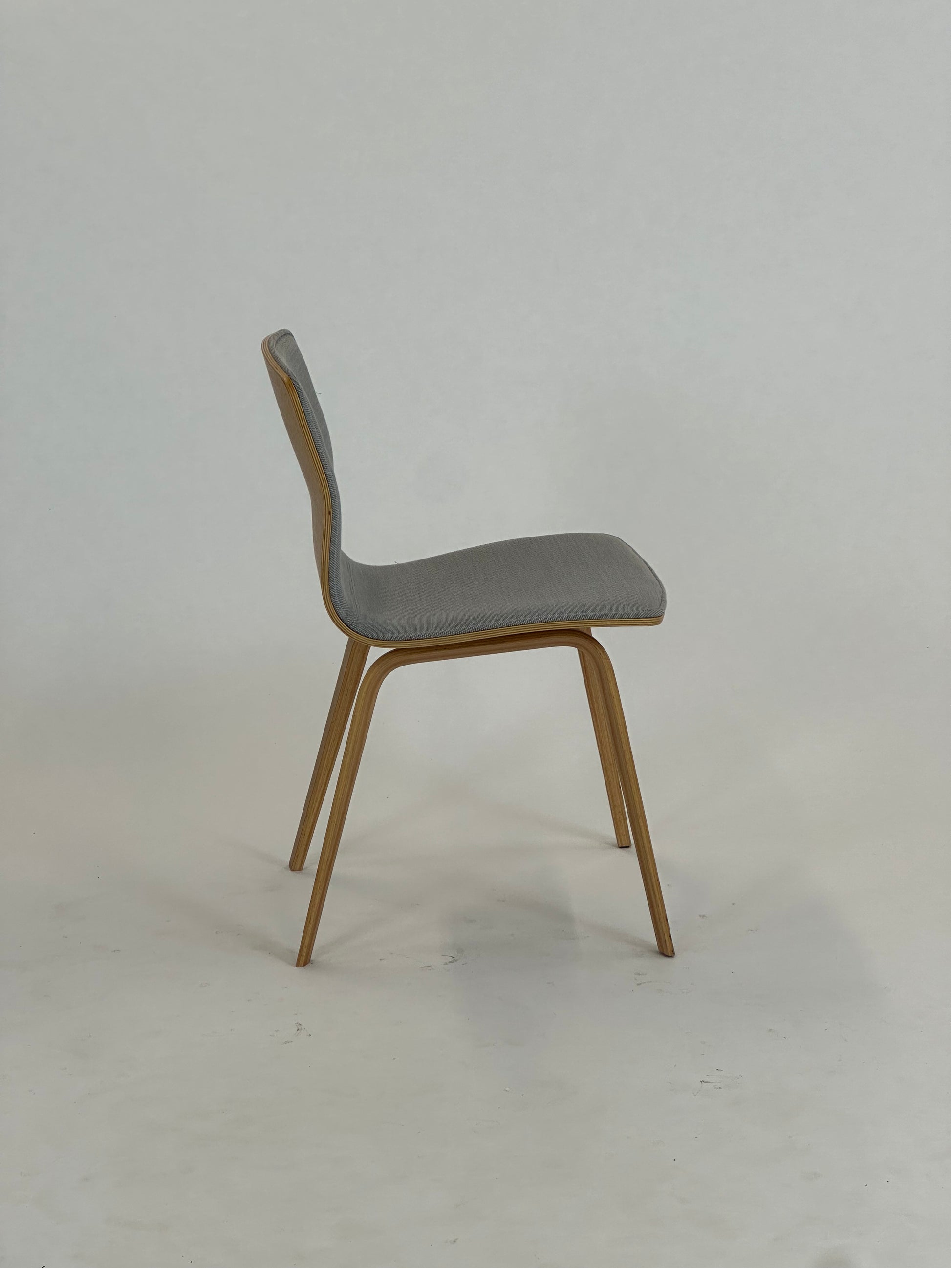 - Farve: Stolen er polstret i en let grå nuance, der giver et klassisk og roligt udtryk.