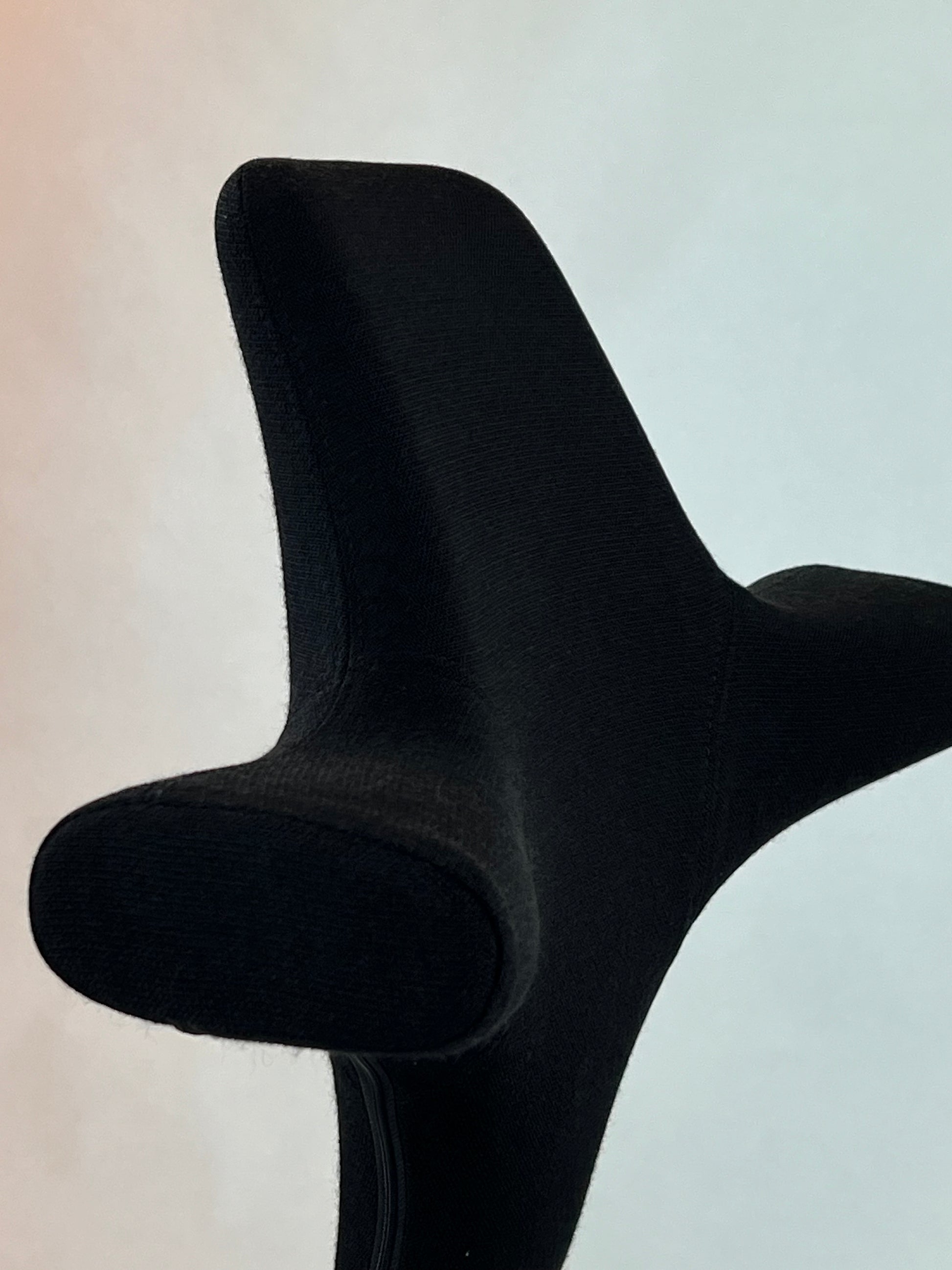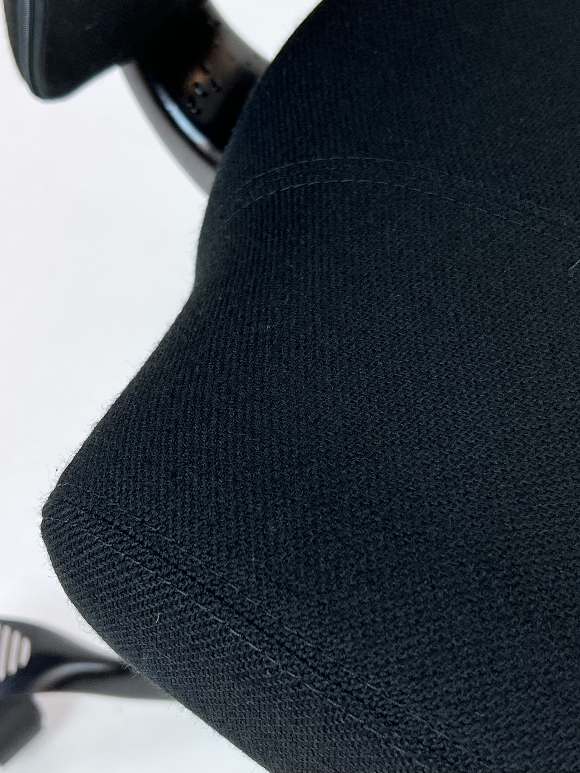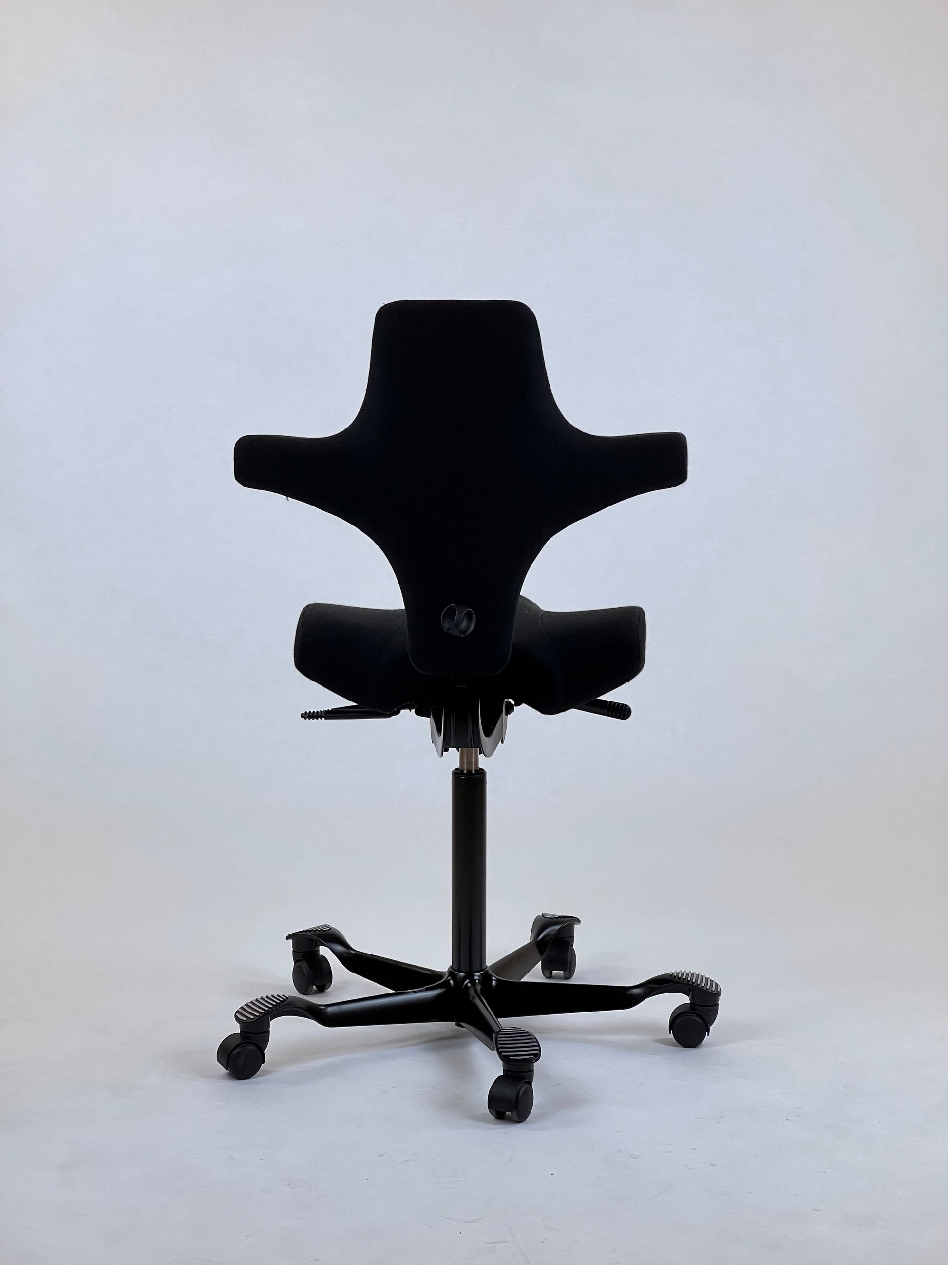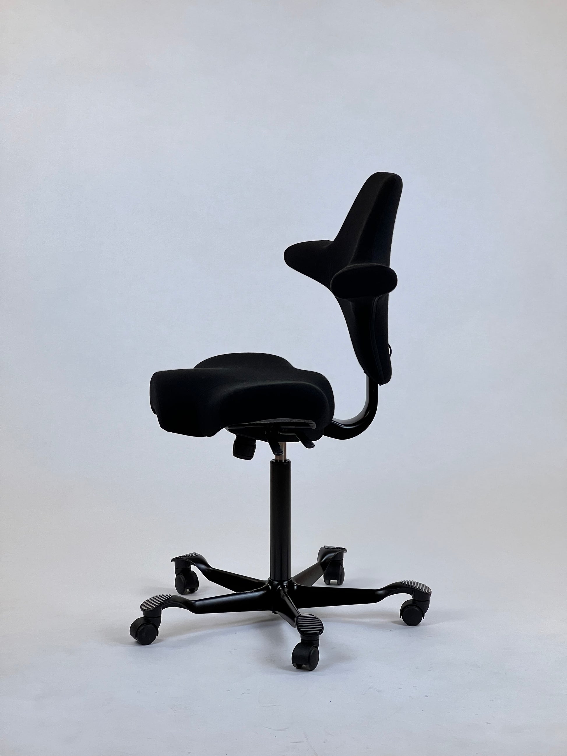 - Sæde og Ryglæn: Stolen er betrukket med et friskt sort stof, der føles elegant og rart, samtidig med at det er slidstærkt og nemt at vedligeholde. Sadelsædet giver en åben hoftevinkel, der fremmer en sund kropsholdning.