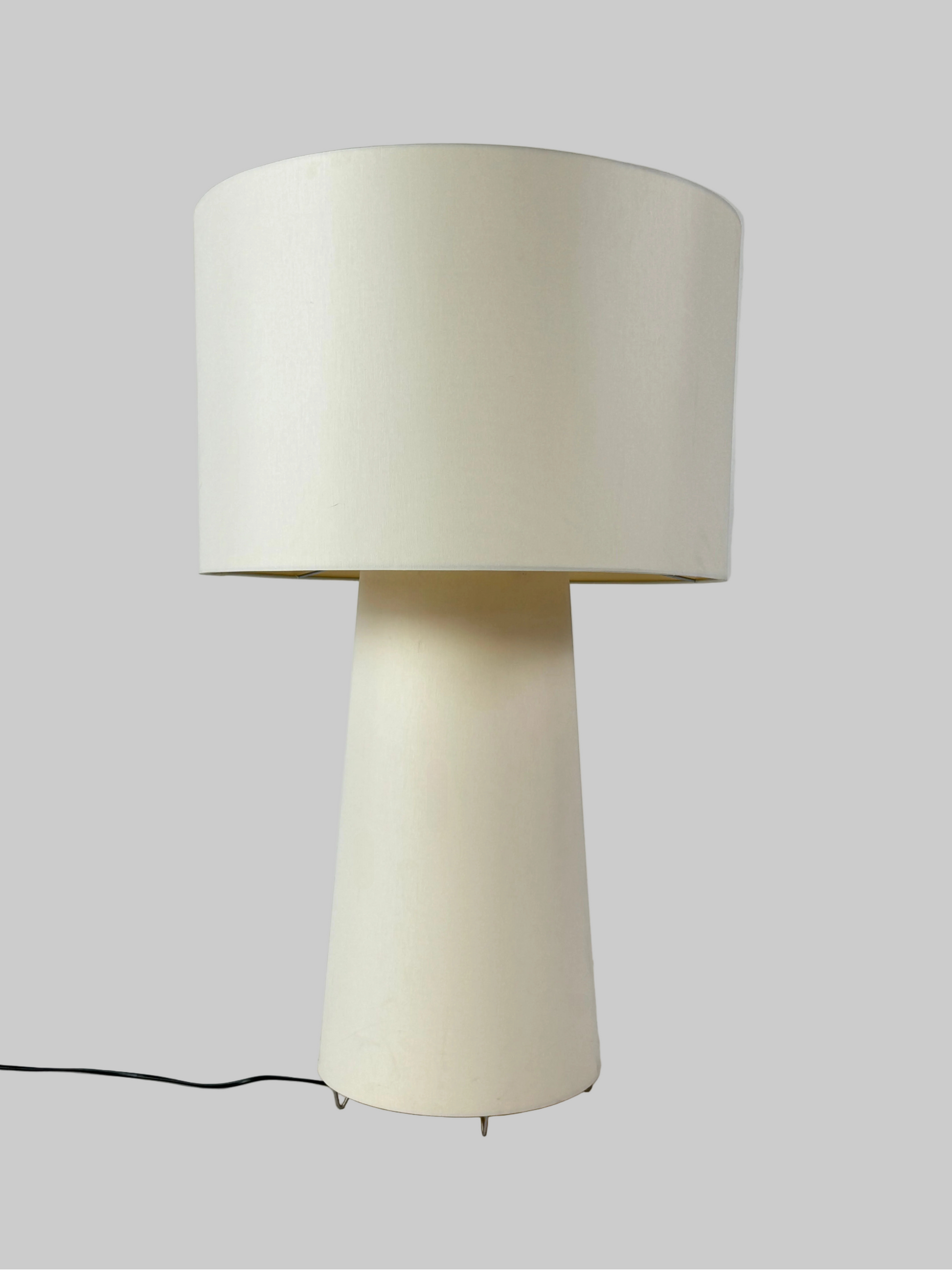 Lampen er udført i et ensartet hvidt materiale, som giver et diffust og behageligt lys, der spreder sig jævnt i rummet. Den cylindriske skærm og koniske fod skaber en elegant silhuet, der fungerer både som lyskilde og dekorativt element. Med en højde på 90 cm egner lampen sig perfekt til loungeområder, kontormiljøer eller receptioner, hvor der ønskes en varm og indbydende atmosfære.