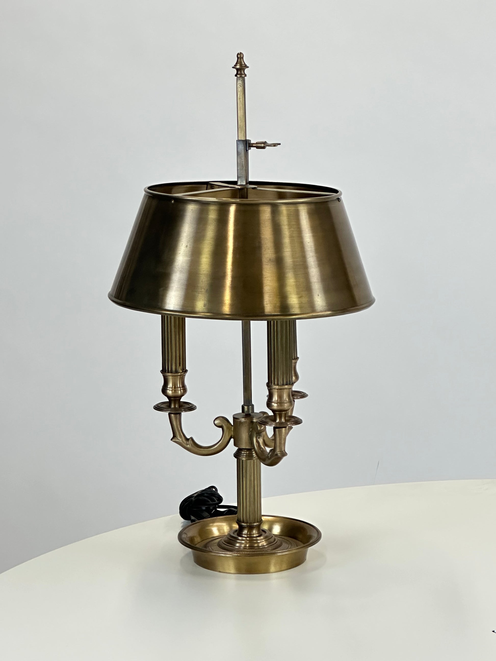Med sin kraftige fod, detaljerige formgivning og patinerede finish er lampen ikke blot en lyskilde, men et stykke funktionelt kunsthåndværk, der tilfører rummet en unik karakter. Den brede lampeskærm bidrager til et blødt og behageligt lys – ideelt til skriveborde, kommoder eller som stemningsfuld belysning i loungeområder.