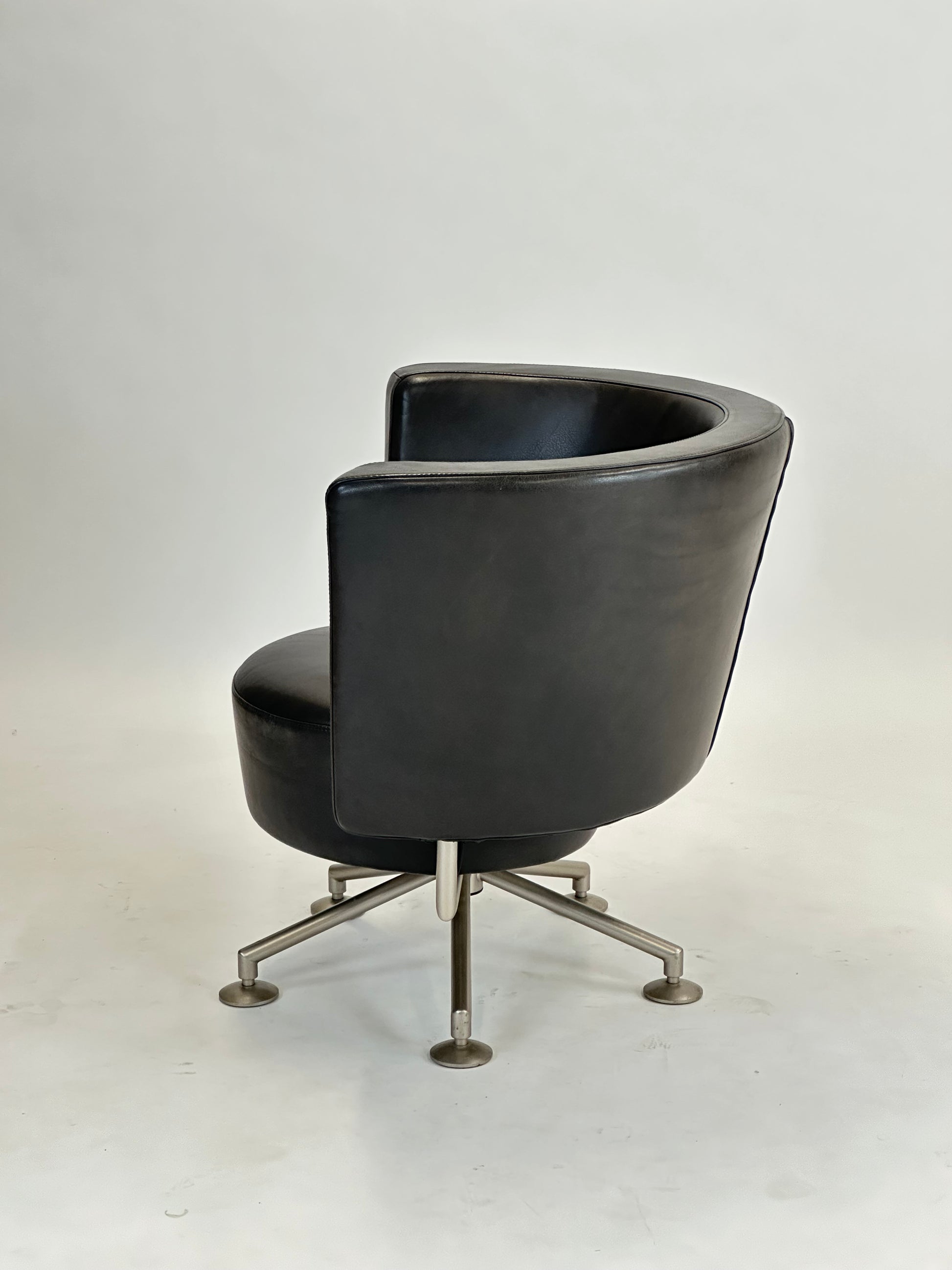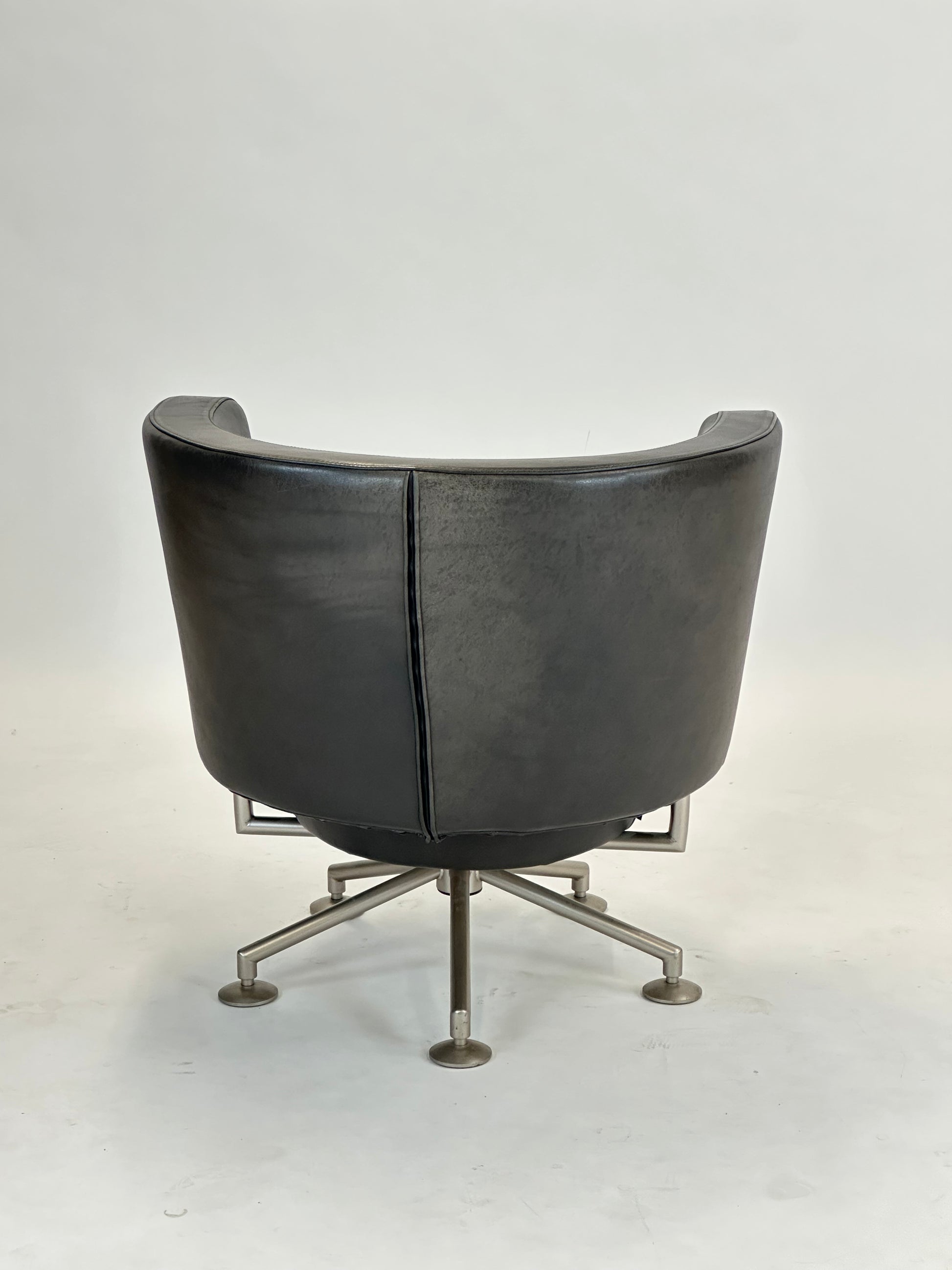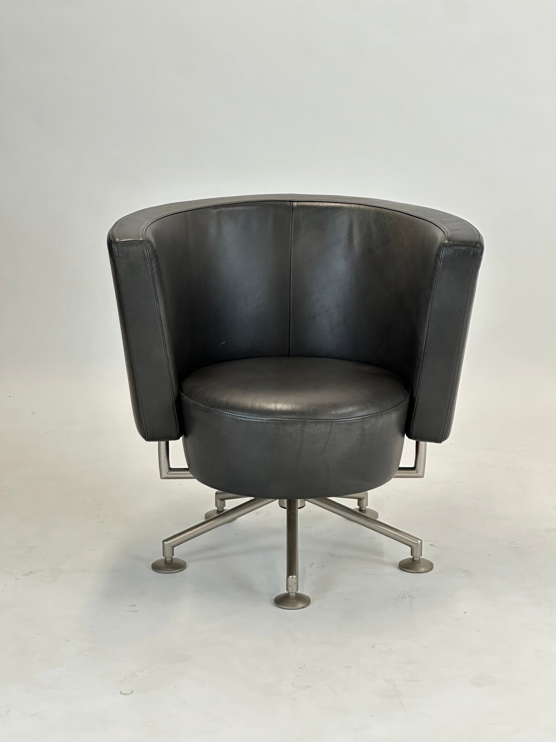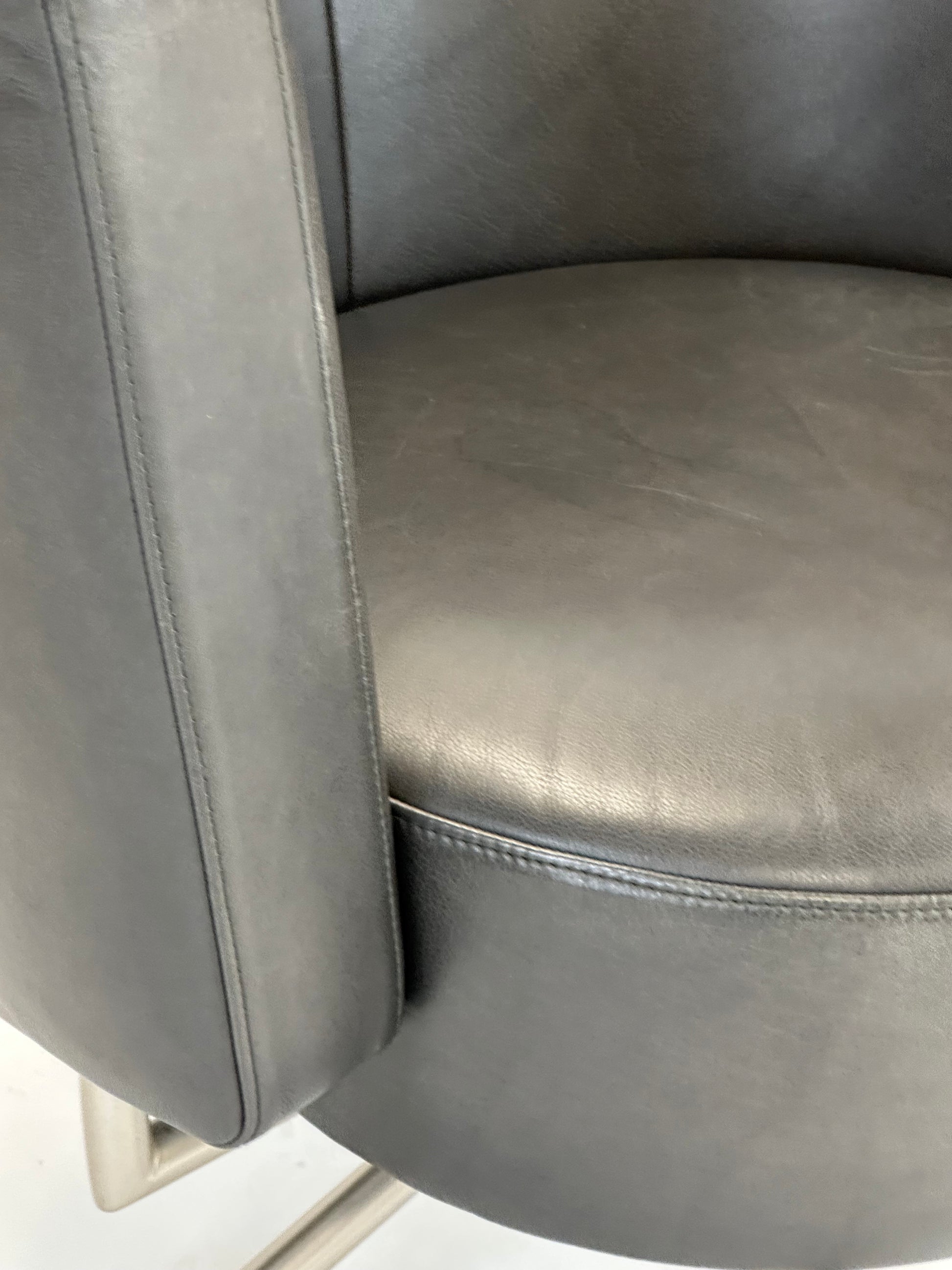 Stolen er betrukket med slidstærkt sort læder, som giver et elegant og tidløst udtryk. Det solide drejestel i børstet stål tilfører en moderne industriel kant og gør det nemt at orientere sig i rummet uden at rejse sig. Den runde sædehynde og det polstrede ryglæn sikrer høj siddekomfort – også ved længere ophold.