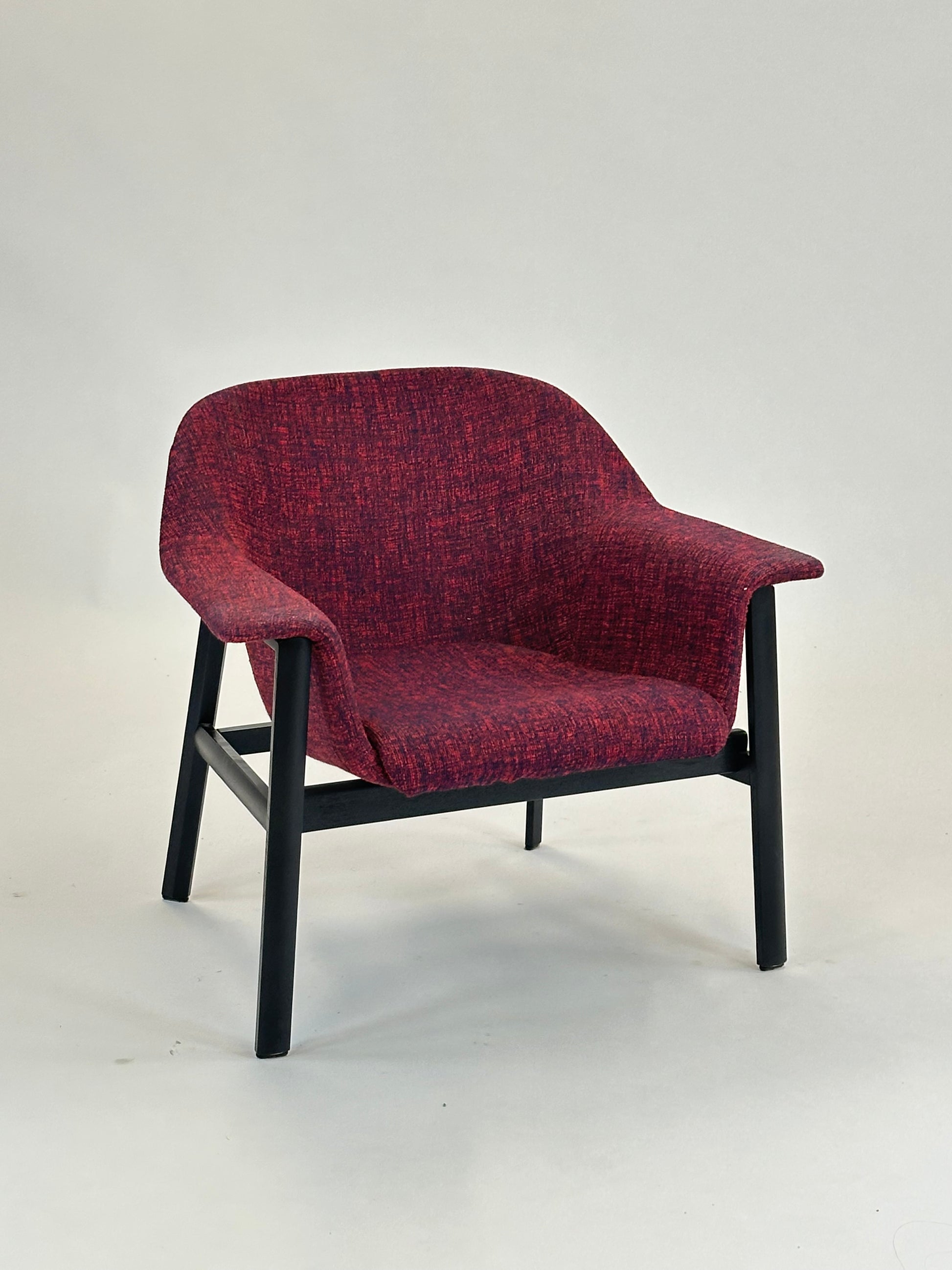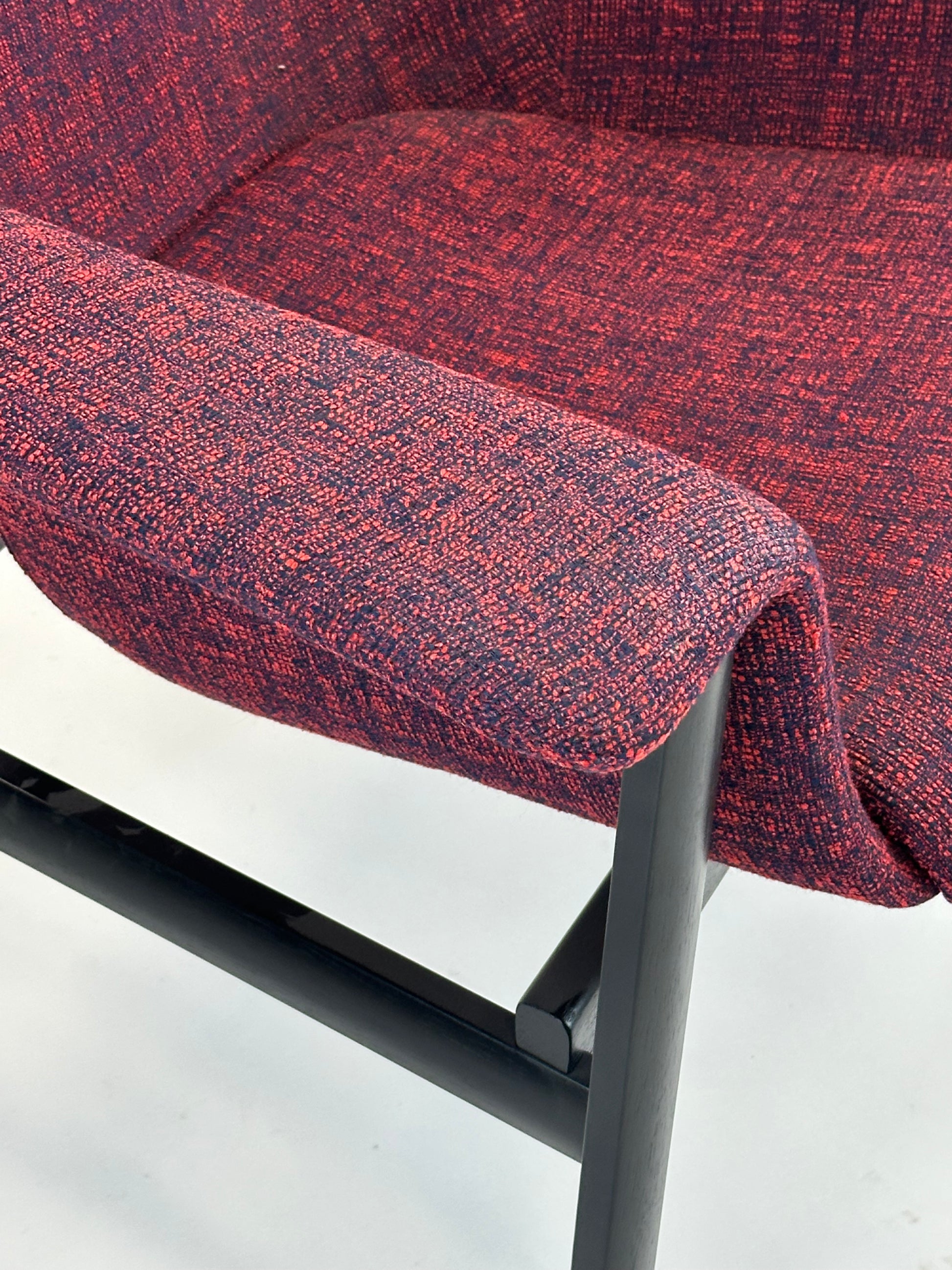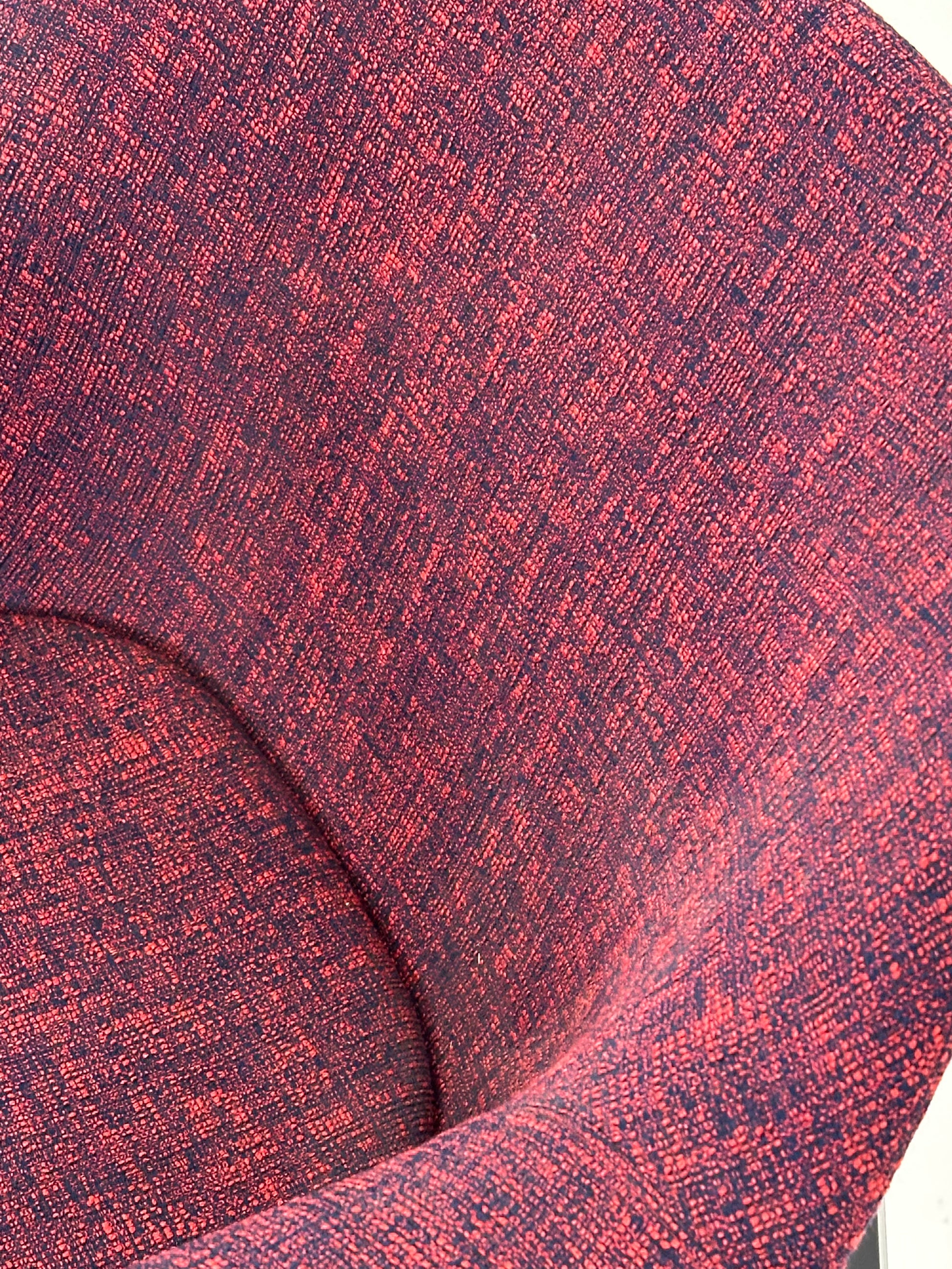 Stolen er polstret i et rødmelé tekstil, der giver et varmt og dynamisk udtryk, mens det solide stel i sortlakeret træ tilfører et moderne og eksklusivt præg. Den brede og blødt polstrede sædeflade sammen med det omsluttende ryglæn sikrer en behagelig siddeoplevelse, selv under længere ophold.