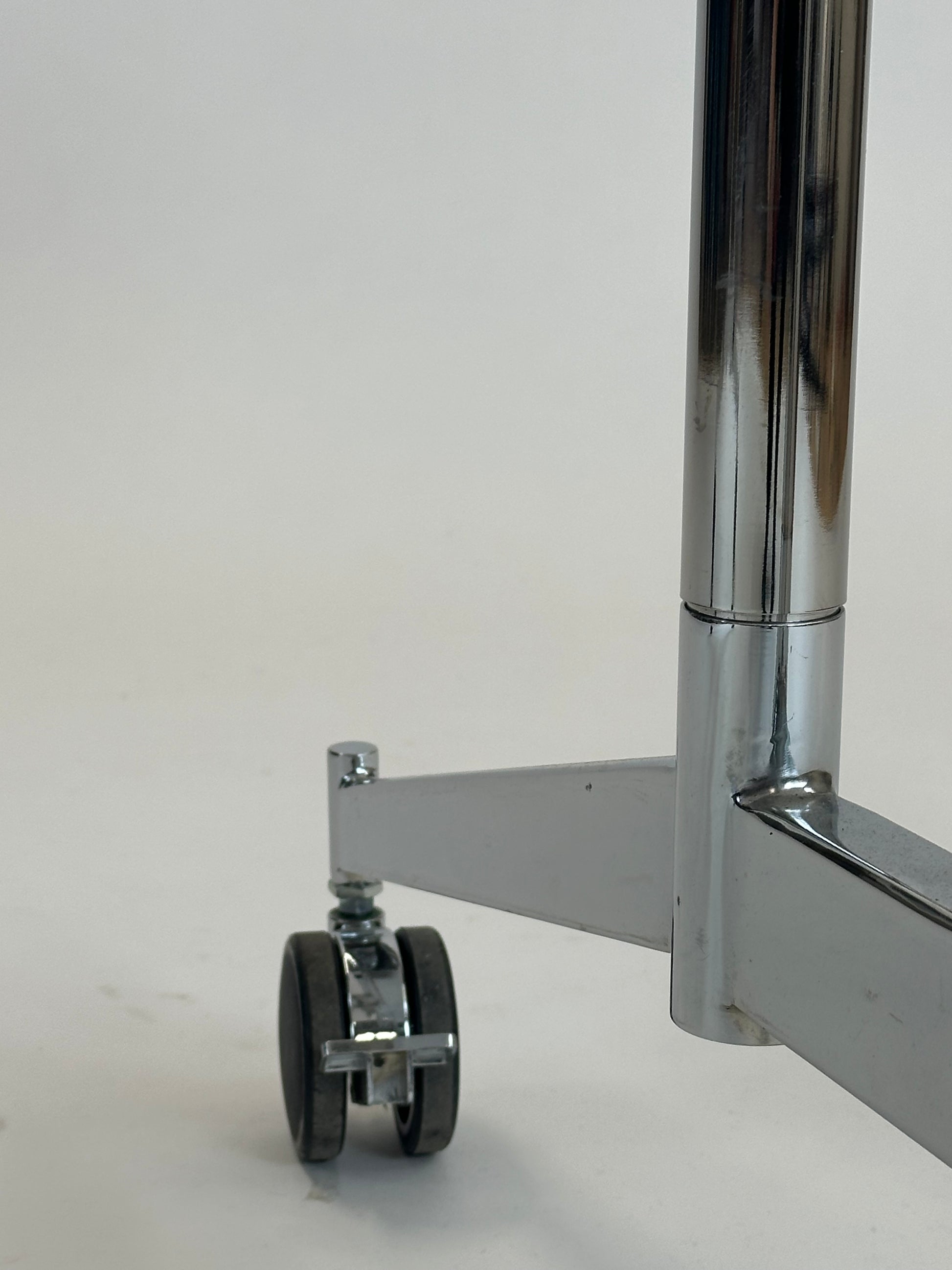 Bordpladen er udført i hvid med en stilren og let profil, der giver et professionelt og minimalistisk look. Stellet i forkromet stål er monteret på hjul, hvilket gør bordet let at flytte og tilpasse efter behov. Denne kombination af mobilitet og stabilitet gør Contact-bordet til en praktisk løsning, når indretningen skal være dynamisk og fleksibel.