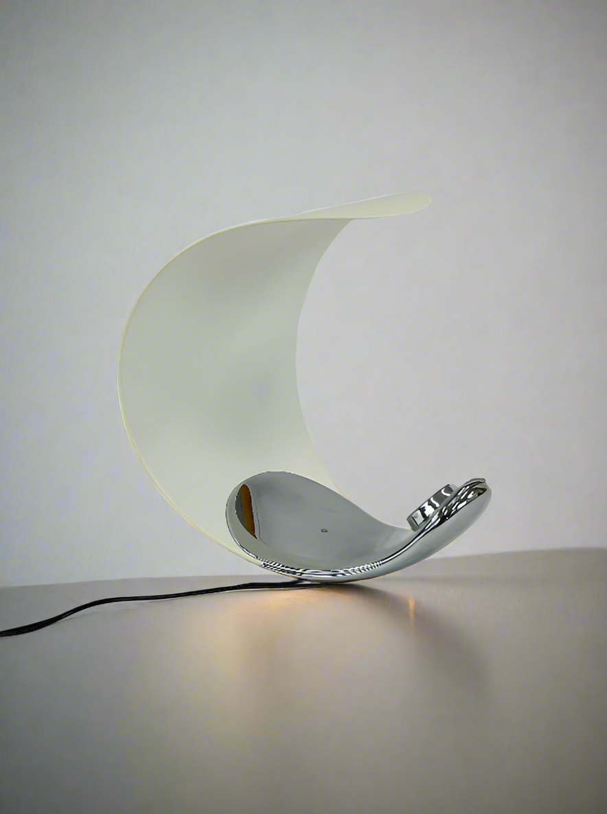 D76 Curl bordlampen fra Luceplan er et unikt bud på moderne belysning, hvor form og funktion smelter sammen i en poetisk helhed. Med sin flydende, skulpturelle silhuet og indirekte lys skaber lampen en varm og behagelig atmosfære, perfekt til både kontor- og boligindretning.
