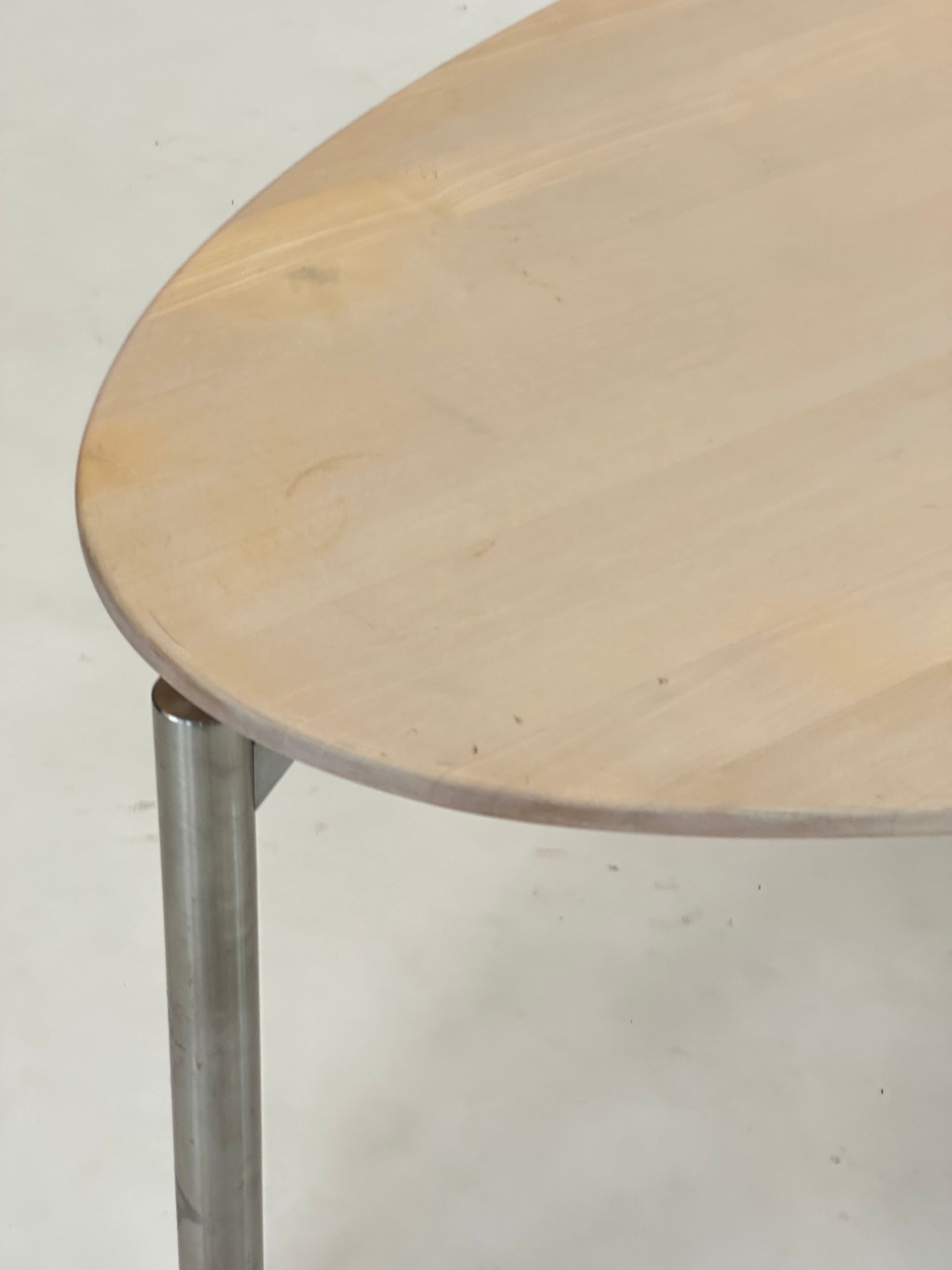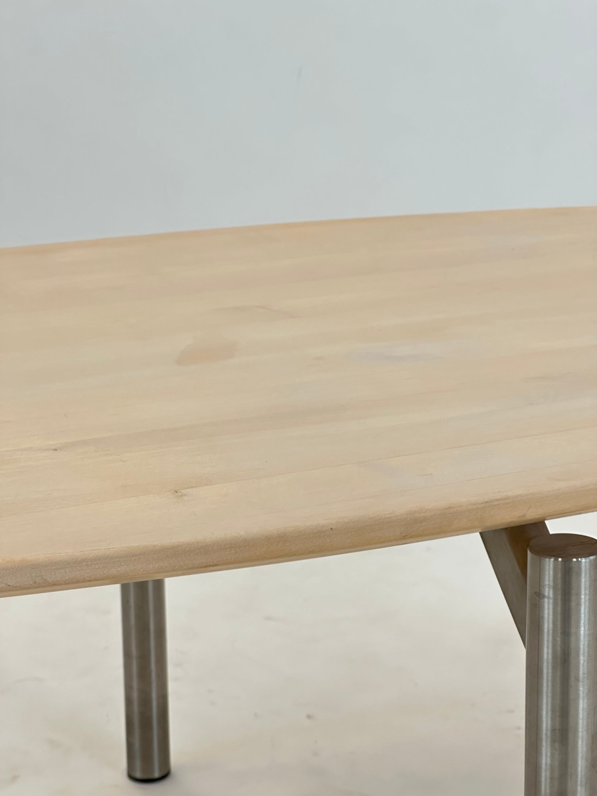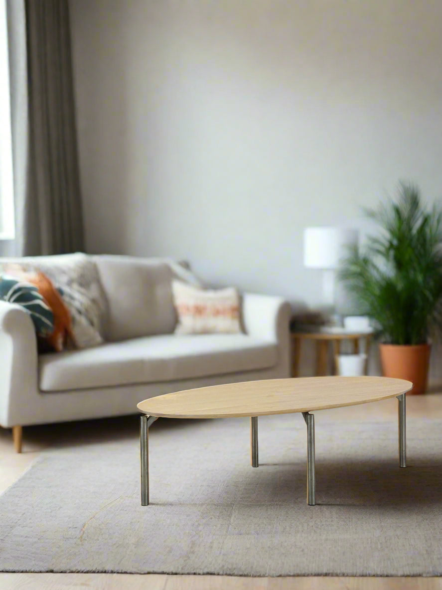 Dette sofabord kombinerer funktionalitet og æstetik i et tidløst design. Bordpladen er fremstillet i lyst træ med en smuk, oval form, der giver et blødt og organisk udtryk. De runde ben i børstet stål giver bordet et moderne og industrielt præg, samtidig med at de skaber en stabil og robust konstruktion.