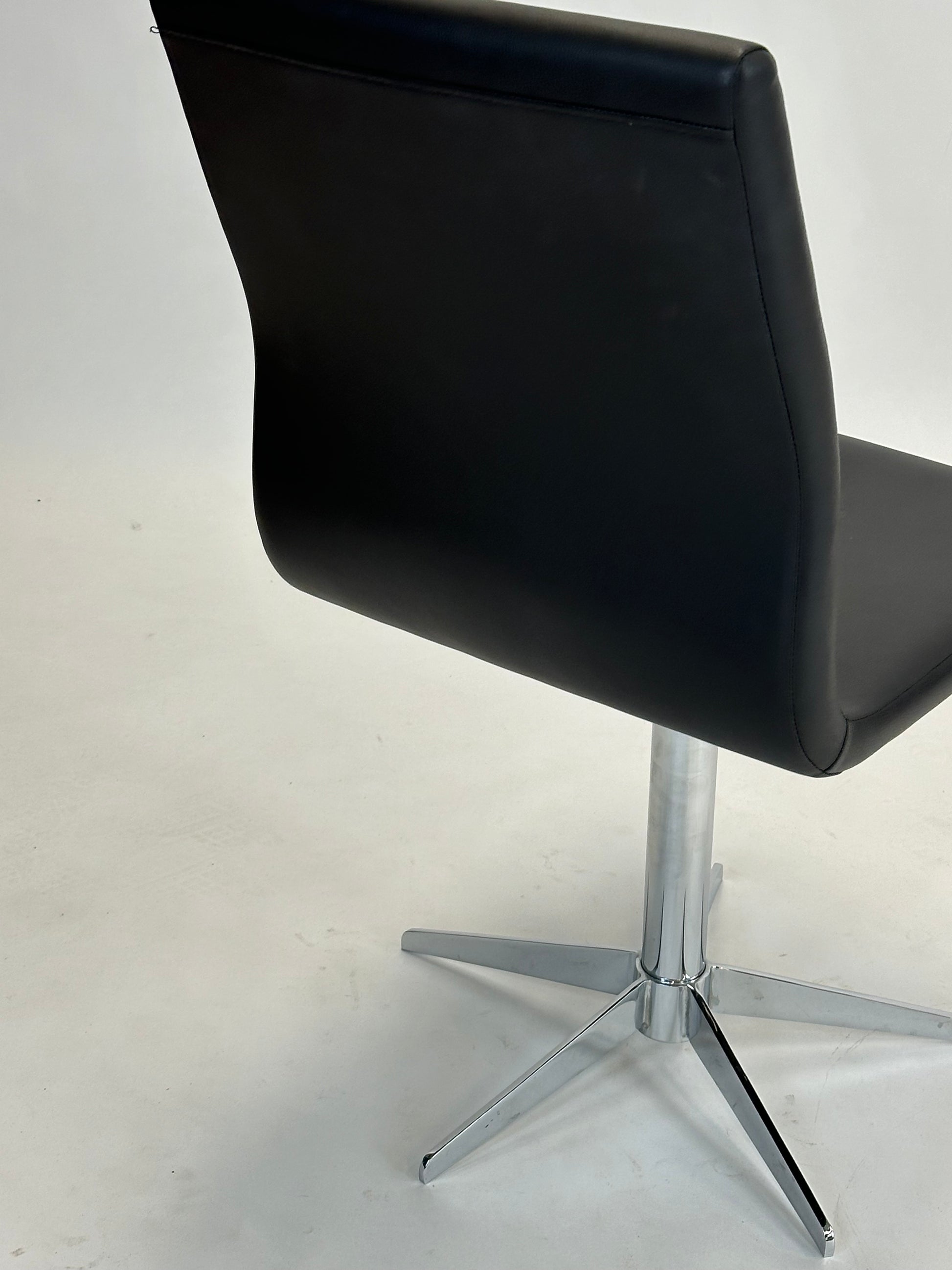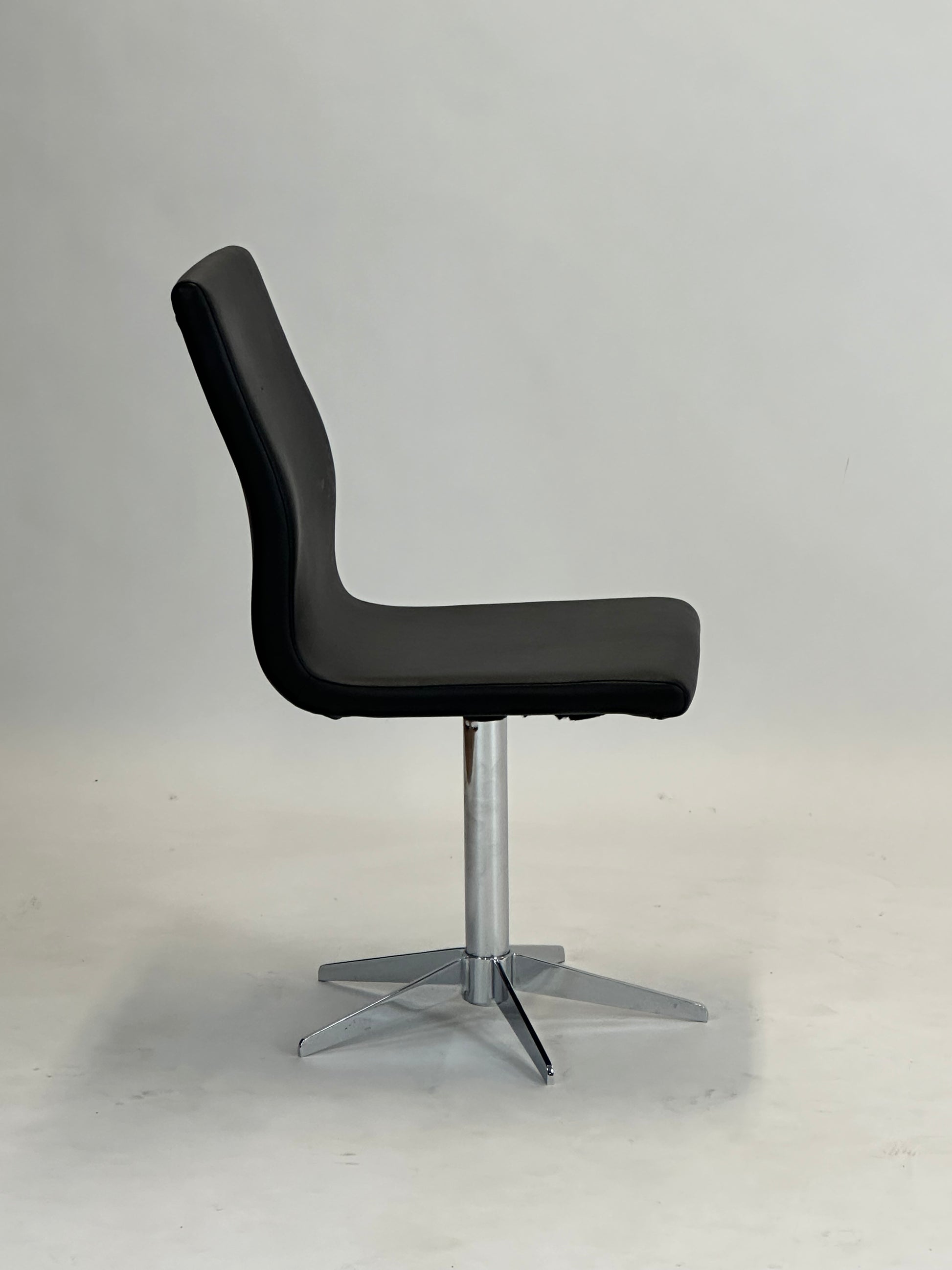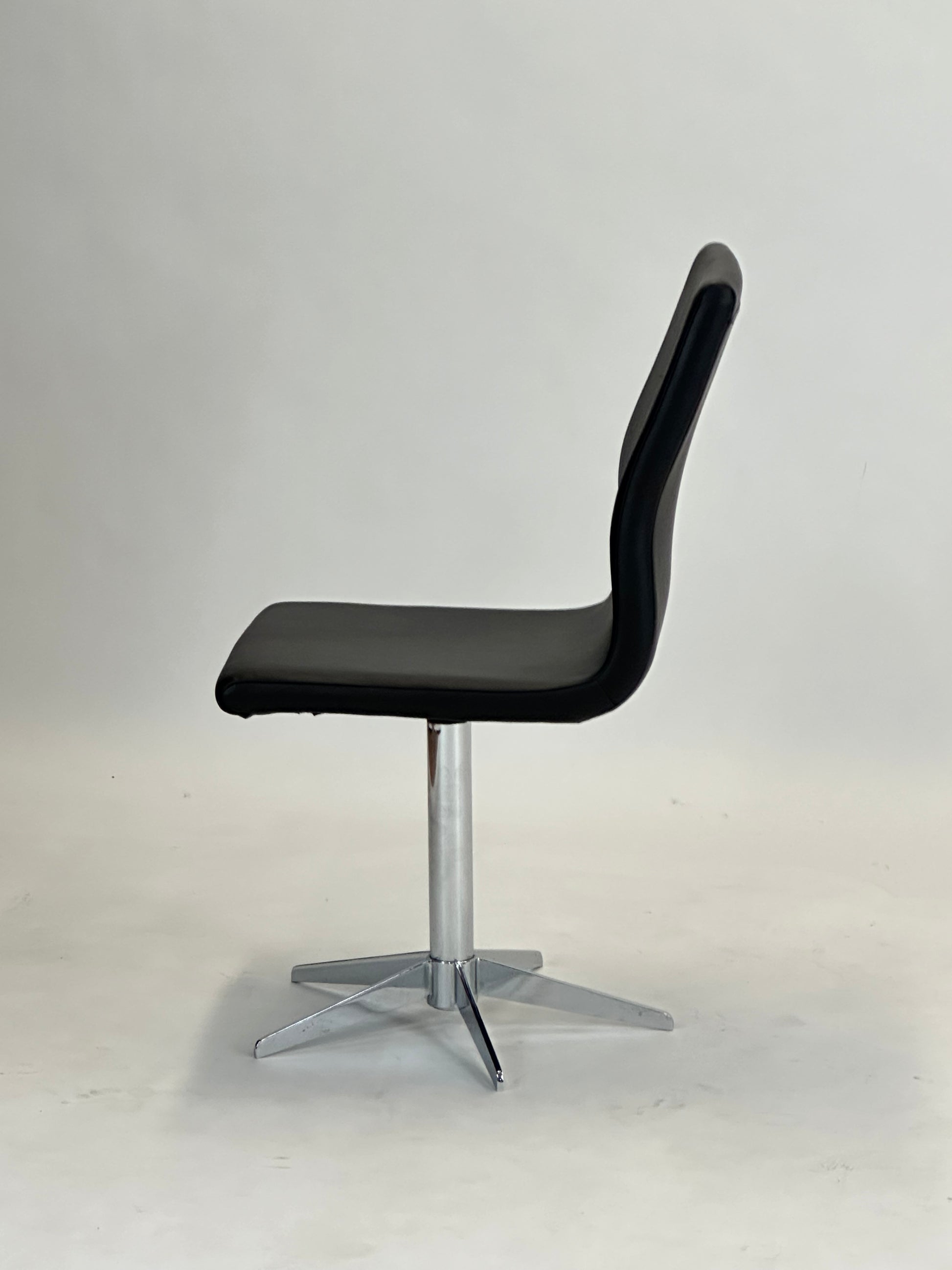 Stolen er monteret på en solid drejefod i forkromet metal, hvilket giver brugeren god bevægelsesfrihed og fleksibilitet uden at gå på kompromis med stabilitet. Designet er moderne og minimalistisk med rene linjer og høj siddekomfort – en ideel løsning til både formelle og afslappede arbejdsmiljøer.
