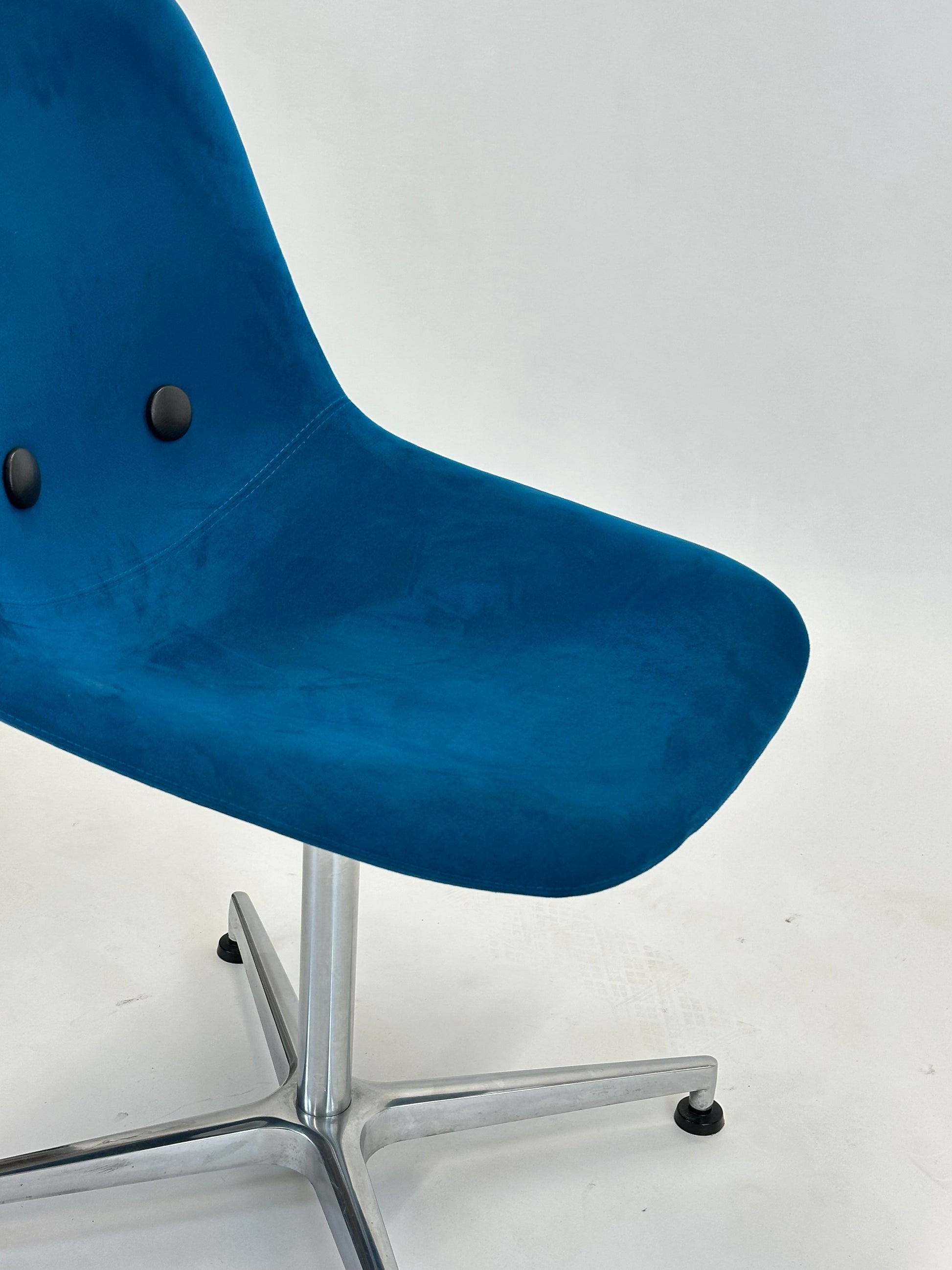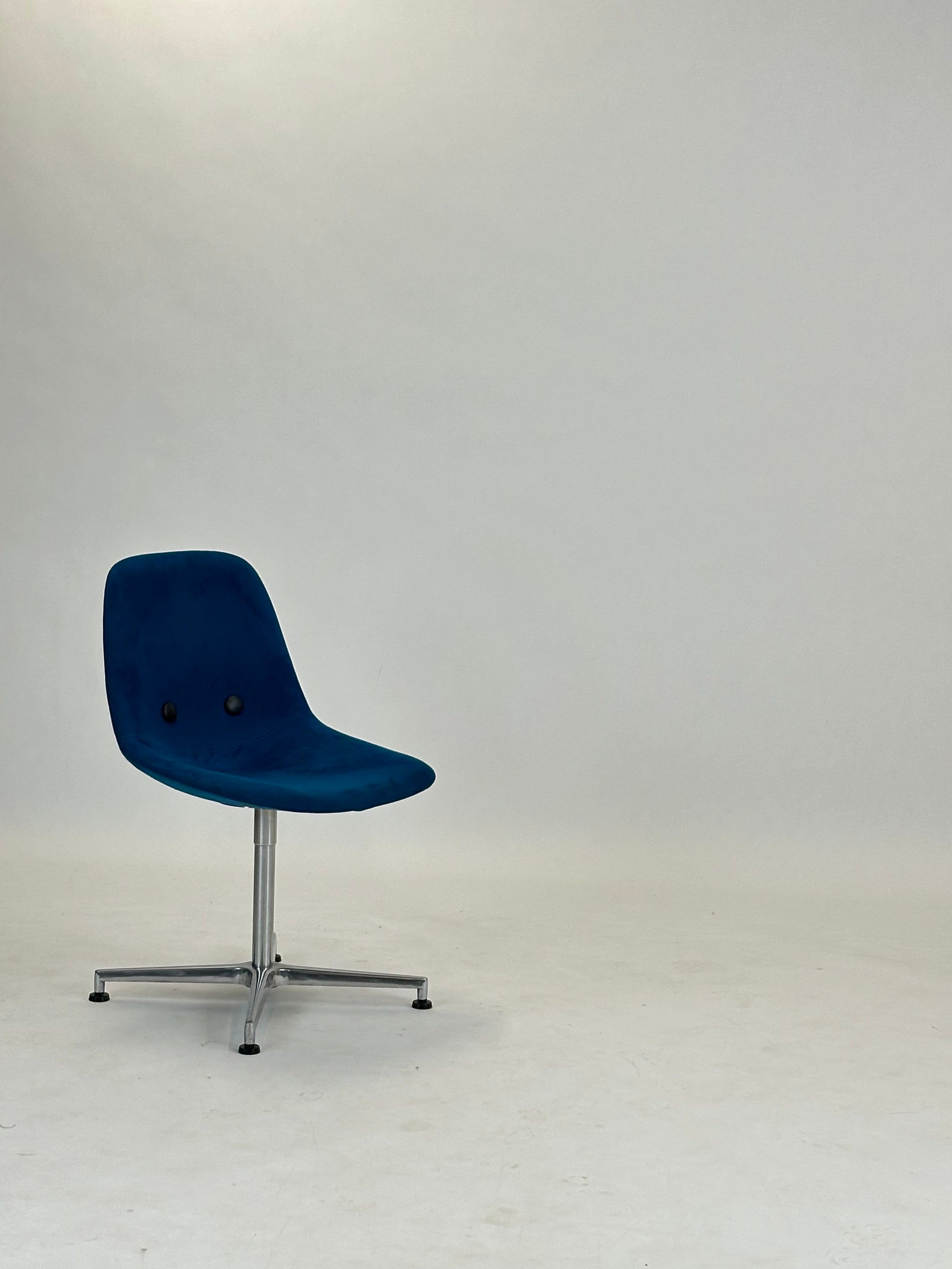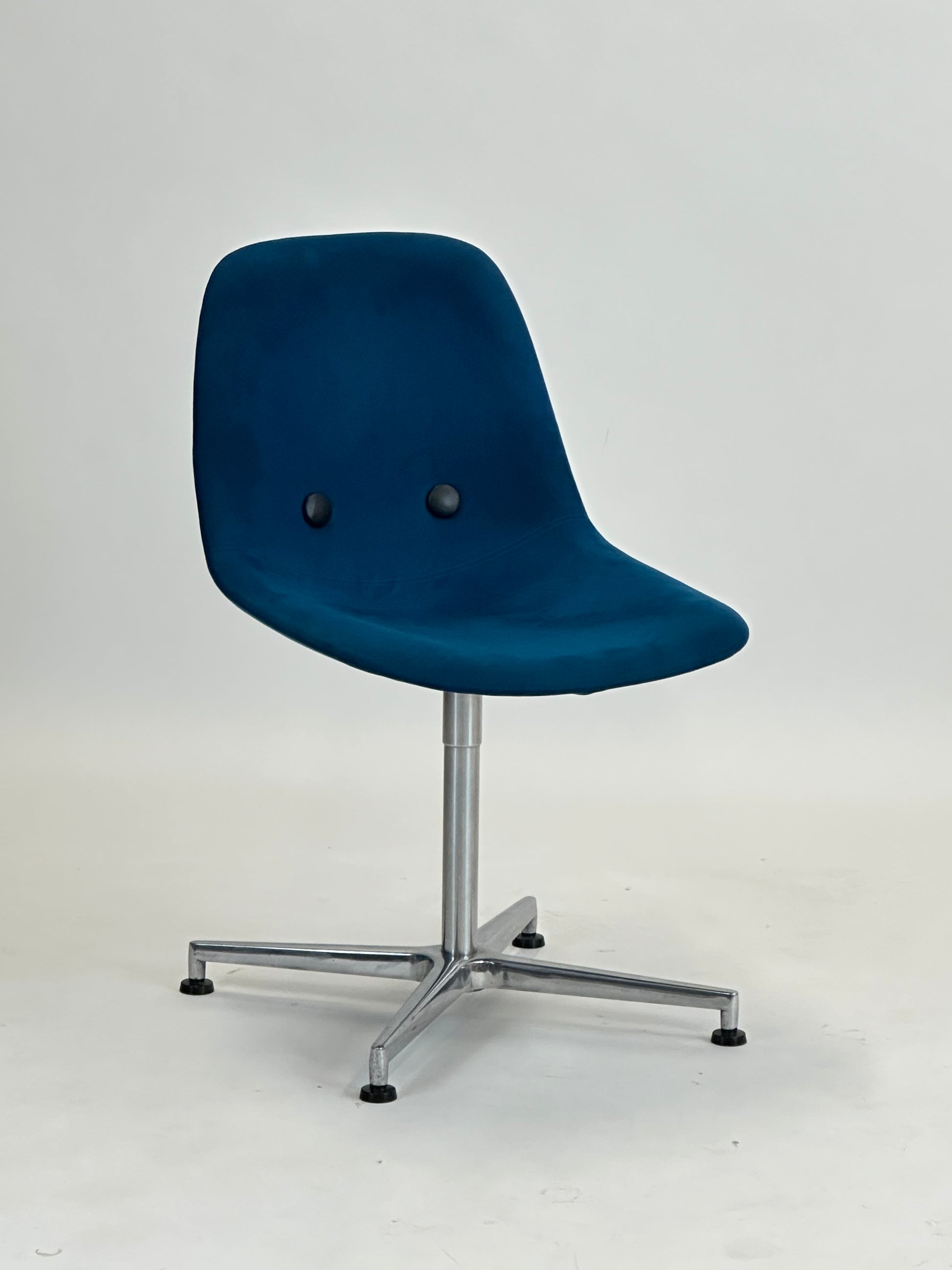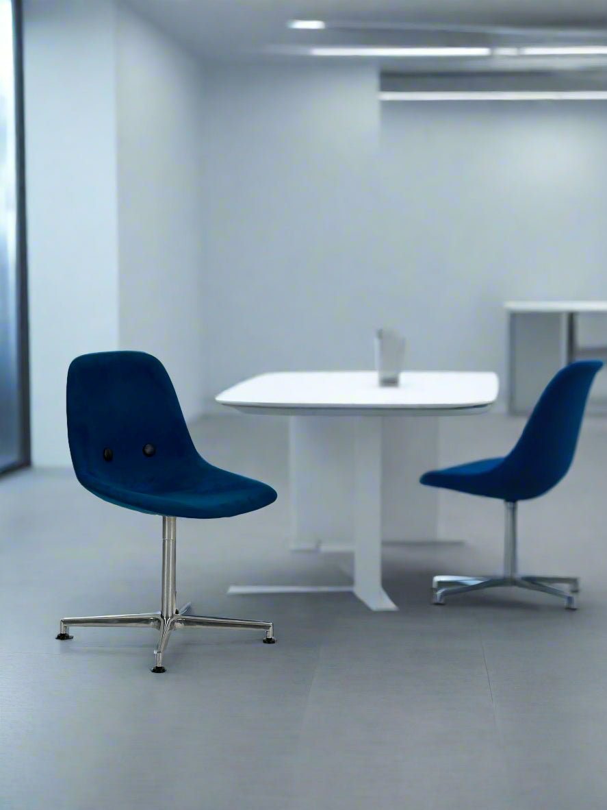 Stolens polstring er holdt i en dyb blå nuance, der tilfører rummet et raffineret farvespil uden at tage opmærksomheden fra omgivelserne. Det stabile firebenede stel i krom giver et stilrent udtryk og høj funktionalitet. Stolen er drejbar, hvilket gør den praktisk i brug og ideel til mødesituationer eller fleksible arbejdsstationer.