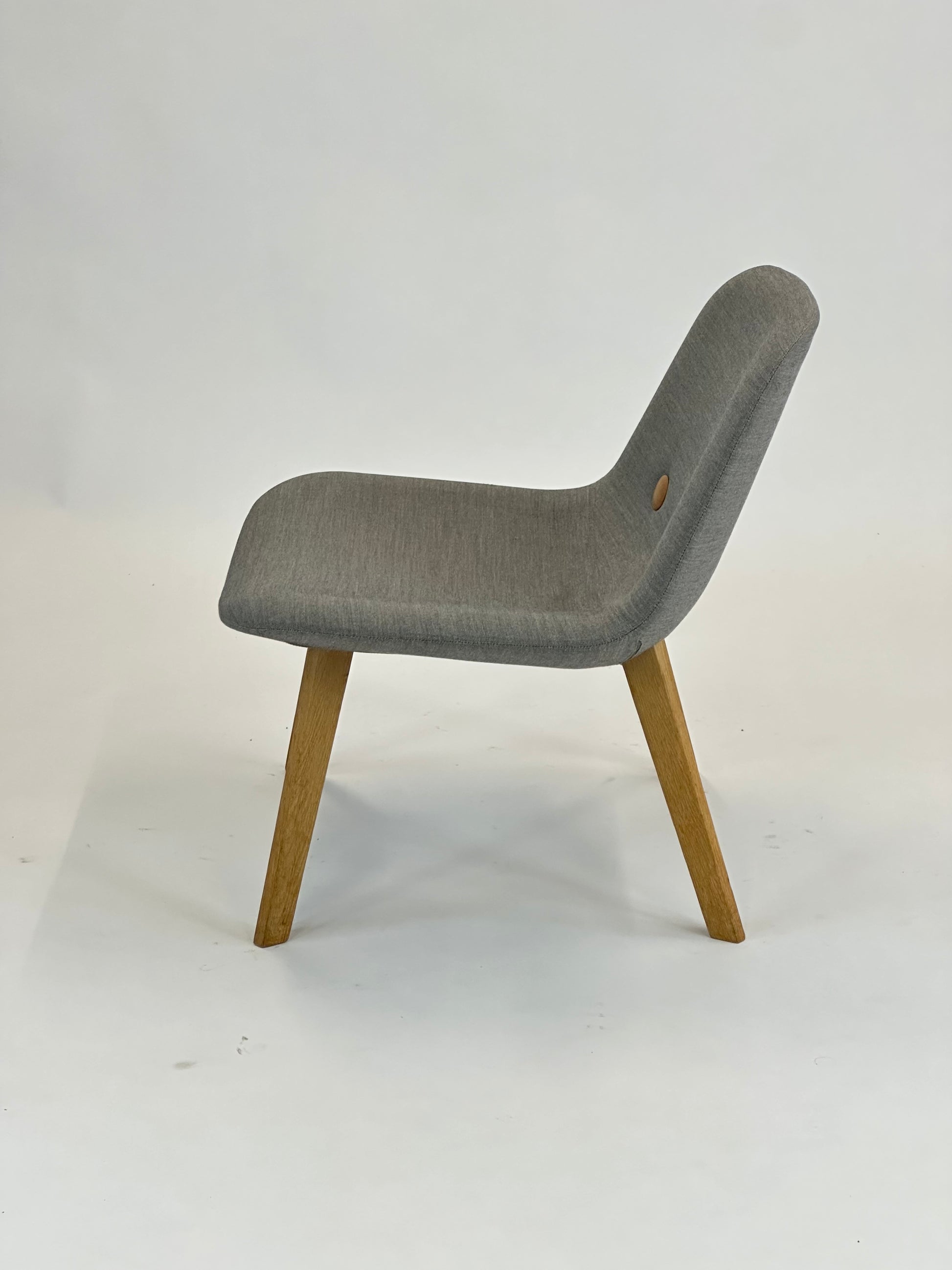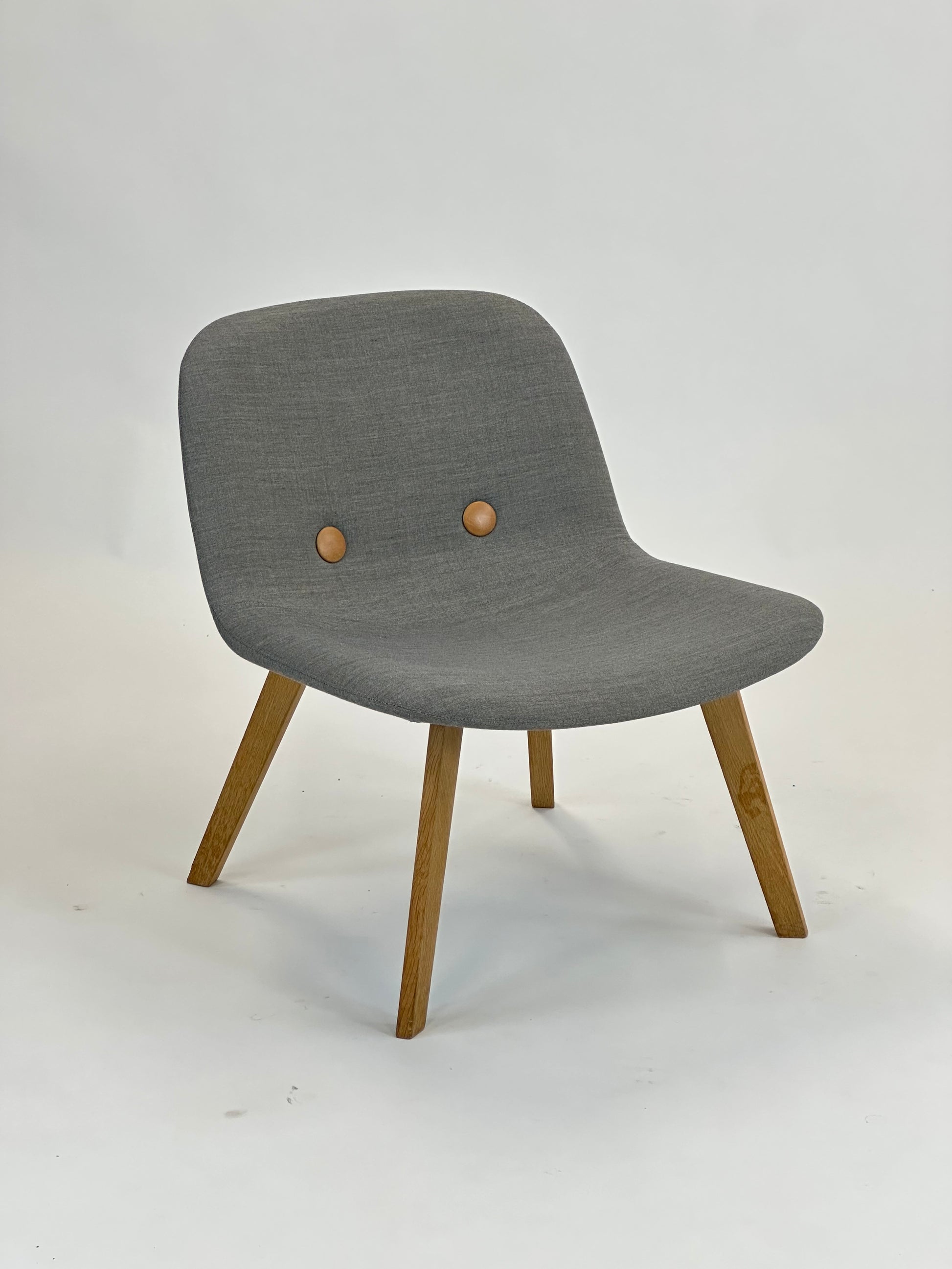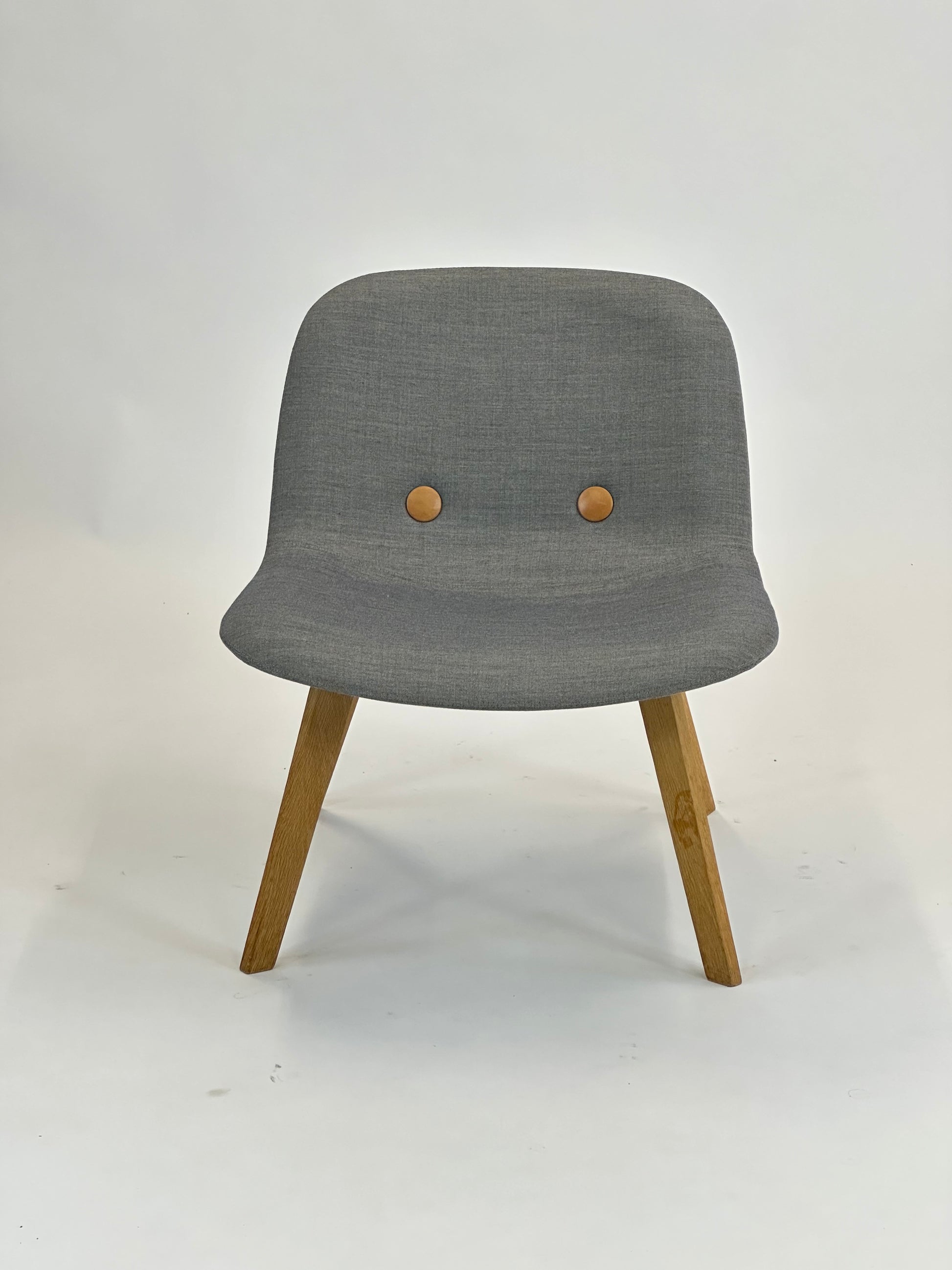 Stolen er polstret i slidstærkt gråt tekstil, der giver et elegant og tidløst look, mens de karakteristiske “øjne”-knapper på ryglænet tilfører designet et unikt og personligt præg. Stellet er udført i massivt egetræ, som giver varme og naturlighed til det samlede udtryk og sikrer en stabil og holdbar konstruktion.