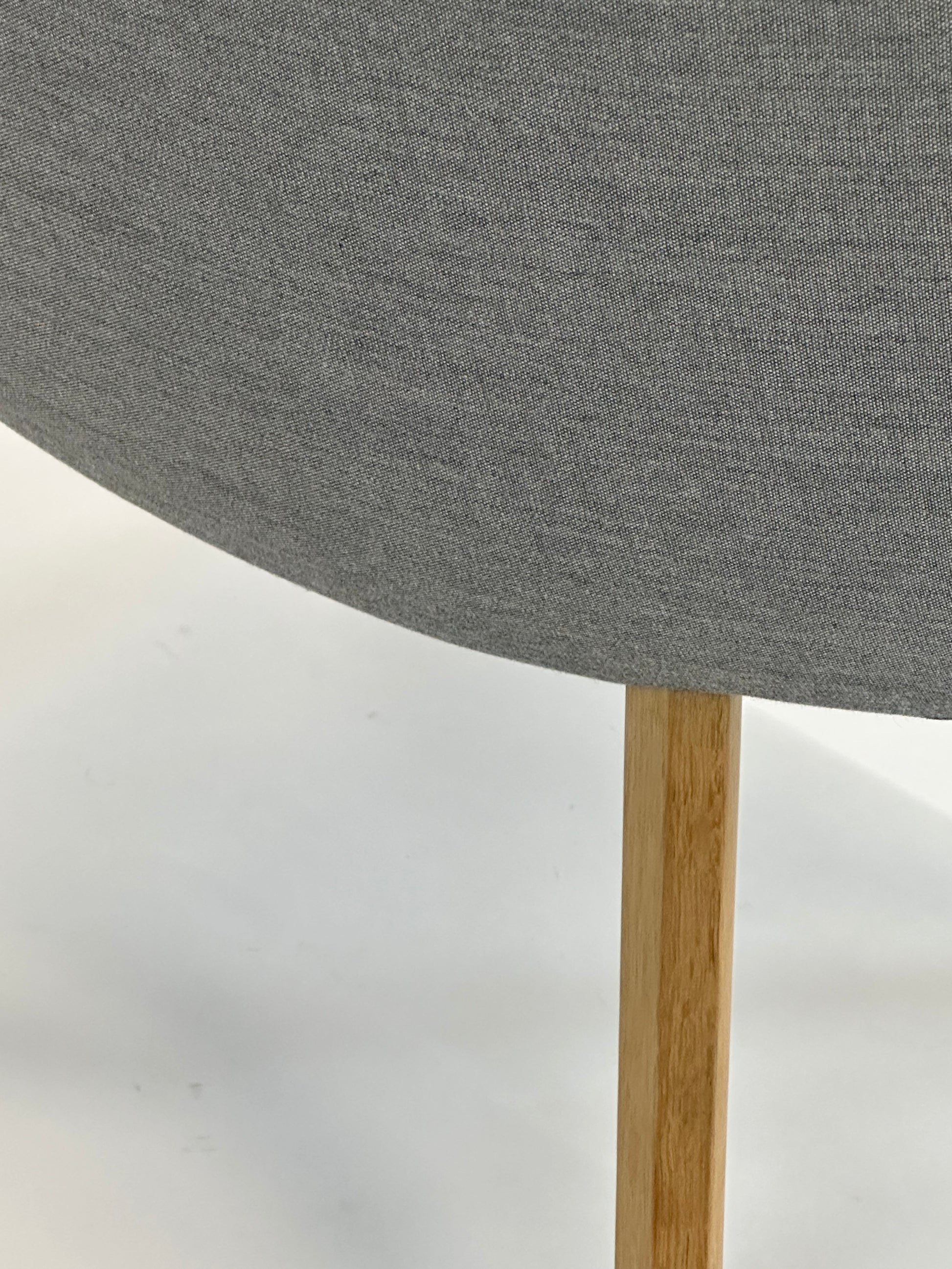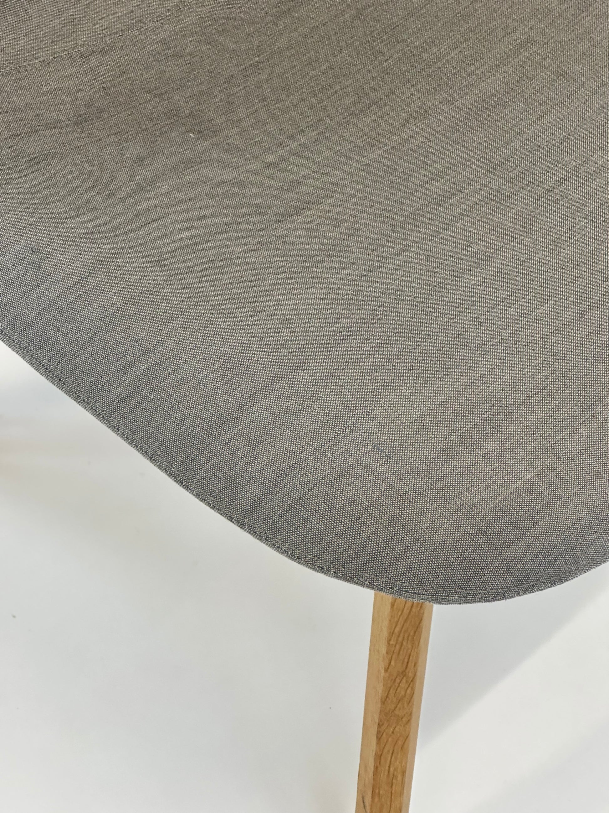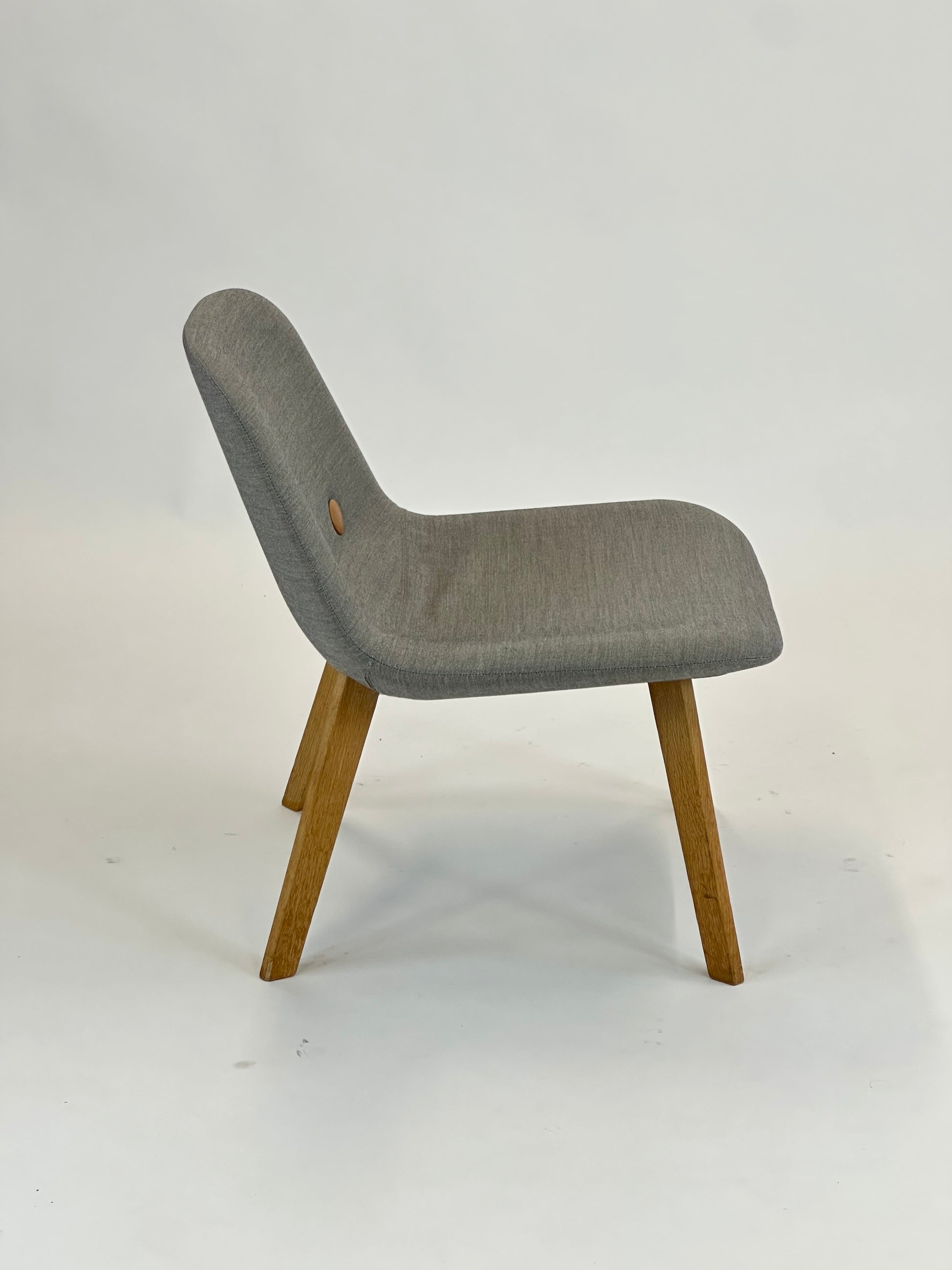 Stolen er polstret i slidstærkt gråt tekstil, der giver et elegant og tidløst look, mens de karakteristiske “øjne”-knapper på ryglænet tilfører designet et unikt og personligt præg. Stellet er udført i massivt egetræ, som giver varme og naturlighed til det samlede udtryk og sikrer en stabil og holdbar konstruktion.