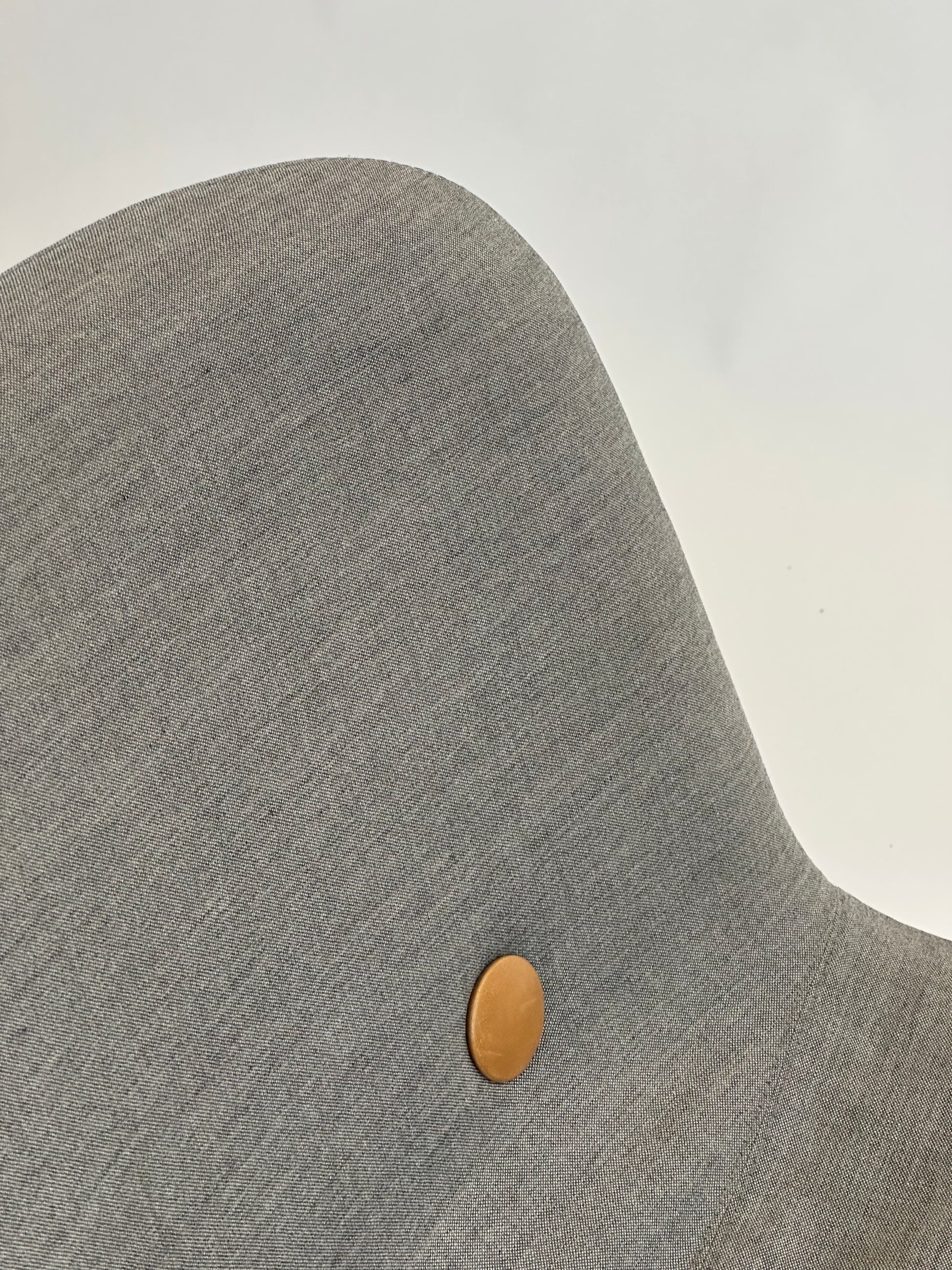 ✔ Sæde og ryg: Polstret i gråt tekstil med karakteristiske knapper