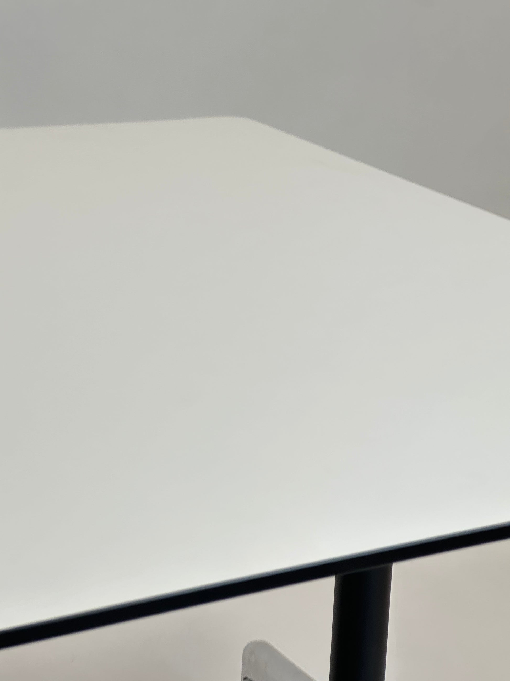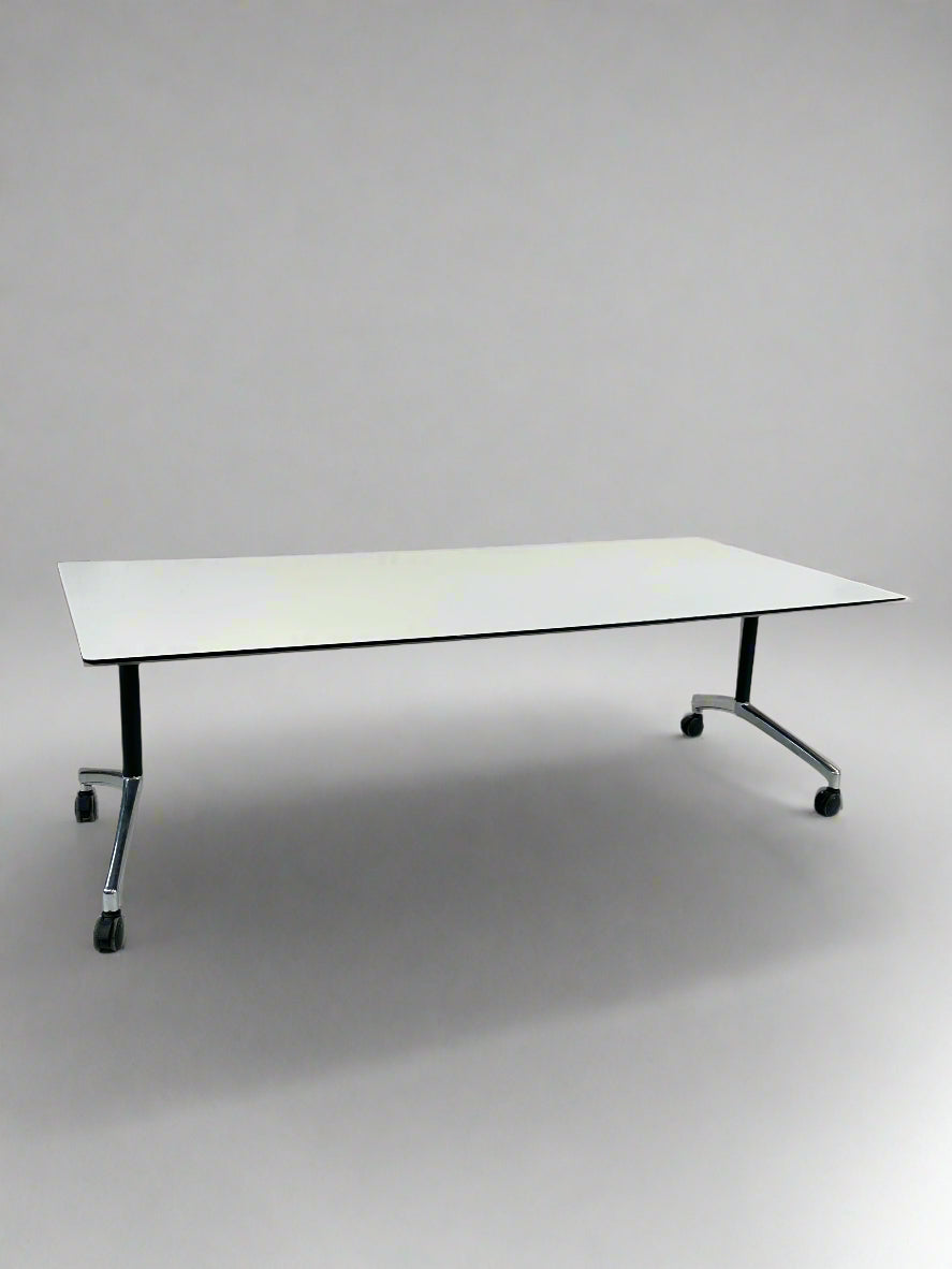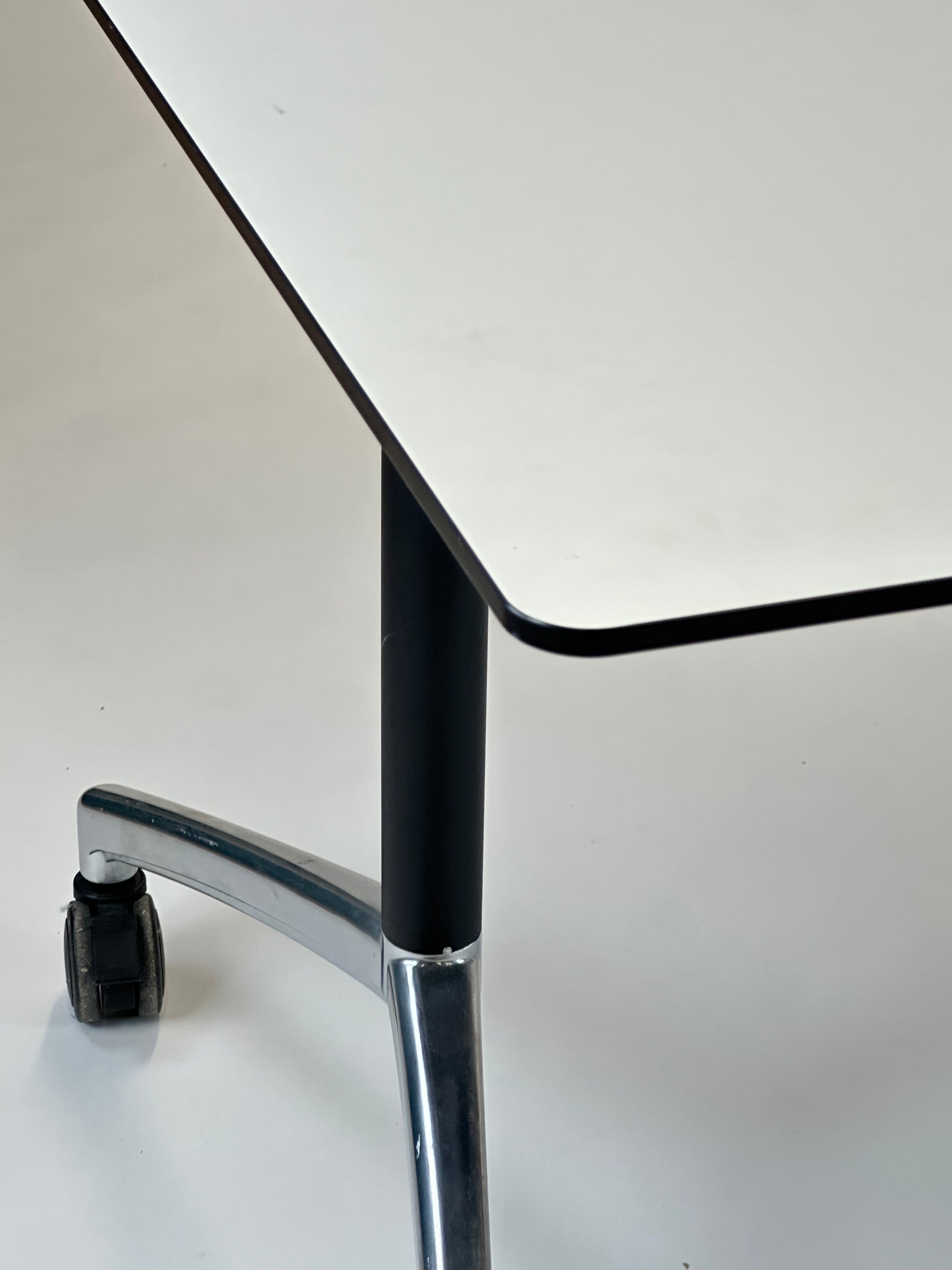 Bordpladen er udført i hvid med en slank, minimalistisk profil, der giver et moderne og professionelt udtryk. Stellet i forkromet stål er udstyret med hjul, så bordet nemt kan flyttes efter behov. Med den praktiske Flip Top-funktion kan bordpladen vippes op, hvilket gør bordet pladsbesparende og ideelt til rum, hvor fleksibel indretning er en prioritet.