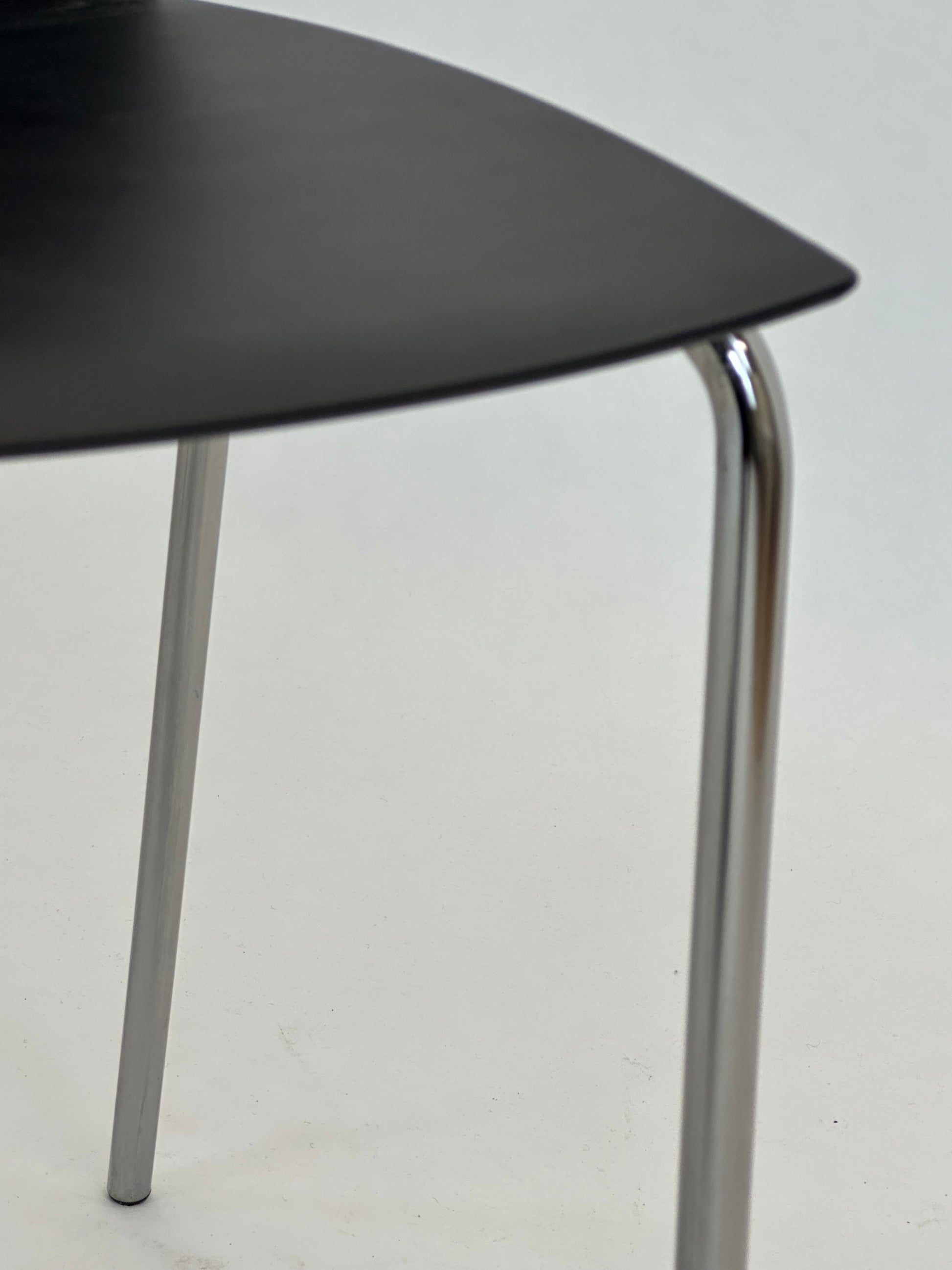 - Ryglæn: Stolens ryglæn er fremstillet i robust sort plast med et unikt geometrisk design, der tilføjer en moderne visuel dimension og sikrer behagelig rygstøtte.