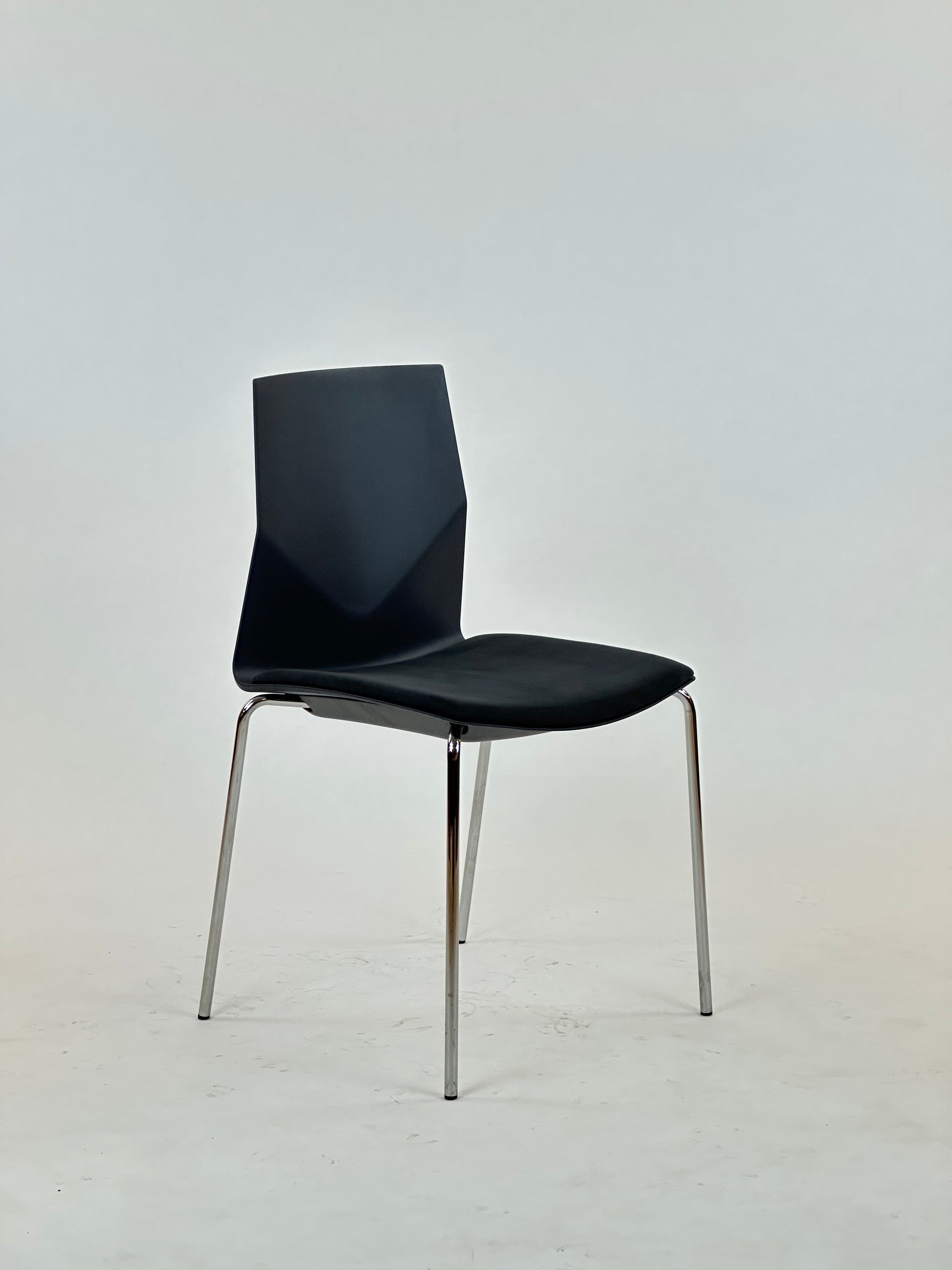 - Ryglæn: Stolens ryglæn er fremstillet i robust sort plast med et unikt geometrisk design, der tilføjer en moderne visuel dimension og sikrer behagelig rygstøtte.
