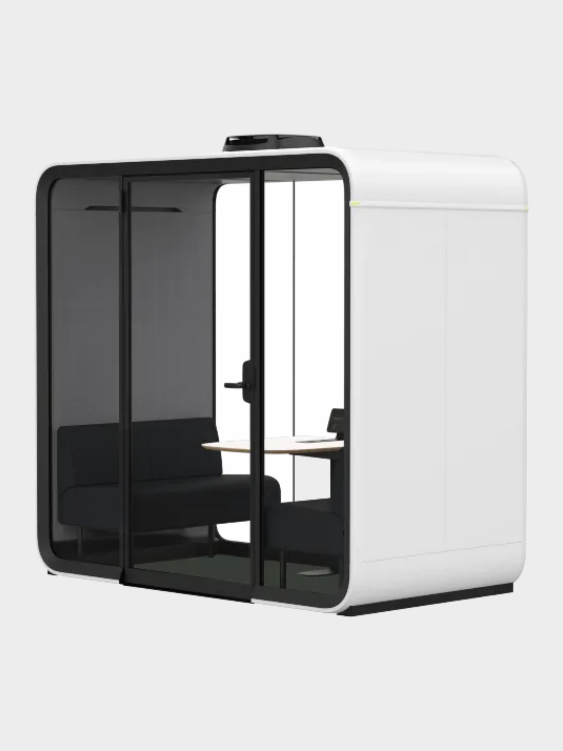 Denne udgave er udført i RAL 9016 Ultramatt hvid, som giver et rent og minimalistisk udtryk, der nemt integreres i de fleste kontorindretninger. Det afrundede design og de store glasflader sikrer et let visuelt udtryk, mens den indvendige indretning med integreret bord og siddepladser skaber funktionelle rammer for mindre møder. På trods af Lite-versionen leverer boksen stadig effektiv akustisk afskærmning og et behageligt indeklima via indbygget ventilation.