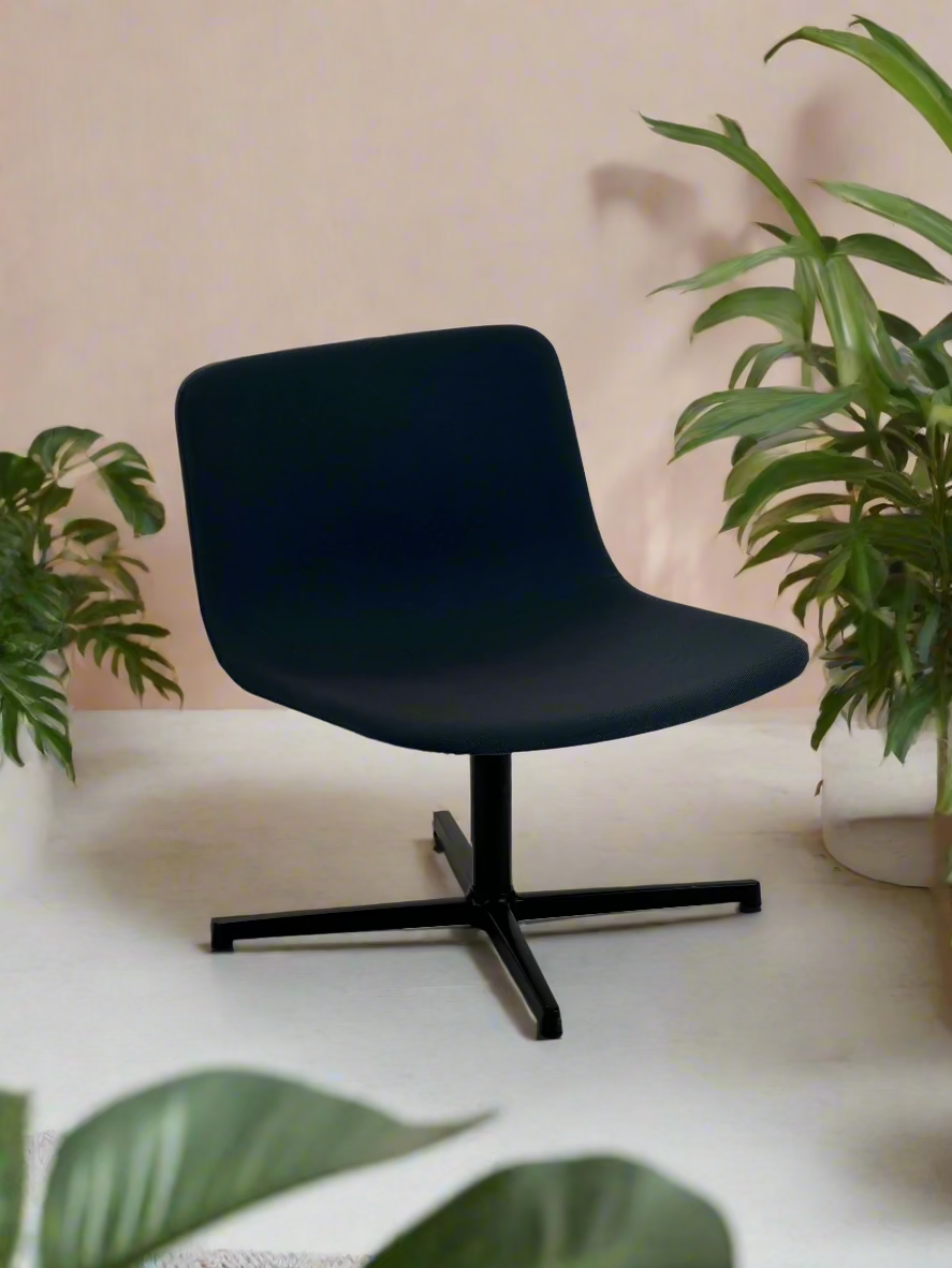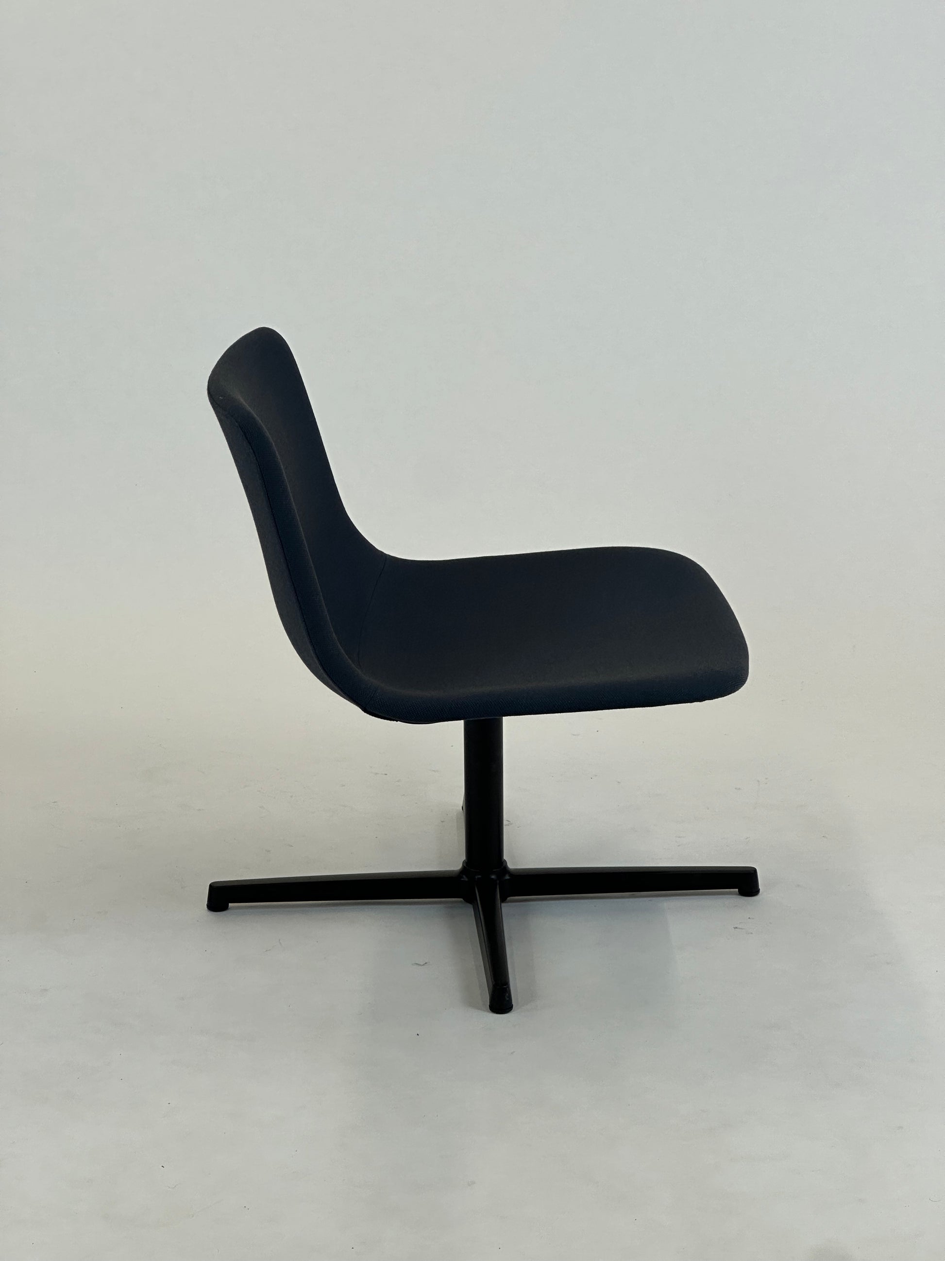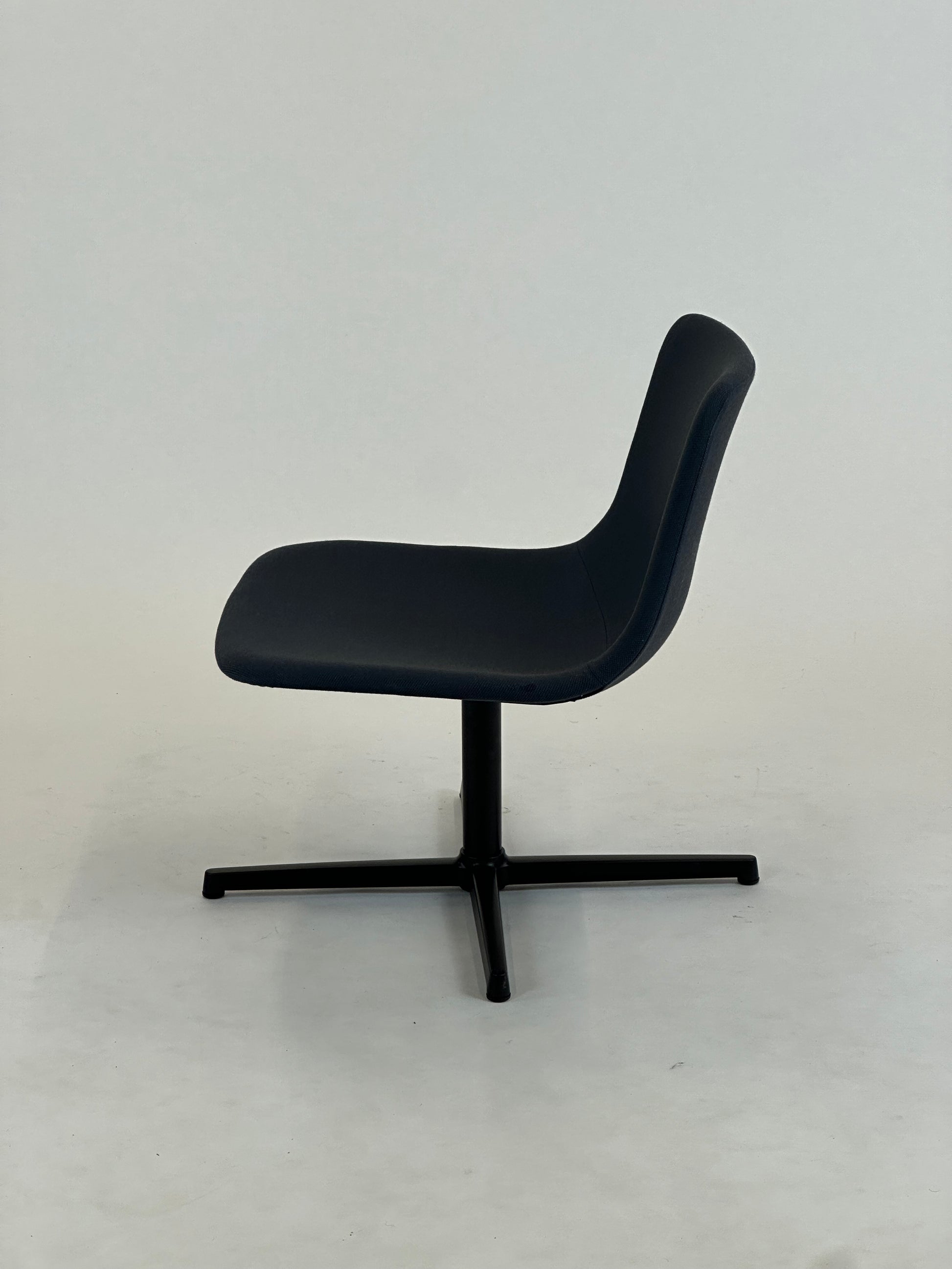 - Base: Den sorte, pulverlakerede firebenede base giver stolen stabilitet og et stilrent udseende. Det minimalistiske design fremhæver stolens skulpturelle form og giver et let og luftigt indtryk.