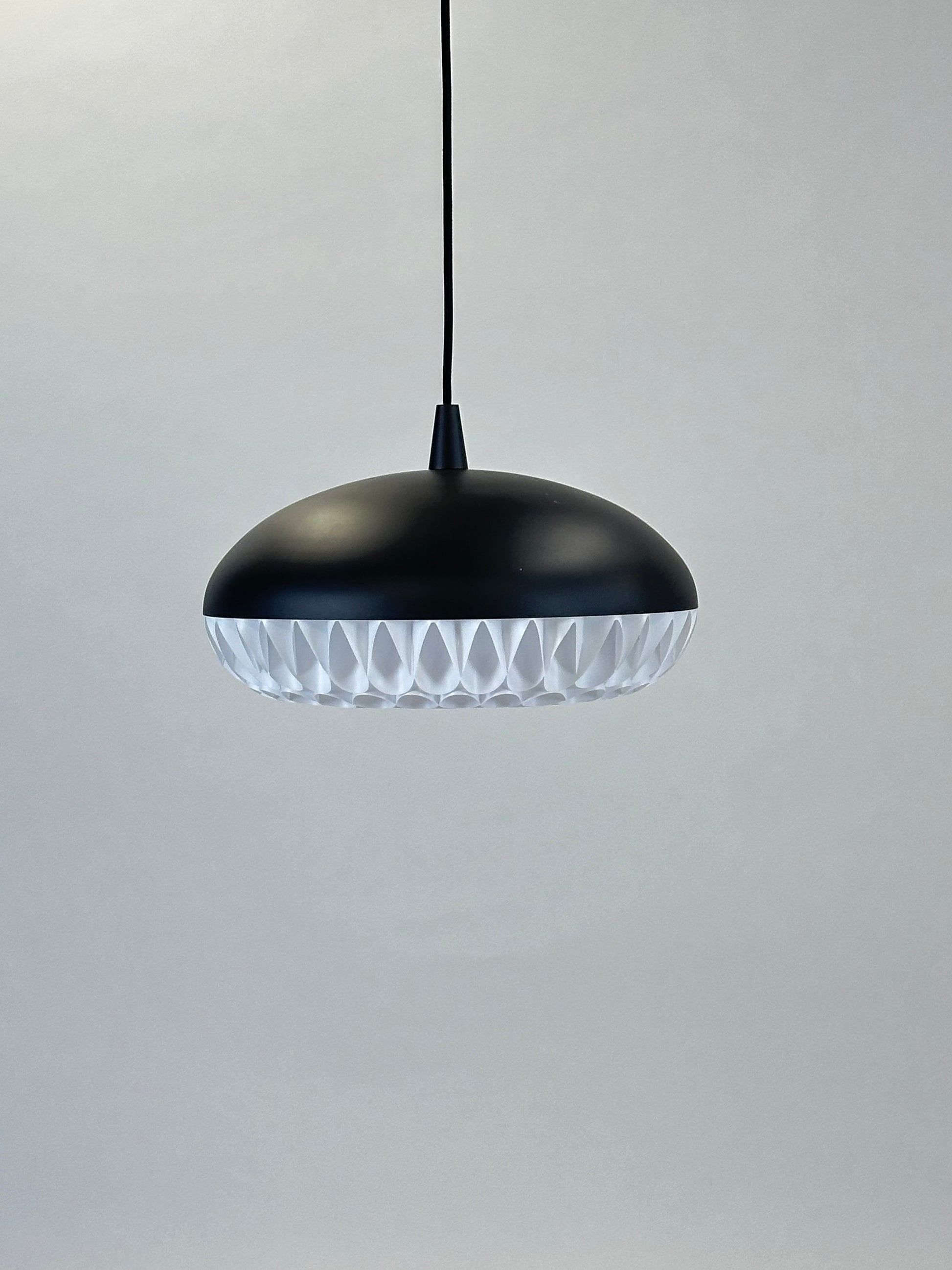 Aeon Rocket P1, designet af Mads Odgård for Fritz Hansen, er et smukt eksempel på moderne dansk belysningsdesign, hvor funktionalitet og æstetik mødes i perfekt harmoni. Lampen kombinerer en mat sort metalskærm med en transparent underdel i plast, der er omhyggeligt udformet med et karakteristisk mønster, som filtrerer lyset på en behagelig og stemningsfuld måde.