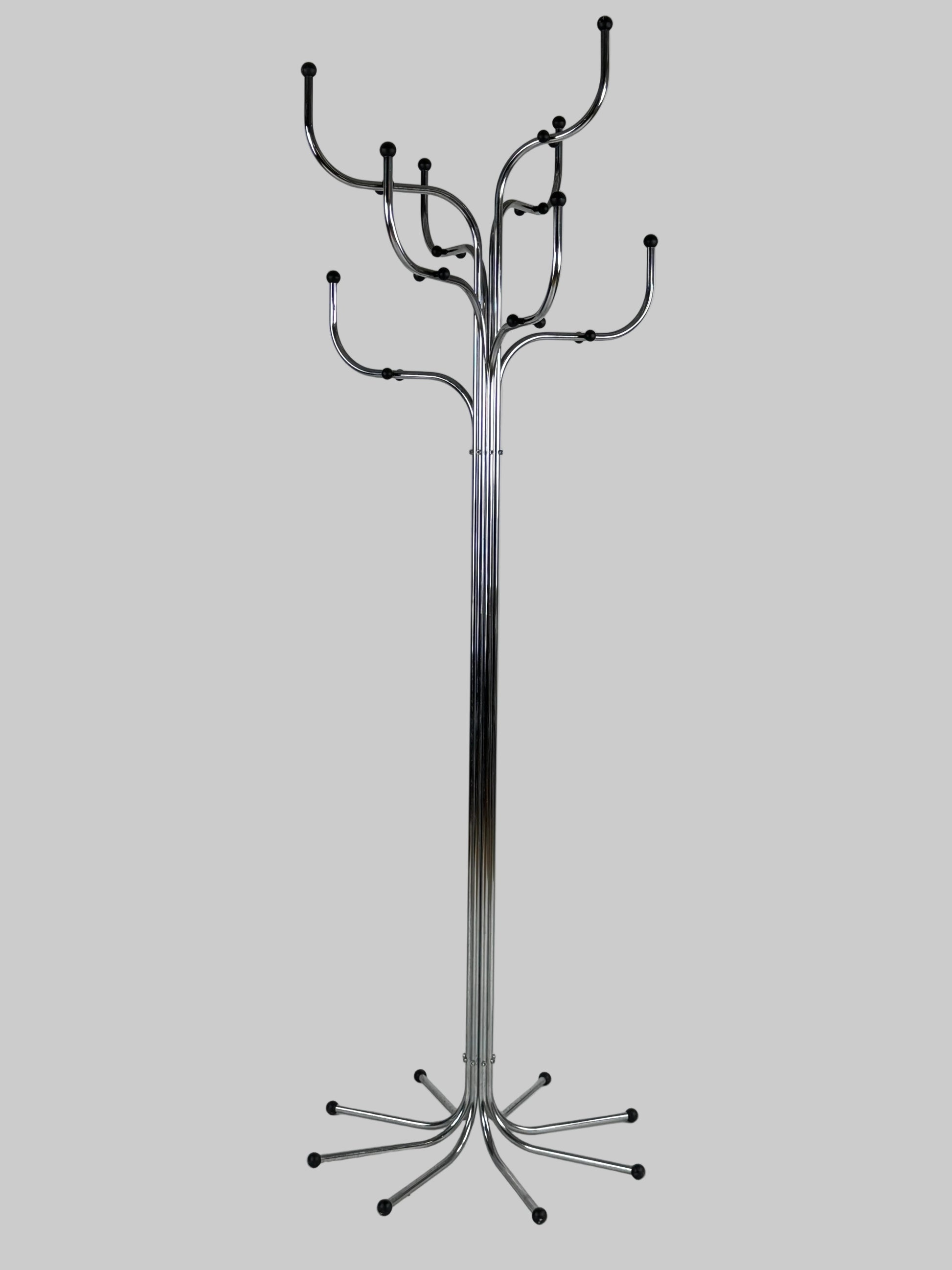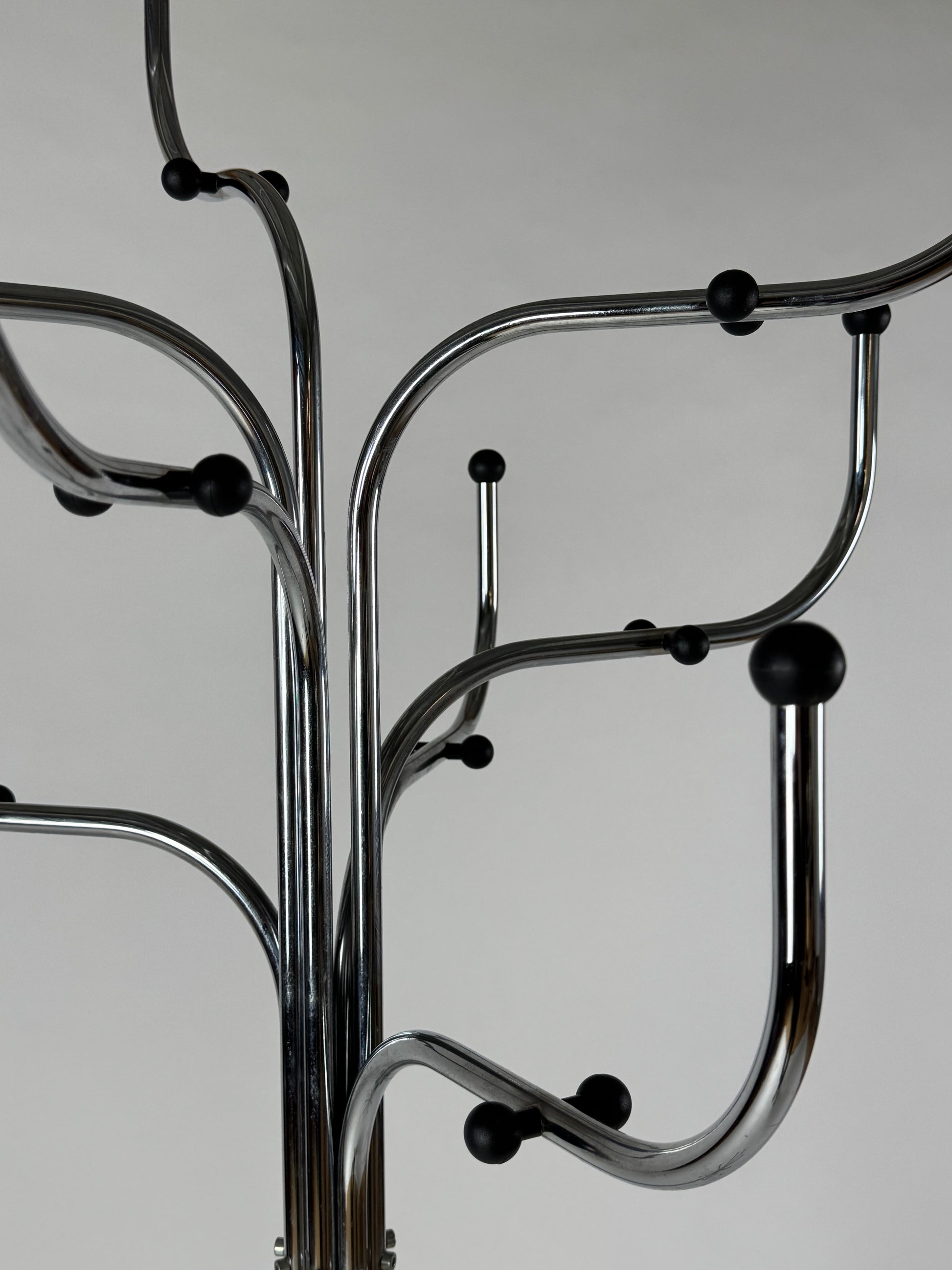 Coat Tree fra Fritz Hansen er en ikonisk stumtjener, designet af Sidse Werner i 1971. Med sit karakteristiske træformede udtryk og elegante kromfinish fremstår den både som praktisk opbevaringsløsning og dekorativt element. Konstruktionen i forkromet stål og de ni bøjede arme med sorte knopper giver både holdbarhed og rigelig plads til jakker, tasker og accessories.