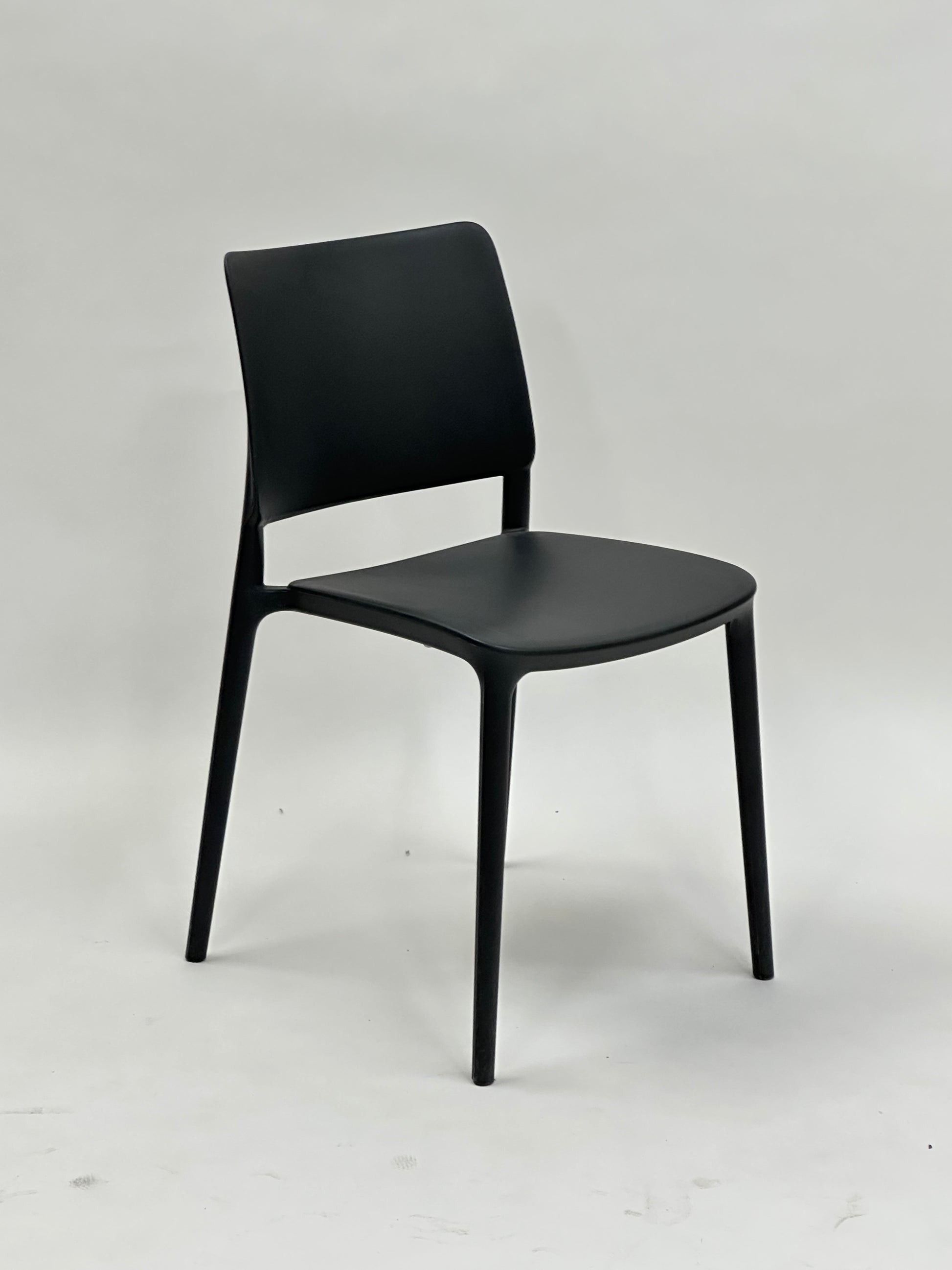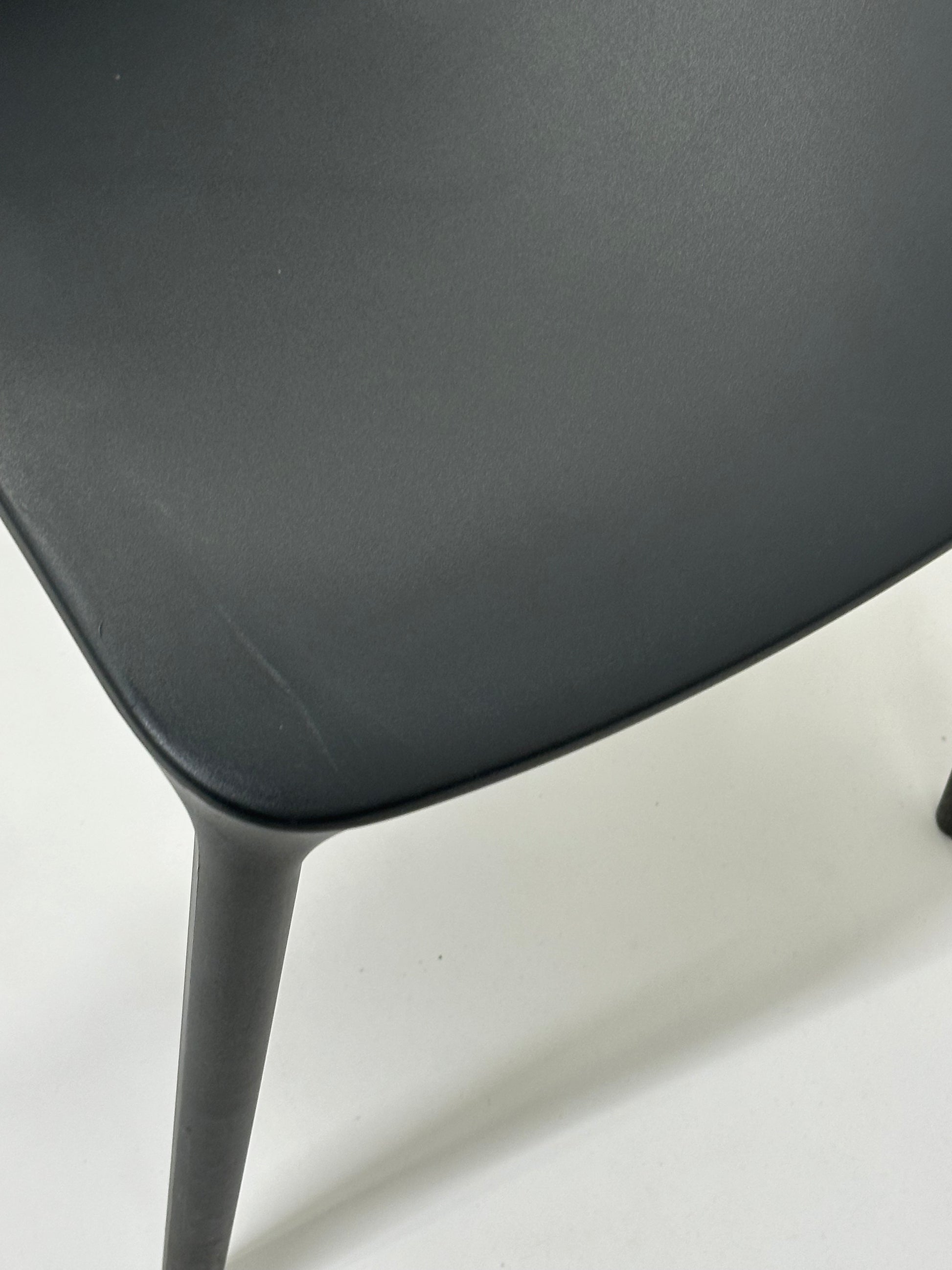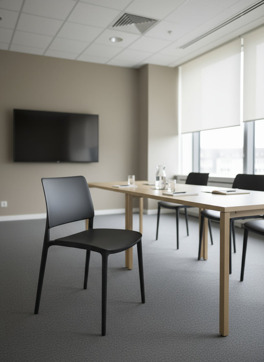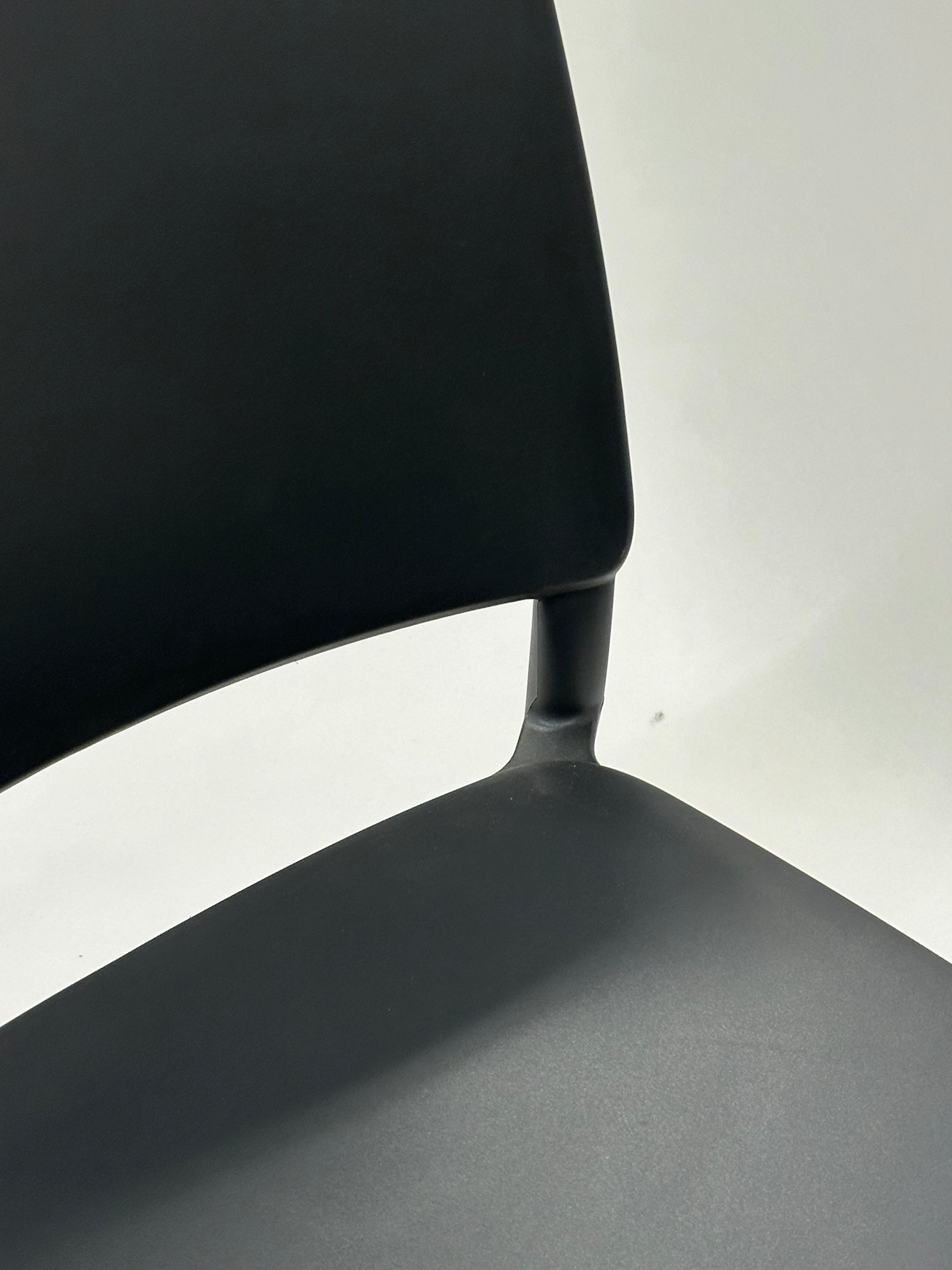 Stolen er fremstillet i én formstøbt del i robust sort polypropylen, hvilket giver både styrke og en glat, rengøringsvenlig overflade. De afrundede kanter og bløde kurver gør den behagelig at sidde i – også over længere tid – og det ensartede look uden samlinger giver et roligt og professionelt udtryk i rummet.