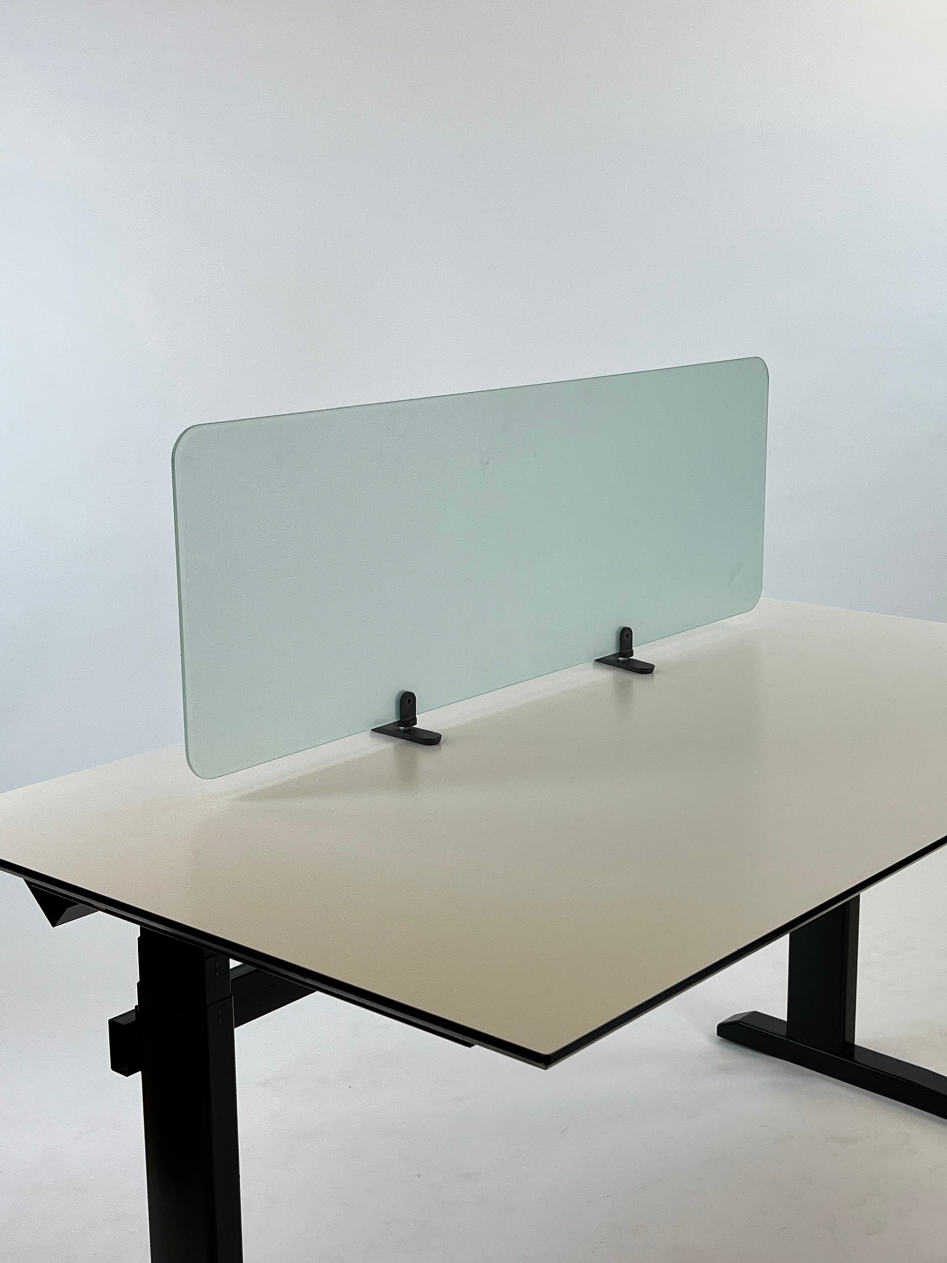 Fin bord afskærmning i glas. Glaspladen er monteret på fødder så den nemt og hurtigt kan flyttes. Glaspladen er blank på den ene side og mat på den anden.