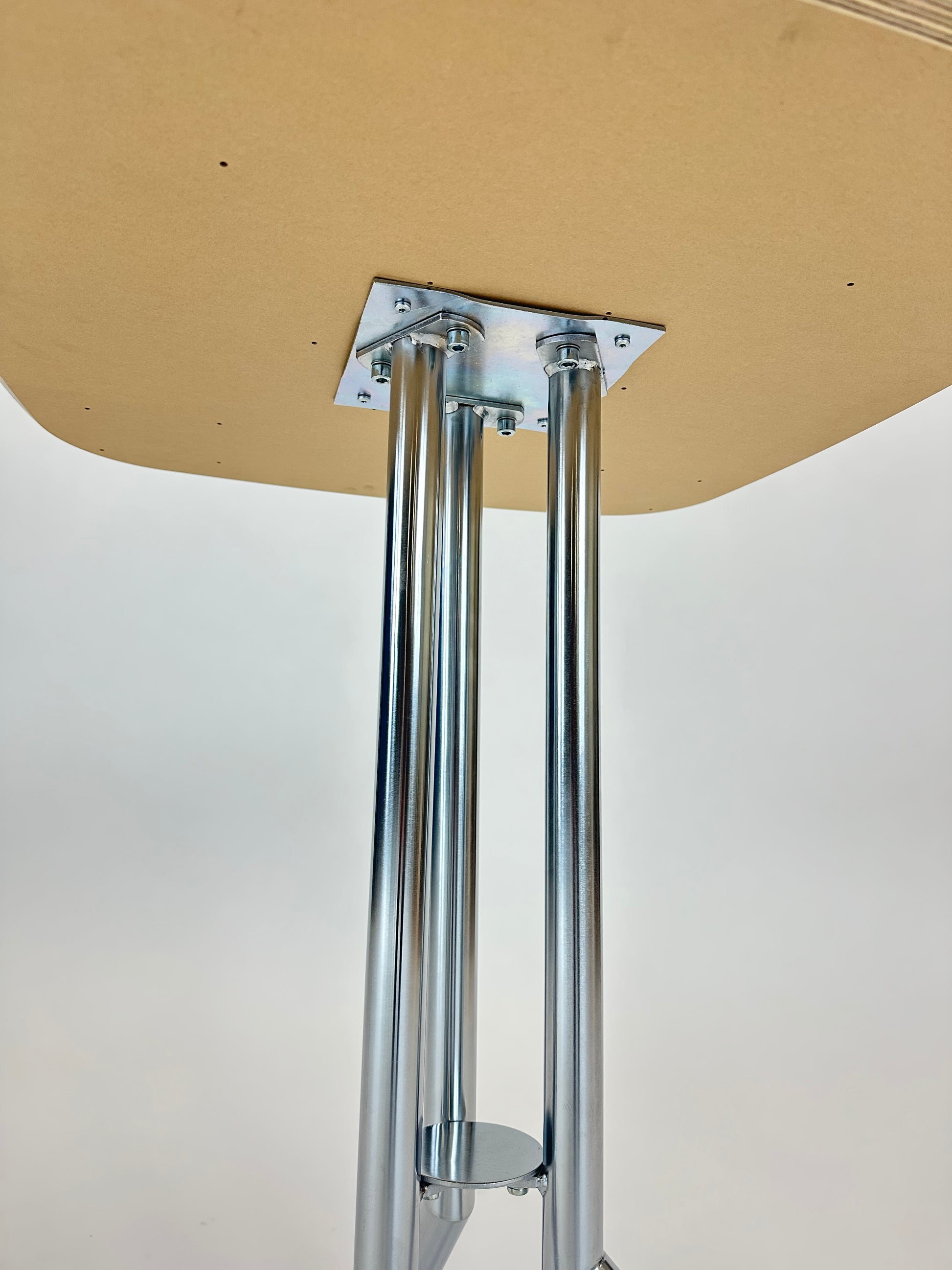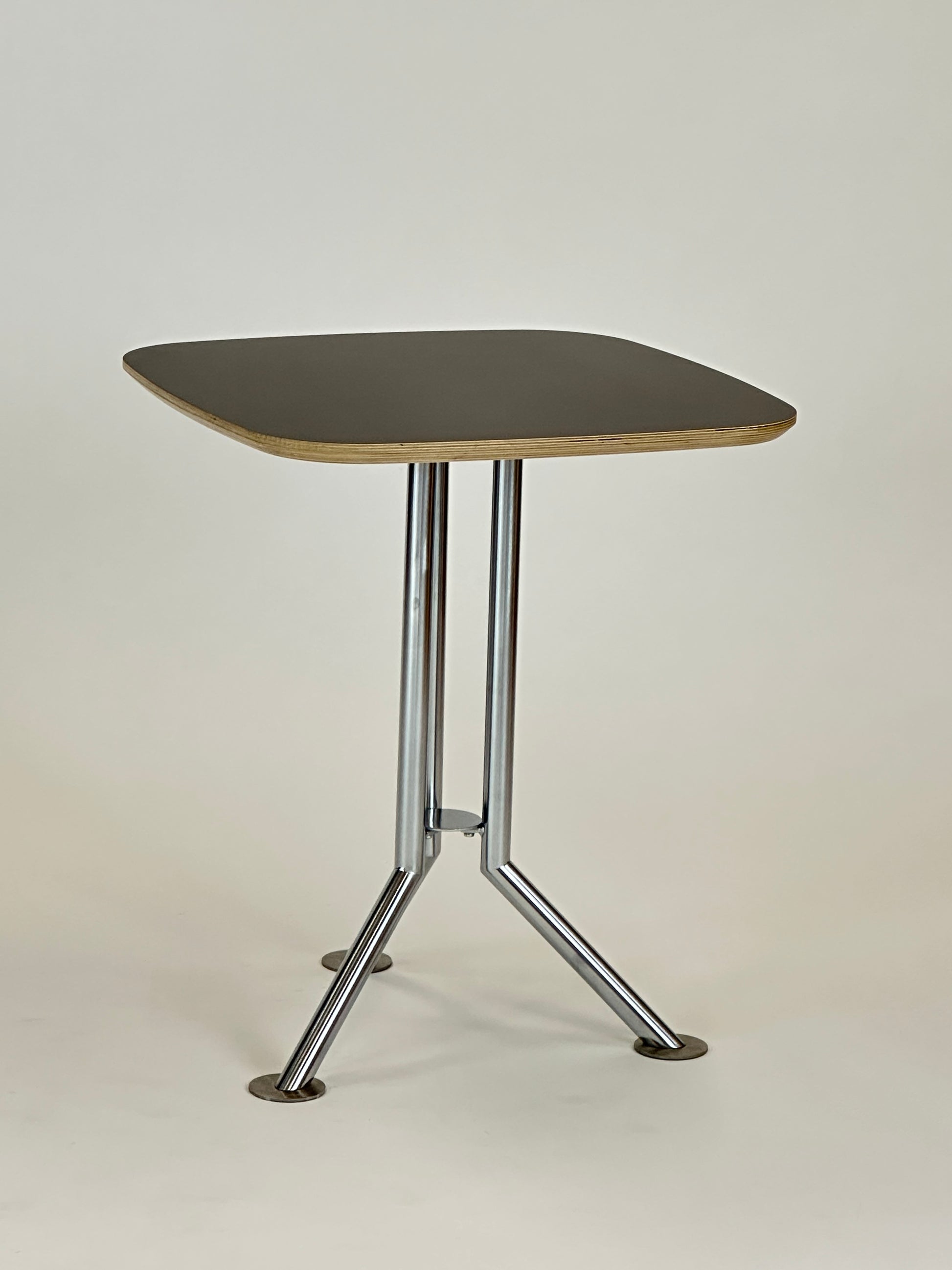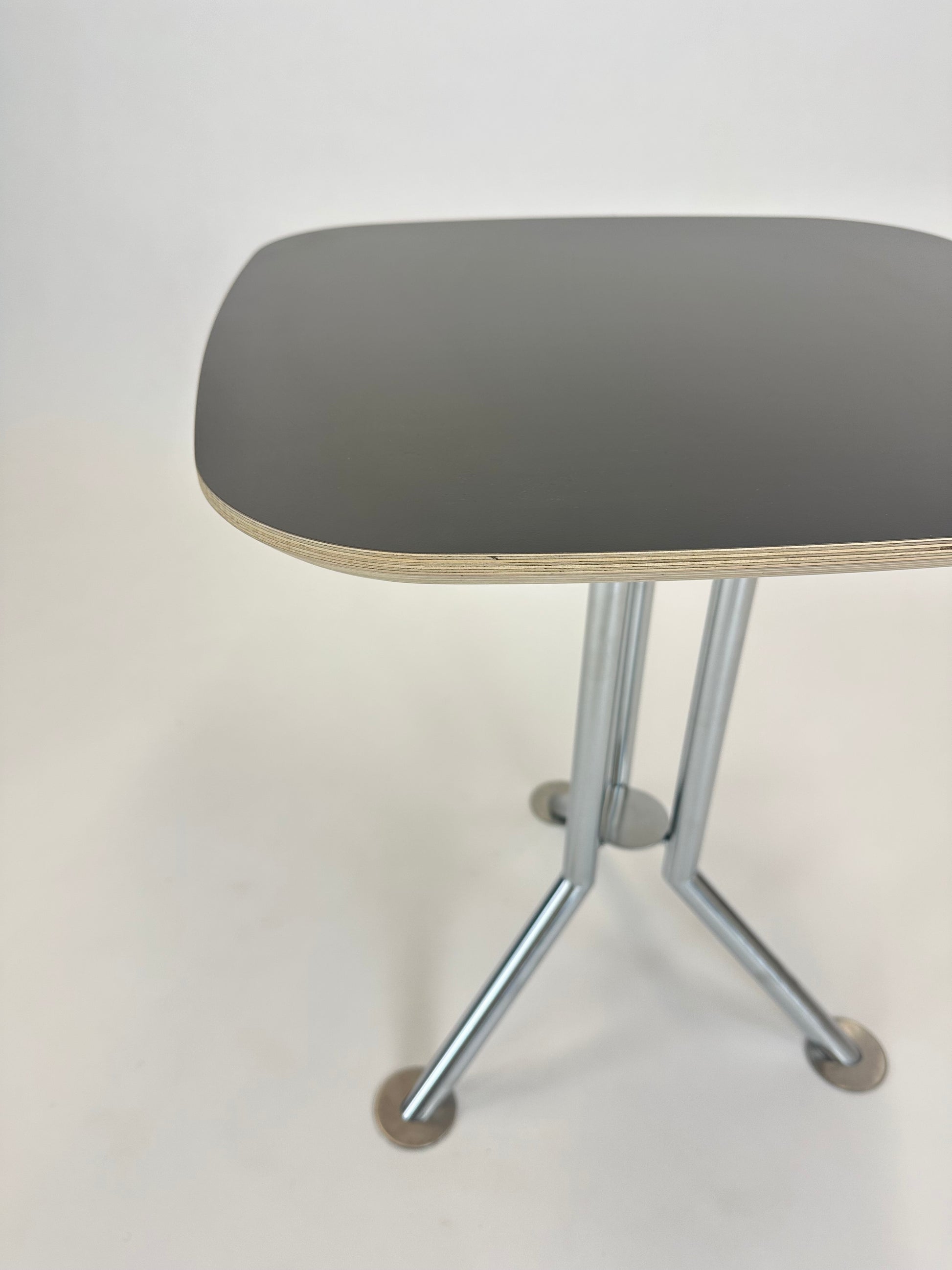 - Bordplade: Kvadratisk bordplade i højtrykslaminat, som giver en rengøringsvenlig og slidstærk overflade.