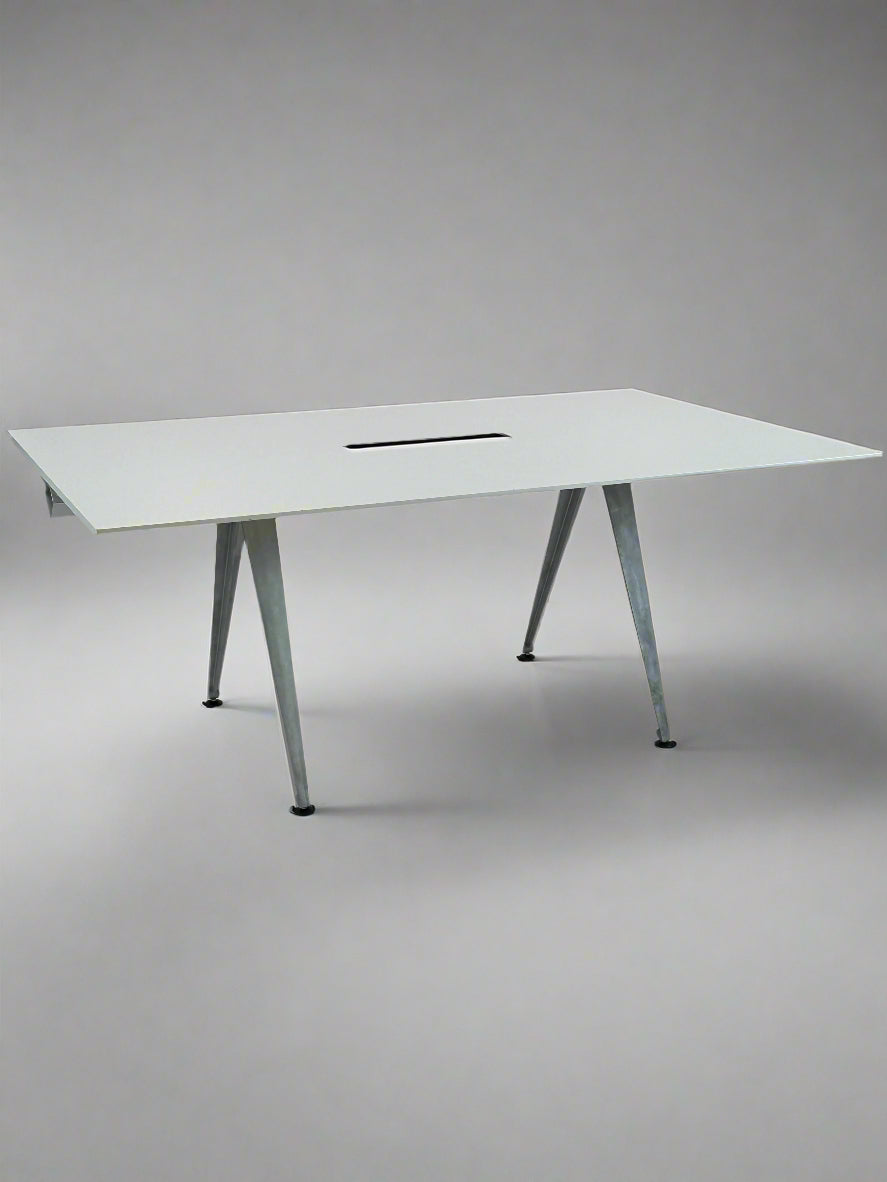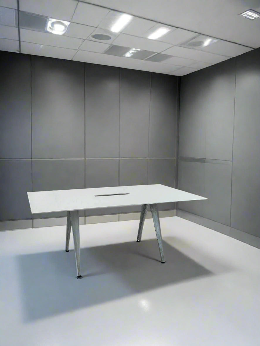 Grip Basic fra Randers+Radius er et moderne og funktionelt mødebord designet til professionelle arbejdsmiljøer. Bordets rene linjer og karakteristiske skrå ben giver det et let og stilrent udtryk, mens den hvide laminatbordplade sikrer en slidstærk og let rengørlig overflade. Midt i bordet findes en integreret kabelgennemføring, der gør det nemt at holde styr på ledninger og opladere — perfekt til mødelokaler, projektarbejde eller samarbejdszoner.