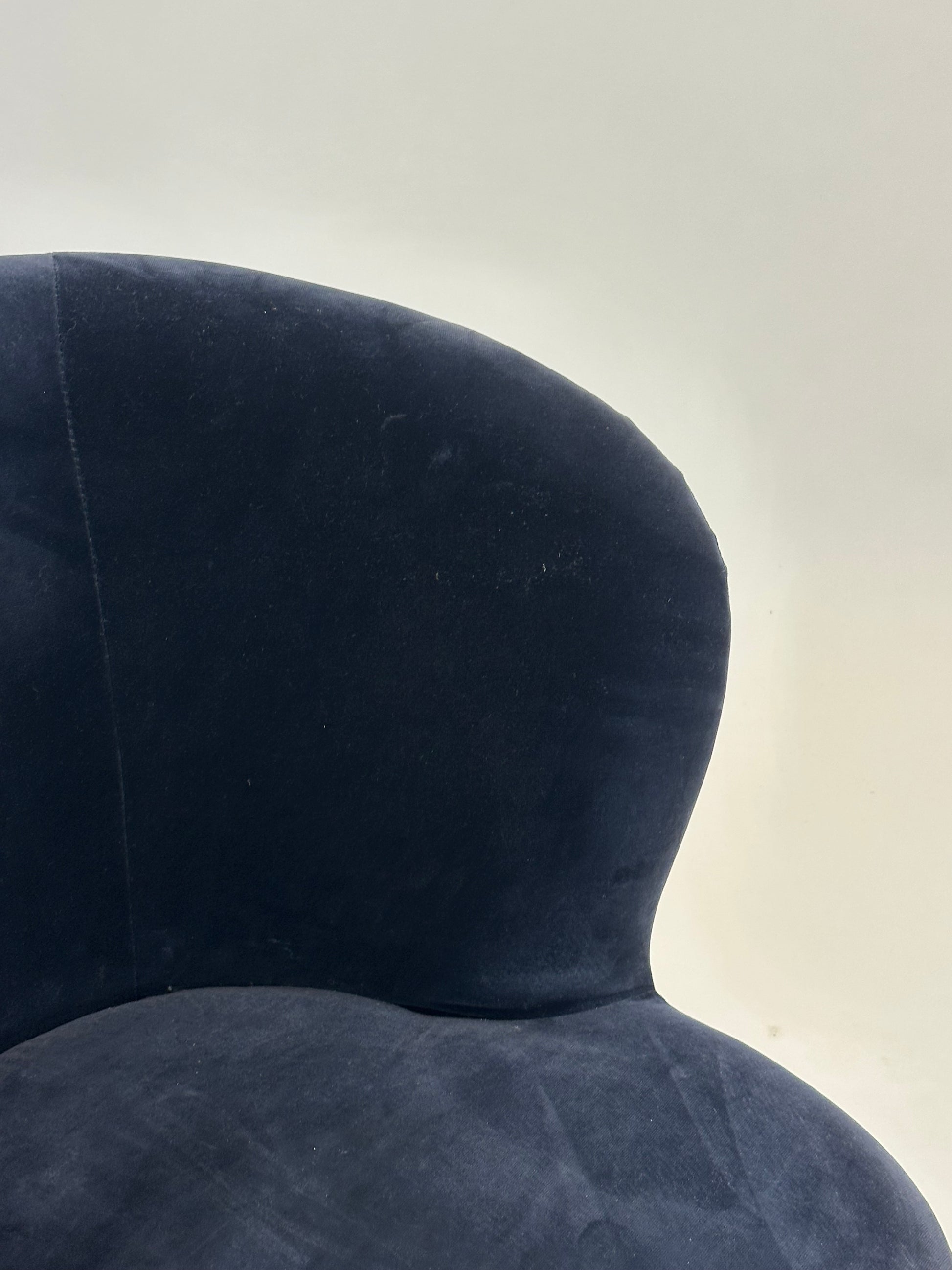 Denne model er polstret i mørk velour, som fremhæver stolens kurvede silhuet og tilføjer et sofistikeret udtryk til indretningen. Det brede sæde og den omsluttende ryg giver optimal siddekomfort, hvilket gør den ideel til både uformelle møder og afslappede stunder.