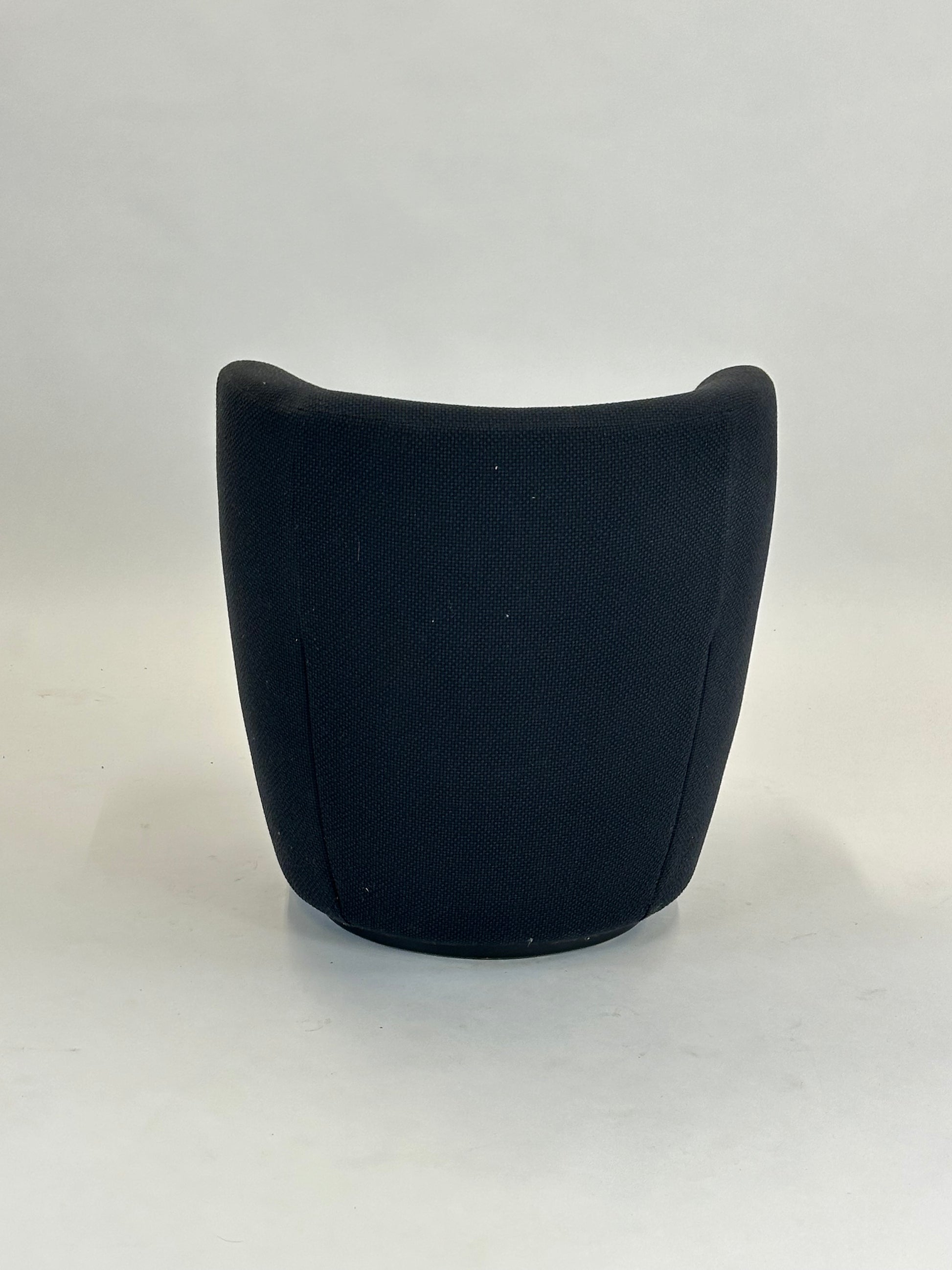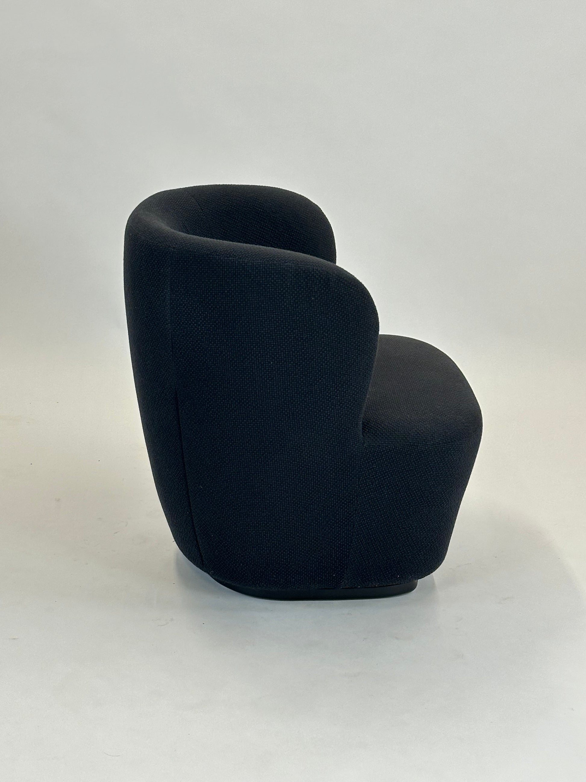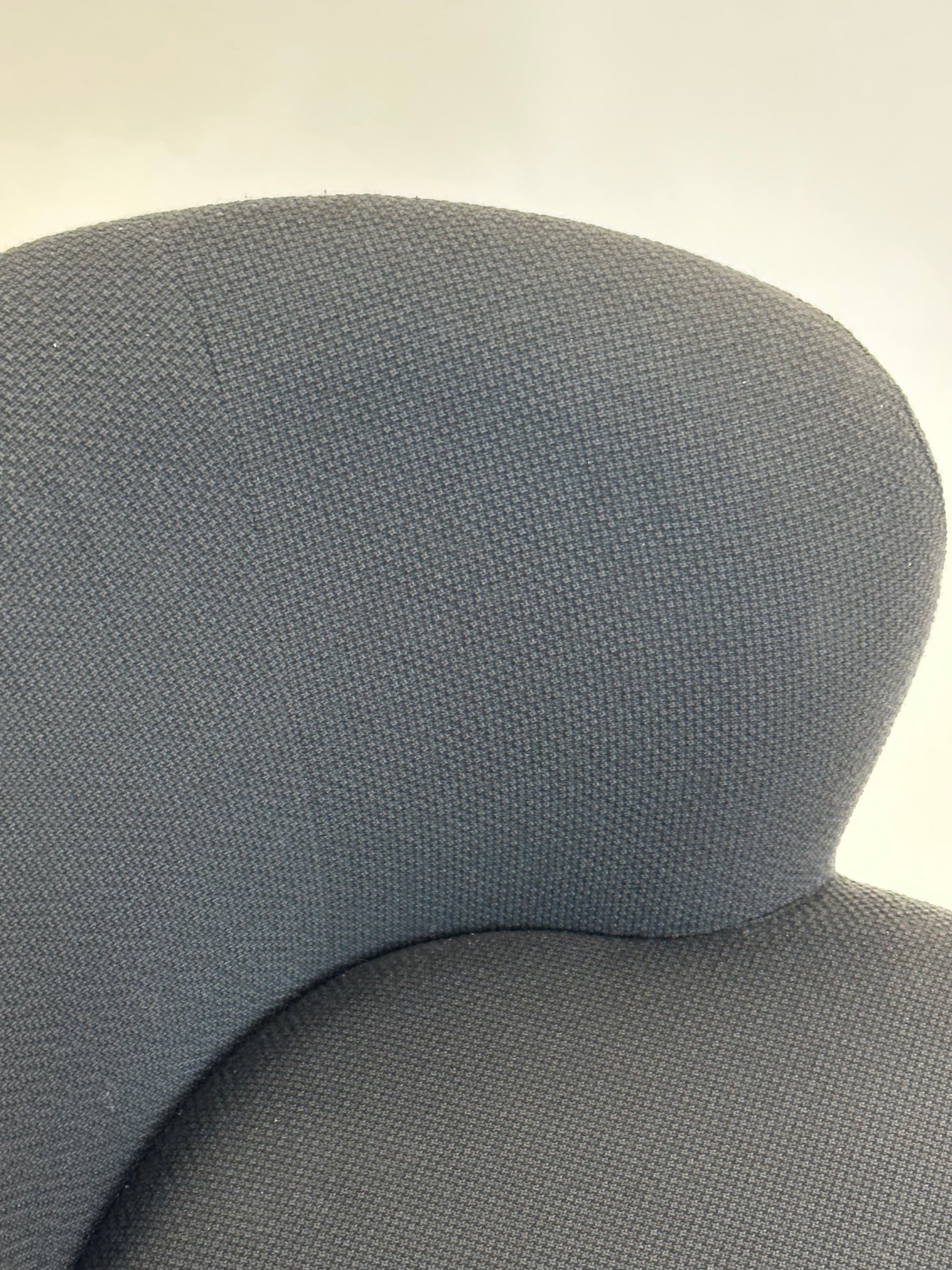 Denne model er polstret i sort tekstil, som fremhæver stolens kurvede silhuet og tilføjer et sofistikeret udtryk til indretningen. Det brede sæde og den omsluttende ryg giver optimal siddekomfort, hvilket gør den ideel til både uformelle møder og afslappede stunder.