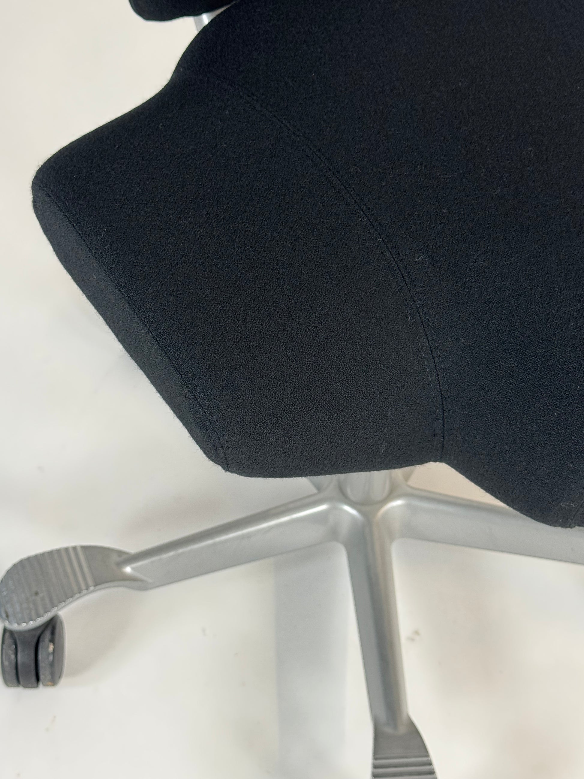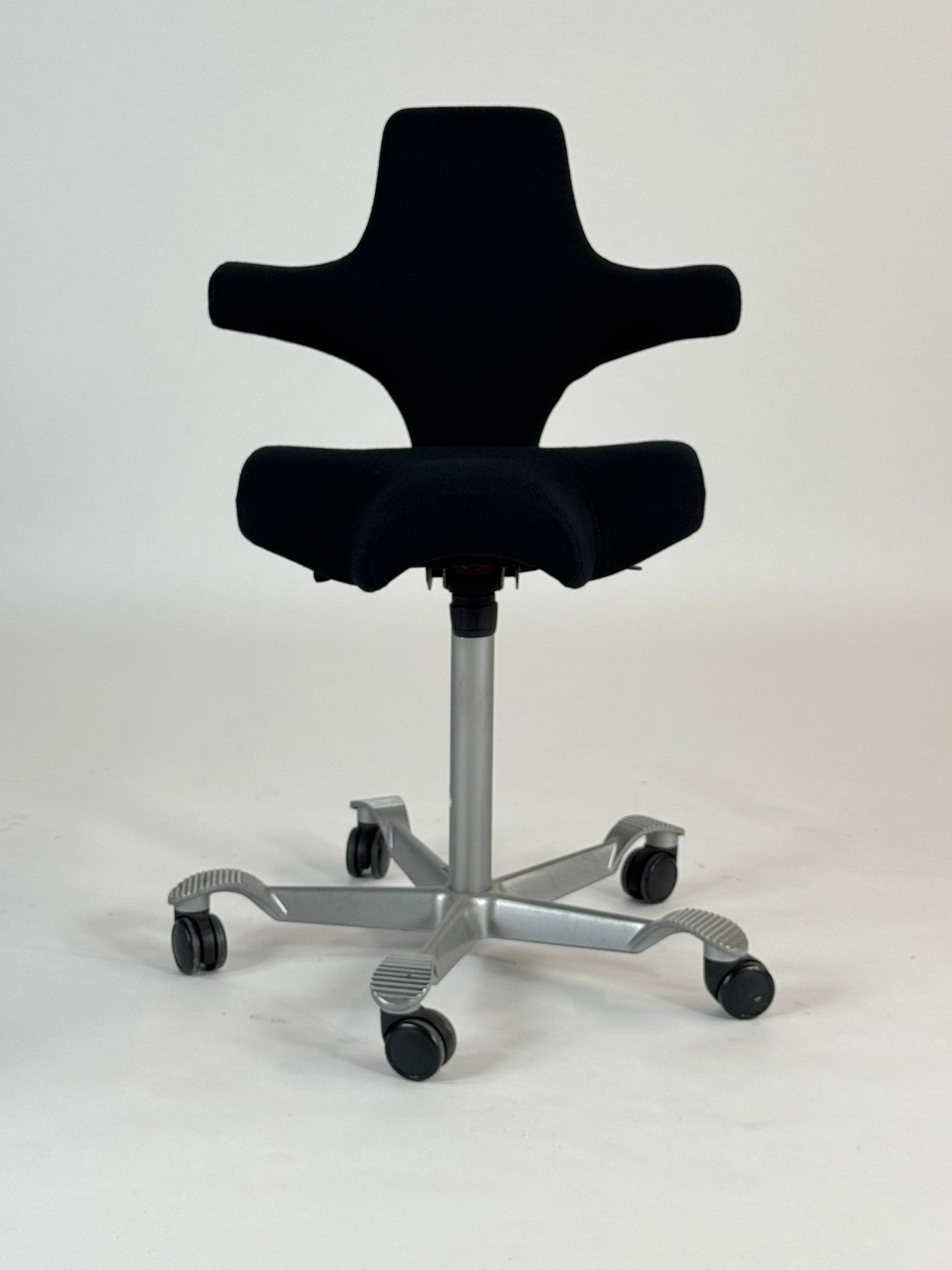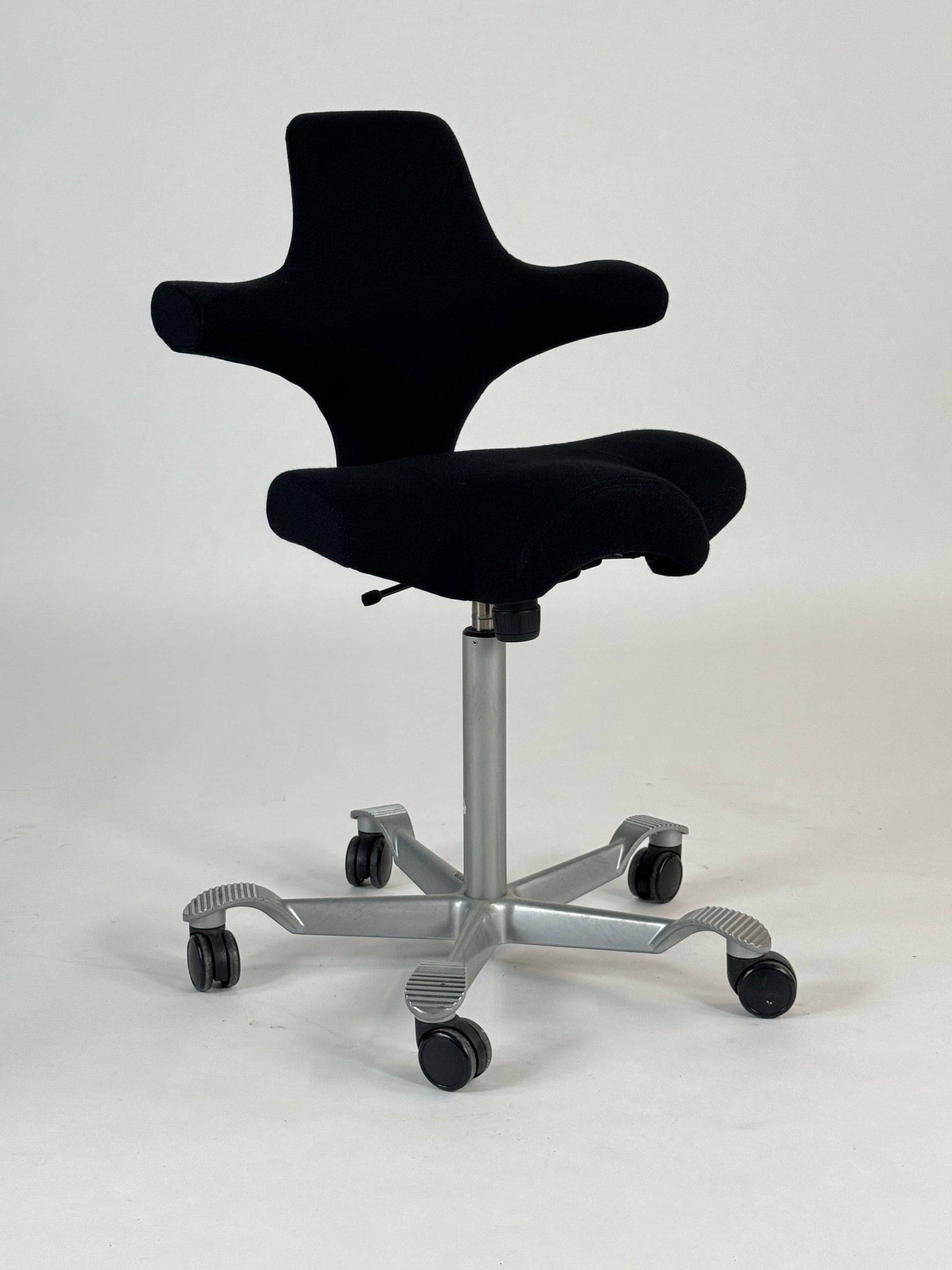 Denne model er udstyret med en 265 mm gaslift, hvilket gør den velegnet til høje arbejdsstationer, hæve-/sænkeborde eller kreative miljøer, hvor fleksibel siddehøjde er afgørende. Stolen er nybetrukket i sort tekstil, hvilket giver den et stilrent og professionelt udtryk, der nemt kan indgå i både moderne og klassiske kontormiljøer. Capisco 8106 er kendt for sin langtidsholdbare kvalitet og betragtes som en ikonisk løsning inden for ergonomisk kontordesign.