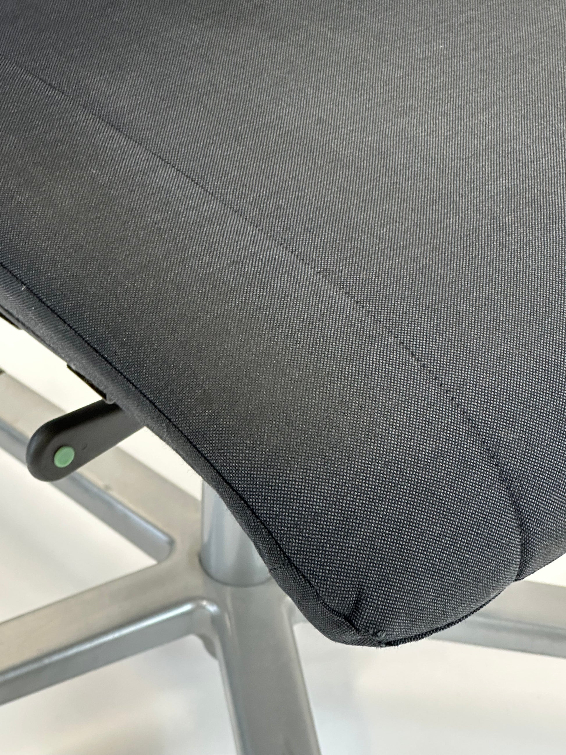 Stolens brede og velpolstrede sæde samt ryglæn er betrukket med mørkegråt slidstærkt tekstil, der giver både behagelig siddekomfort og lang levetid. Med højdejusterbart sæde og ryglæn samt en robust fodkryds i sølvlakeret aluminium med hjul, får du en stol, der kombinerer stabilitet og fleksibilitet i hverdagen.