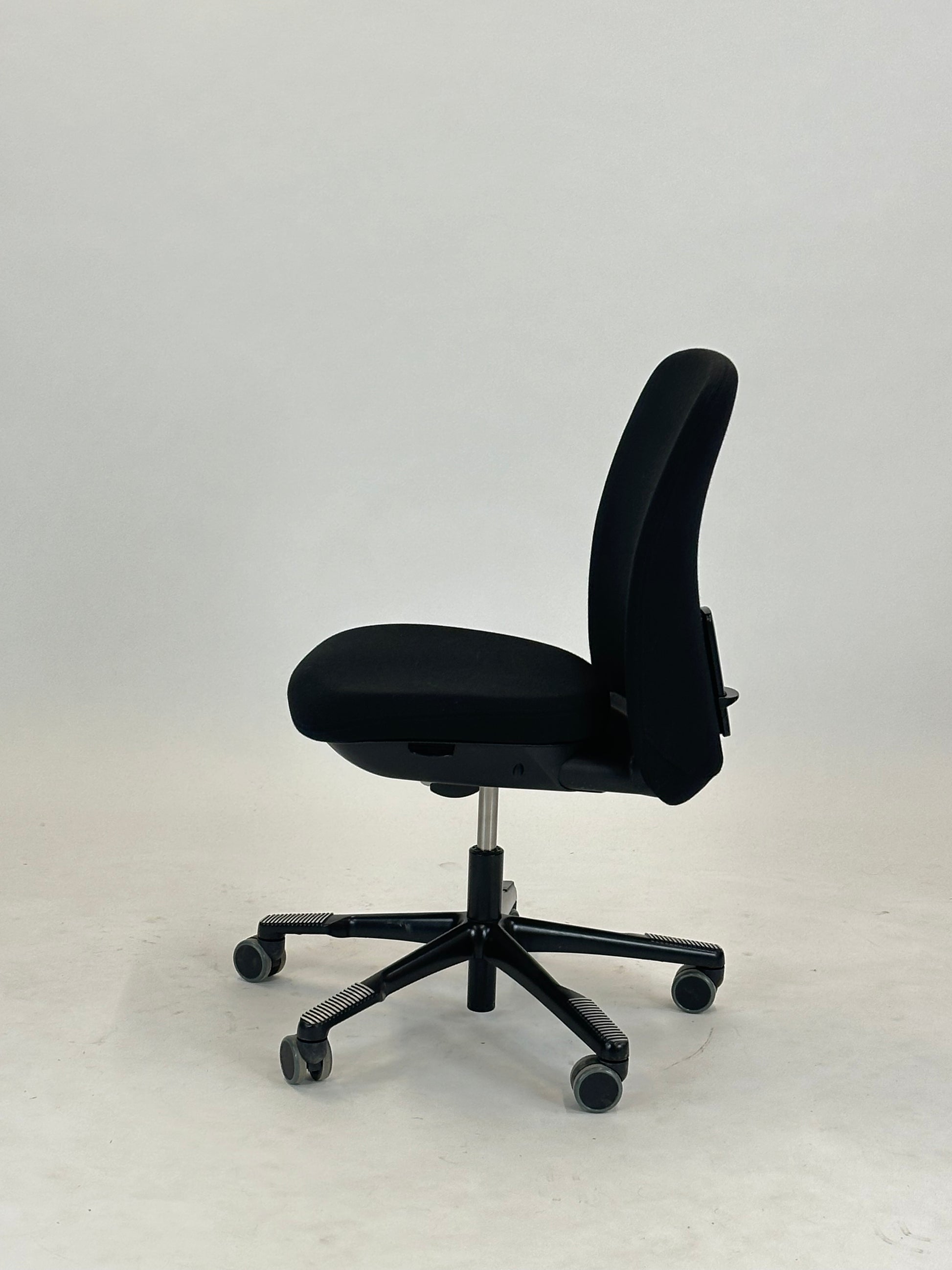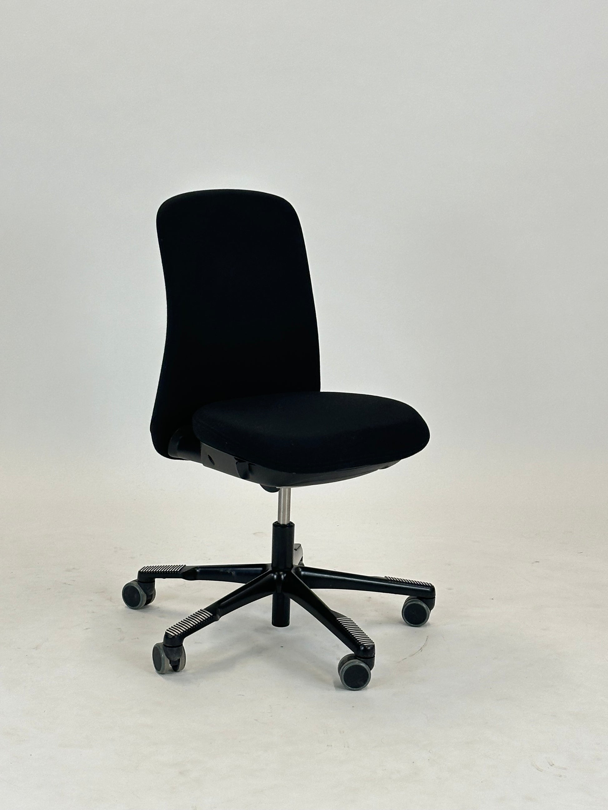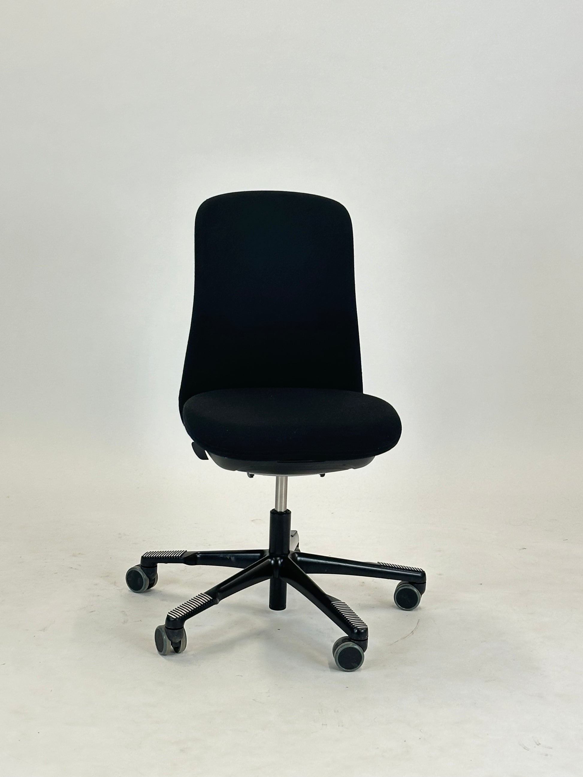 - Sæde og Ryglæn: Stolen er betrukket med sort, slidstærkt tekstil, der giver et elegant og tidløst look. Det ergonomiske ryglæn sikrer støtte til hele ryggen og bidrager til en behagelig siddestilling, selv under lange arbejdsdage.