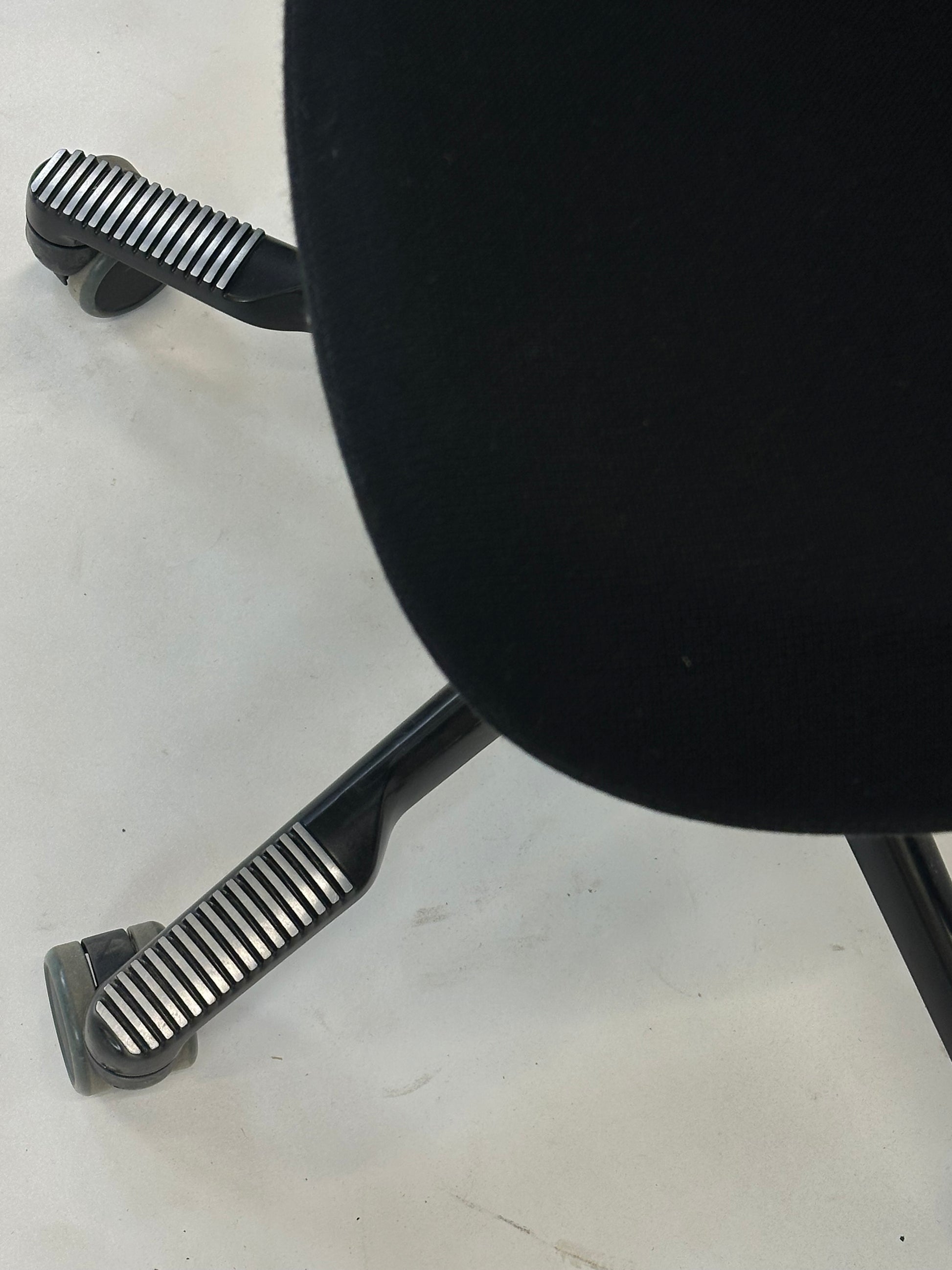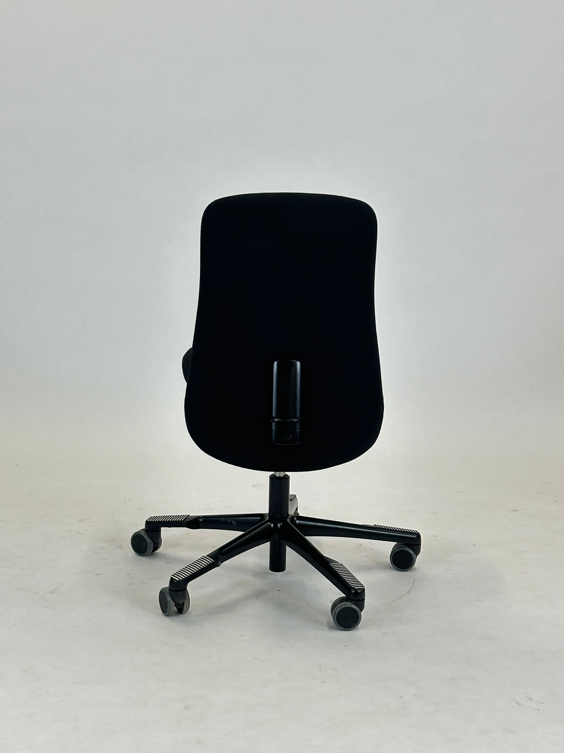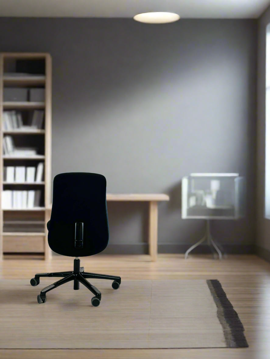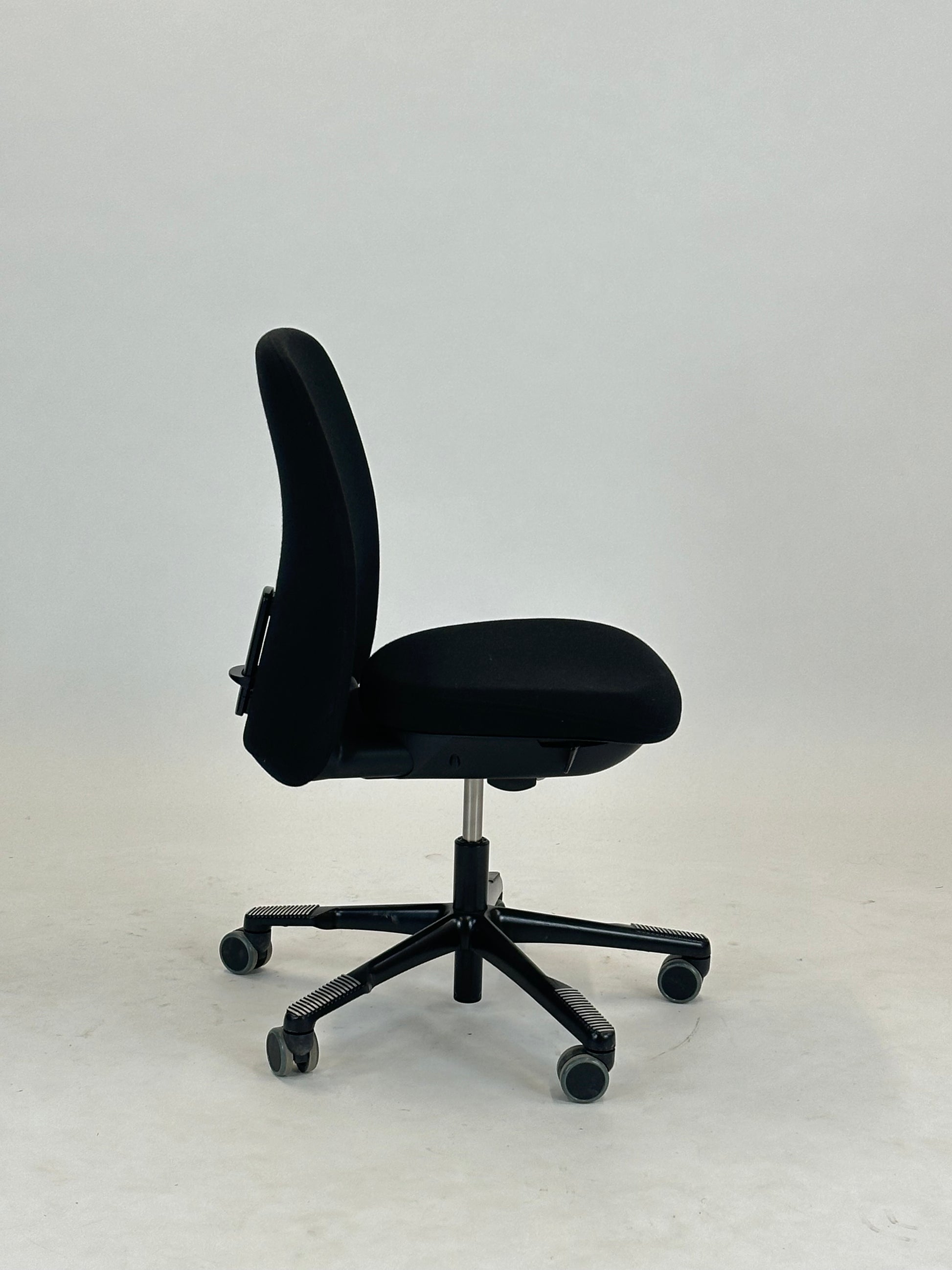 - Sæde og Ryglæn: Stolen er betrukket med sort, slidstærkt tekstil, der giver et elegant og tidløst look. Det ergonomiske ryglæn sikrer støtte til hele ryggen og bidrager til en behagelig siddestilling, selv under lange arbejdsdage.