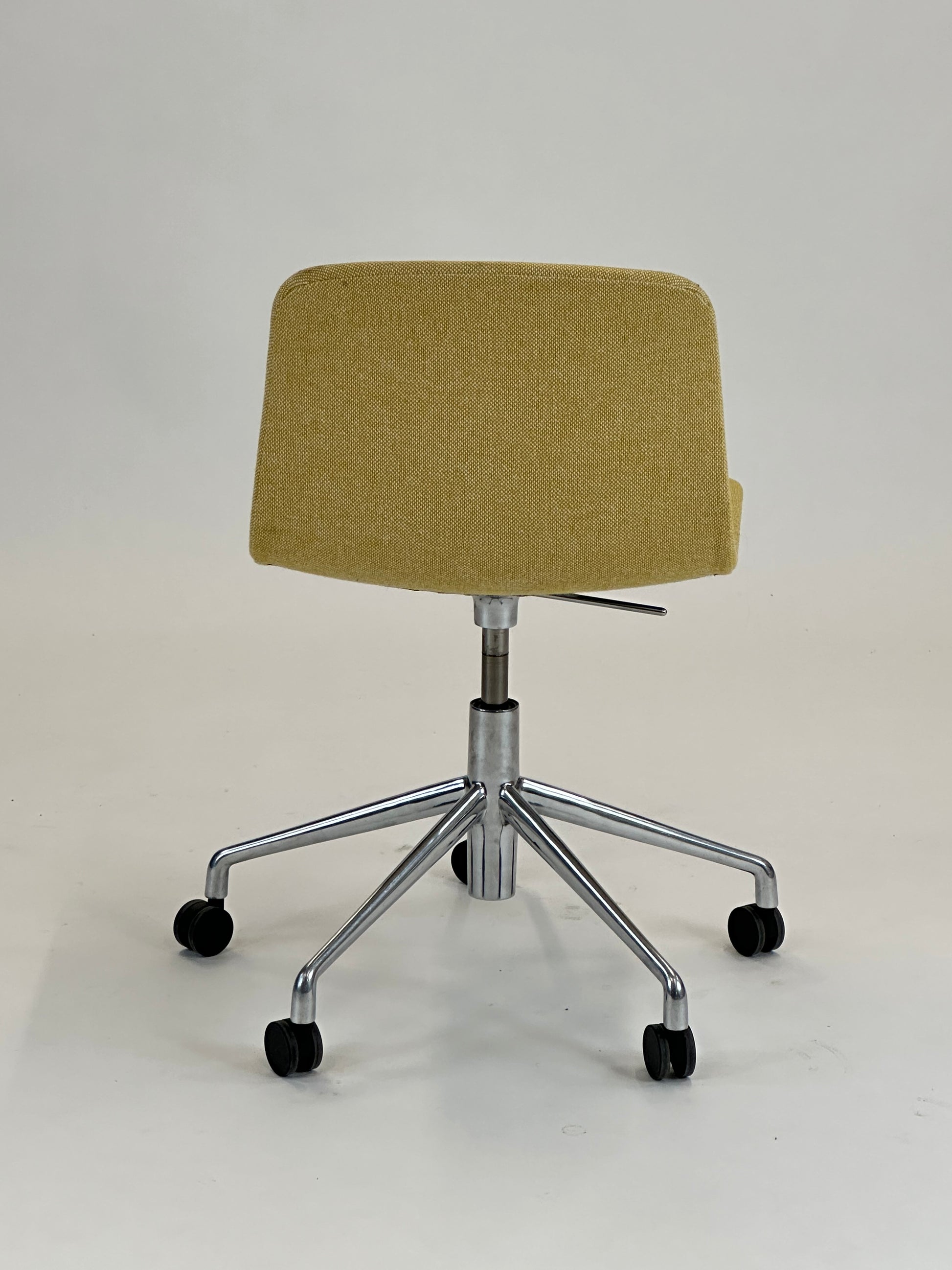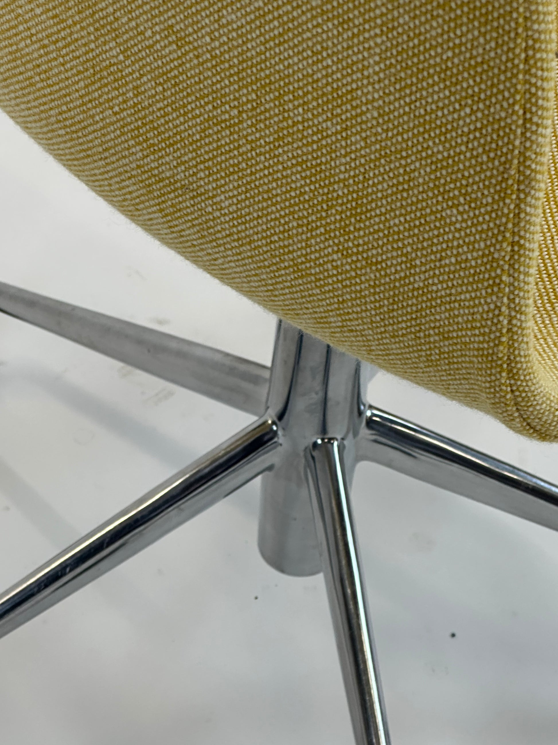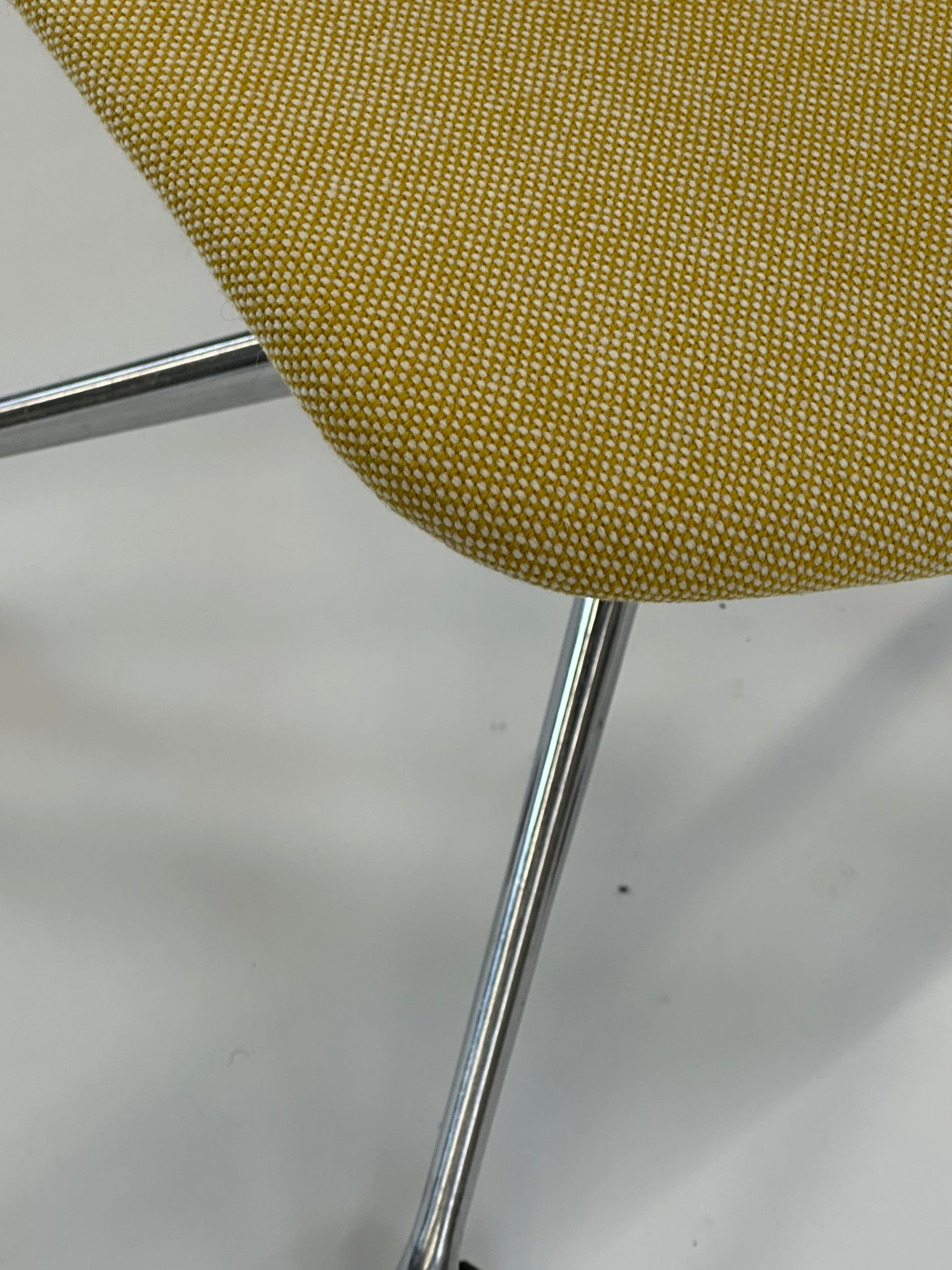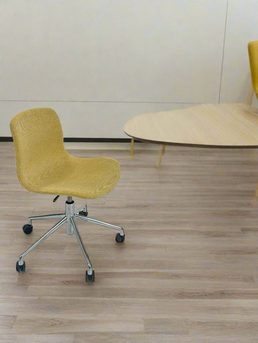 - Sæde: Stolen har en gul polstring med en raffineret tekstur, der tilføjer et elegant og tidløst look. Den kurvede skal giver en ergonomisk korrekt siddeoplevelse og fremmer komfort, selv under længere møder.