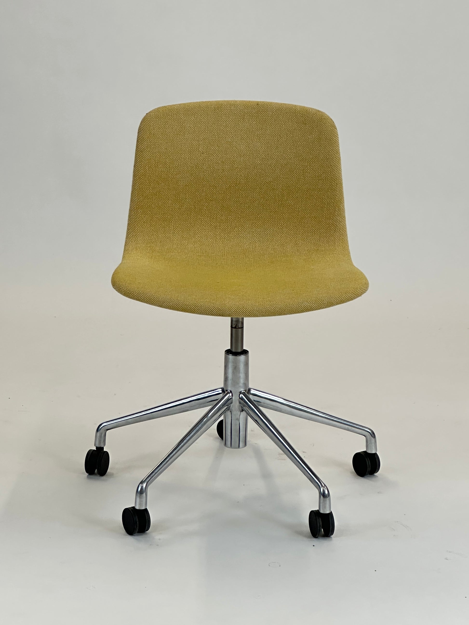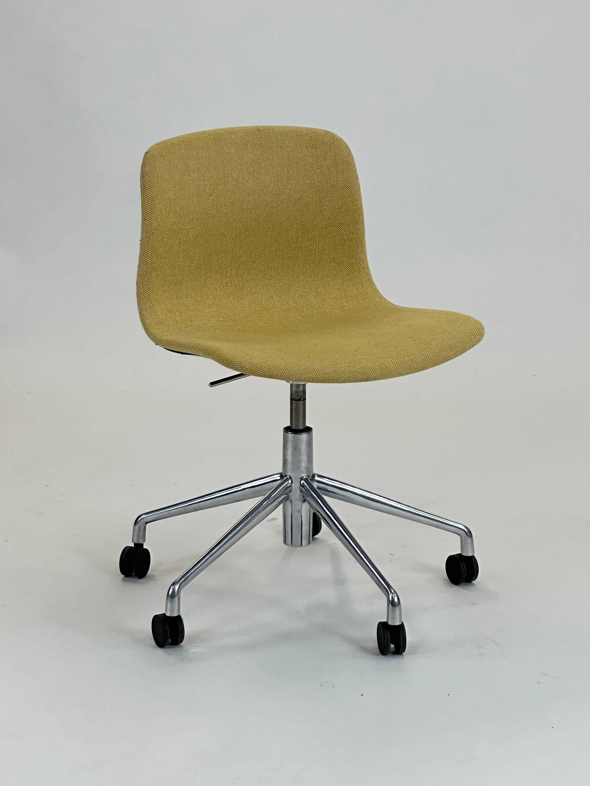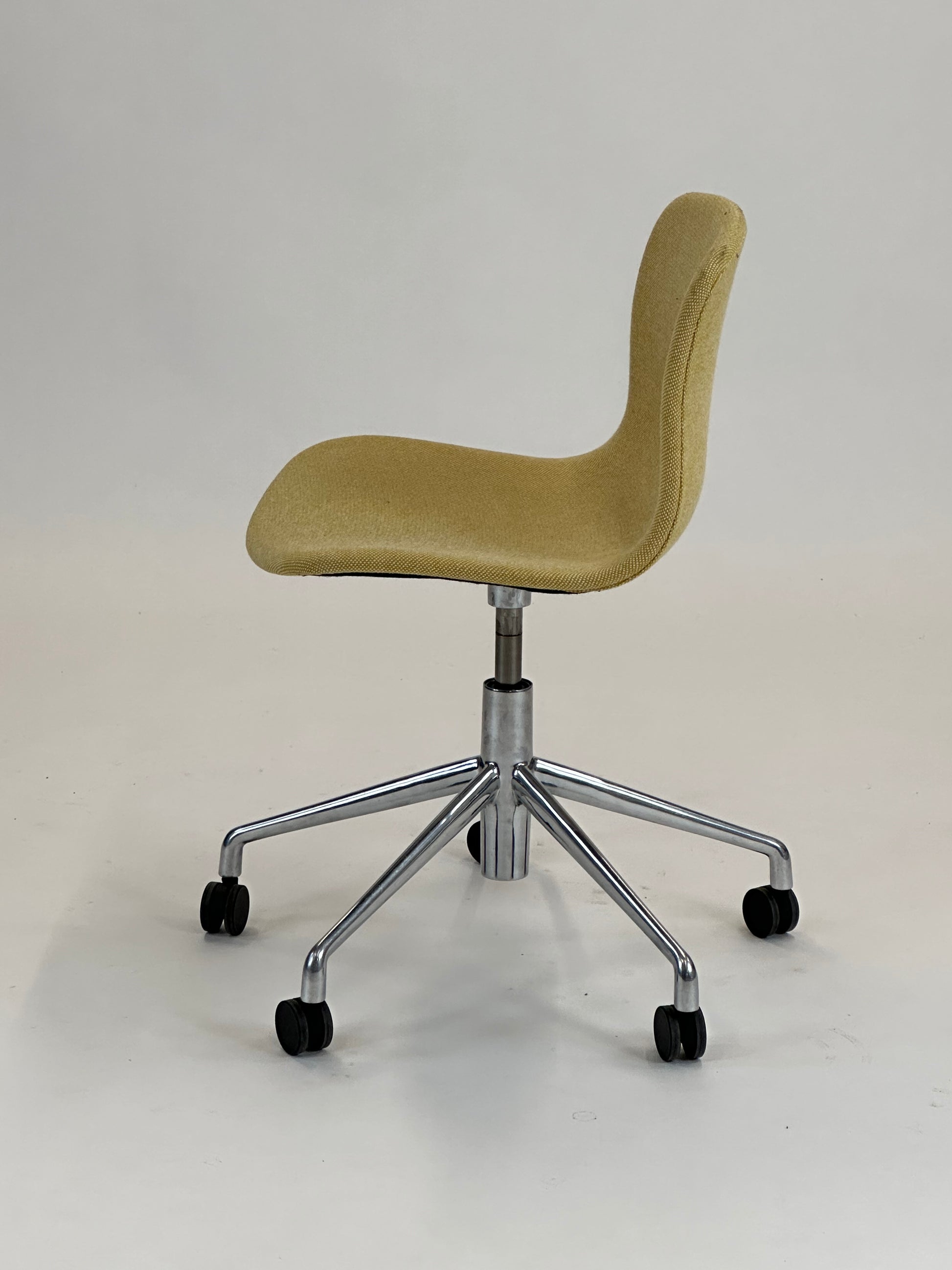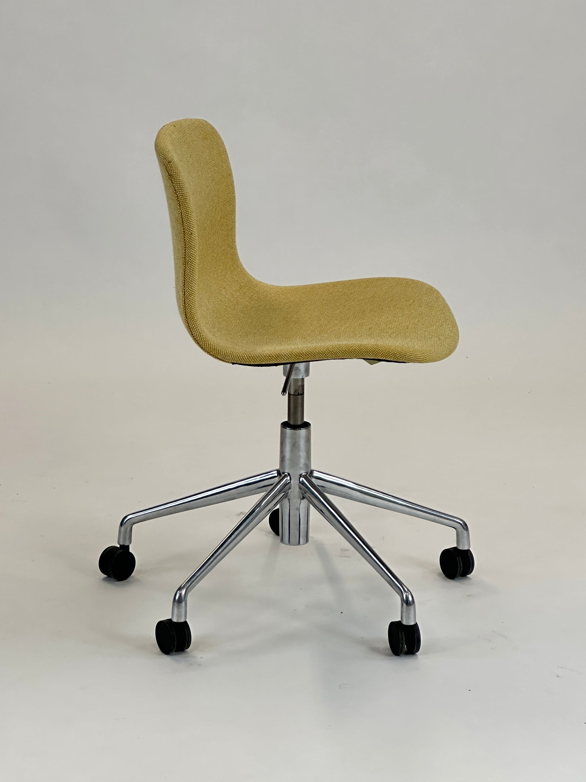 - Sæde: Stolen har en gul polstring med en raffineret tekstur, der tilføjer et elegant og tidløst look. Den kurvede skal giver en ergonomisk korrekt siddeoplevelse og fremmer komfort, selv under længere møder.