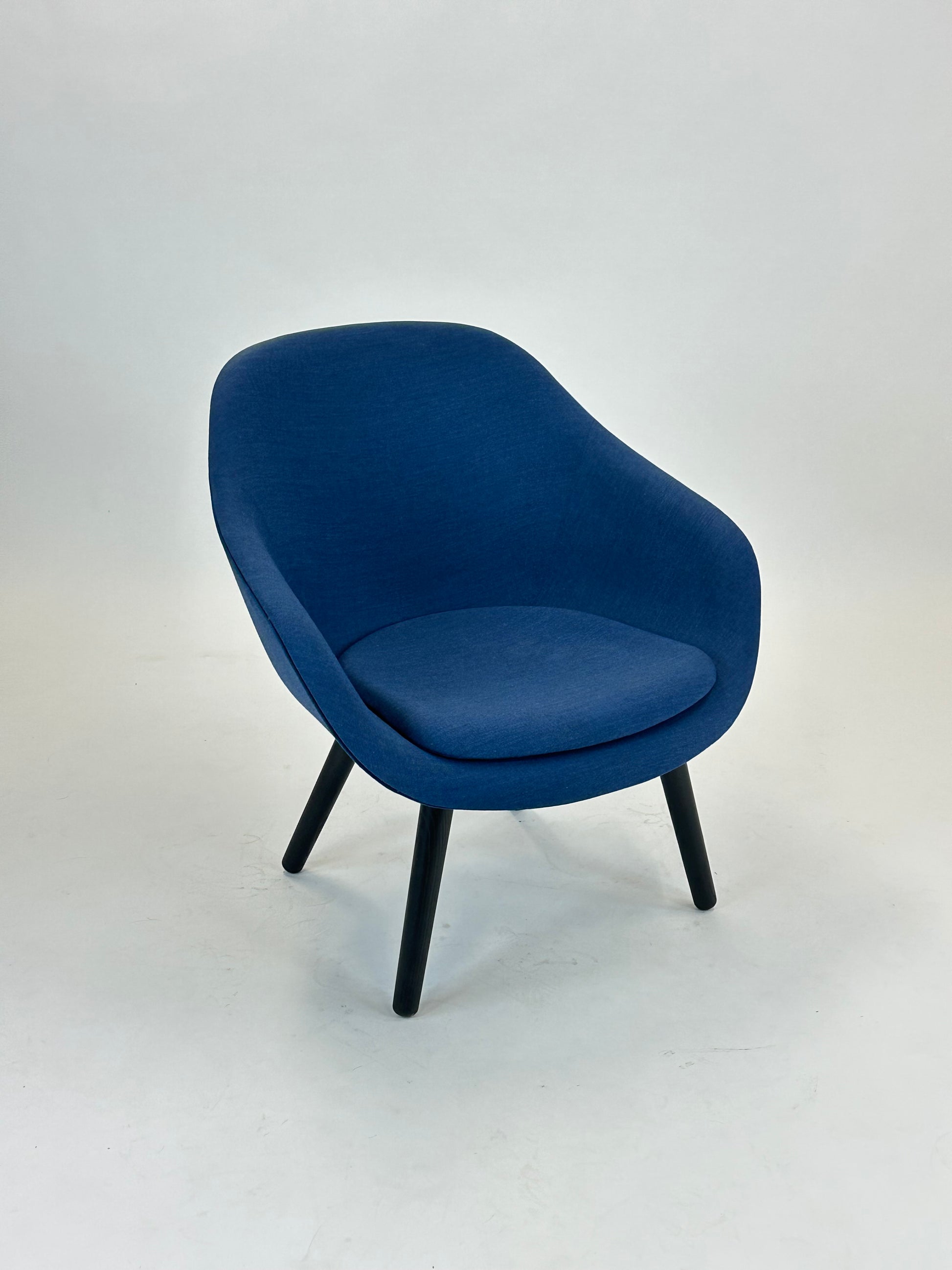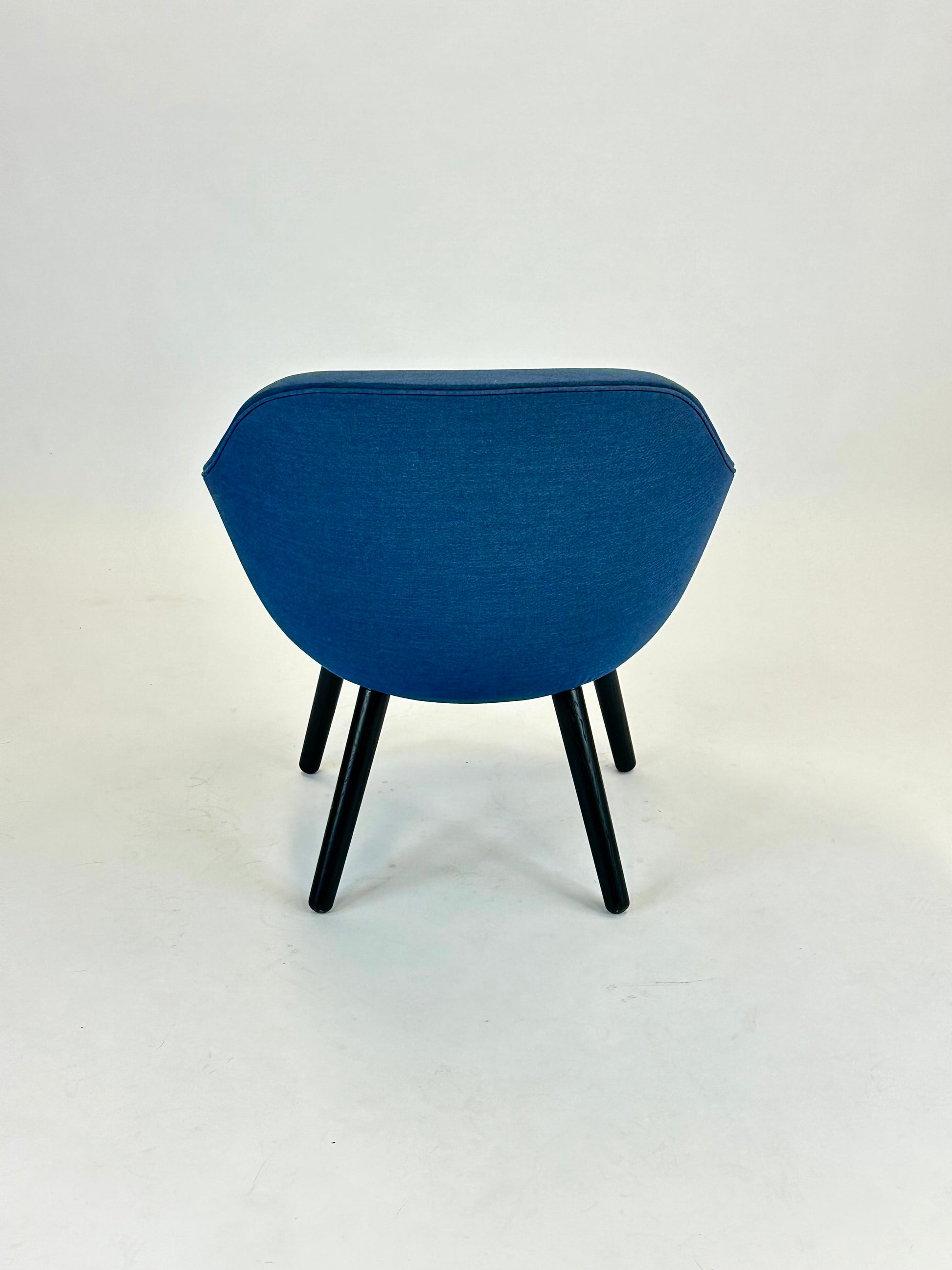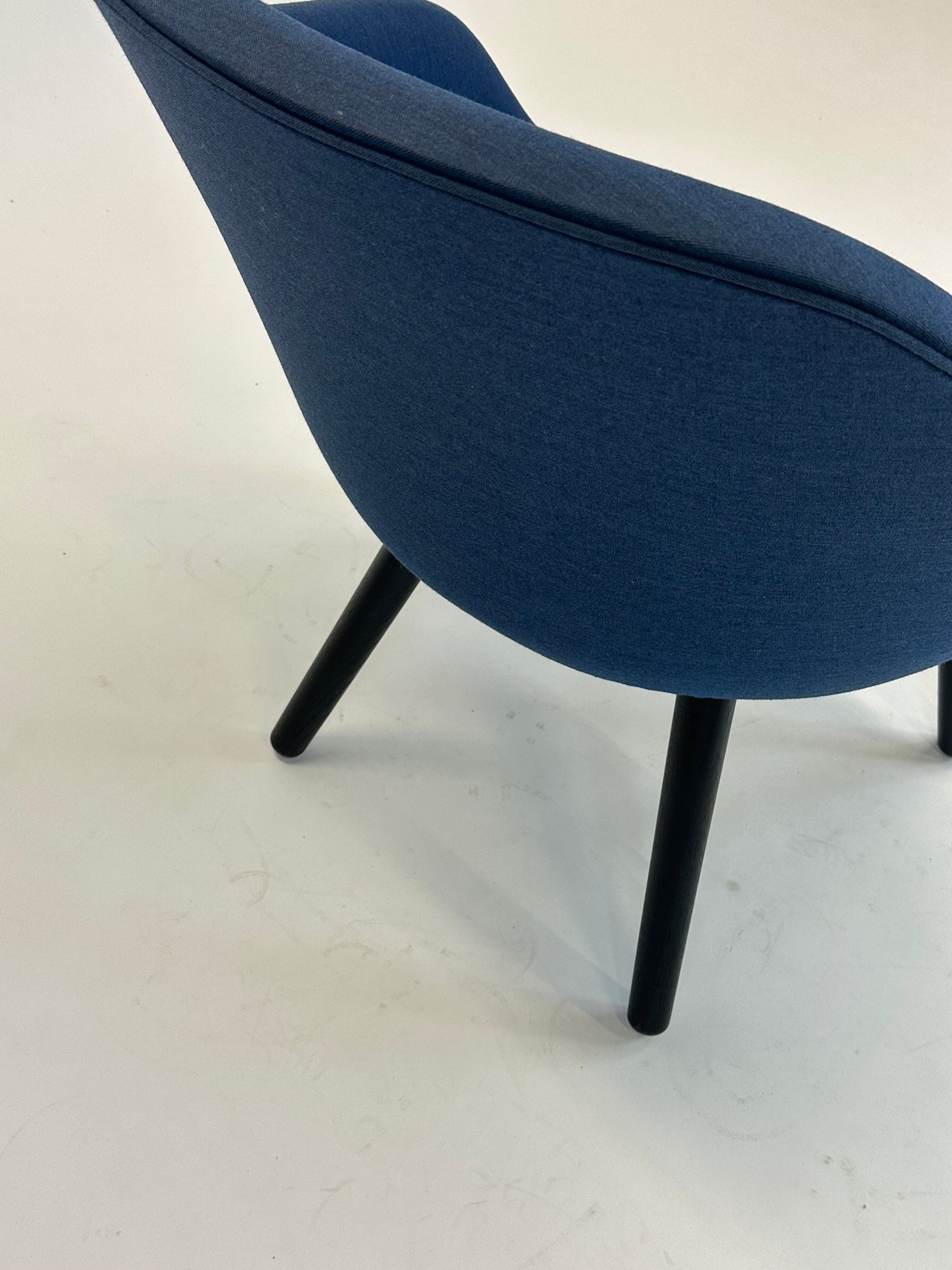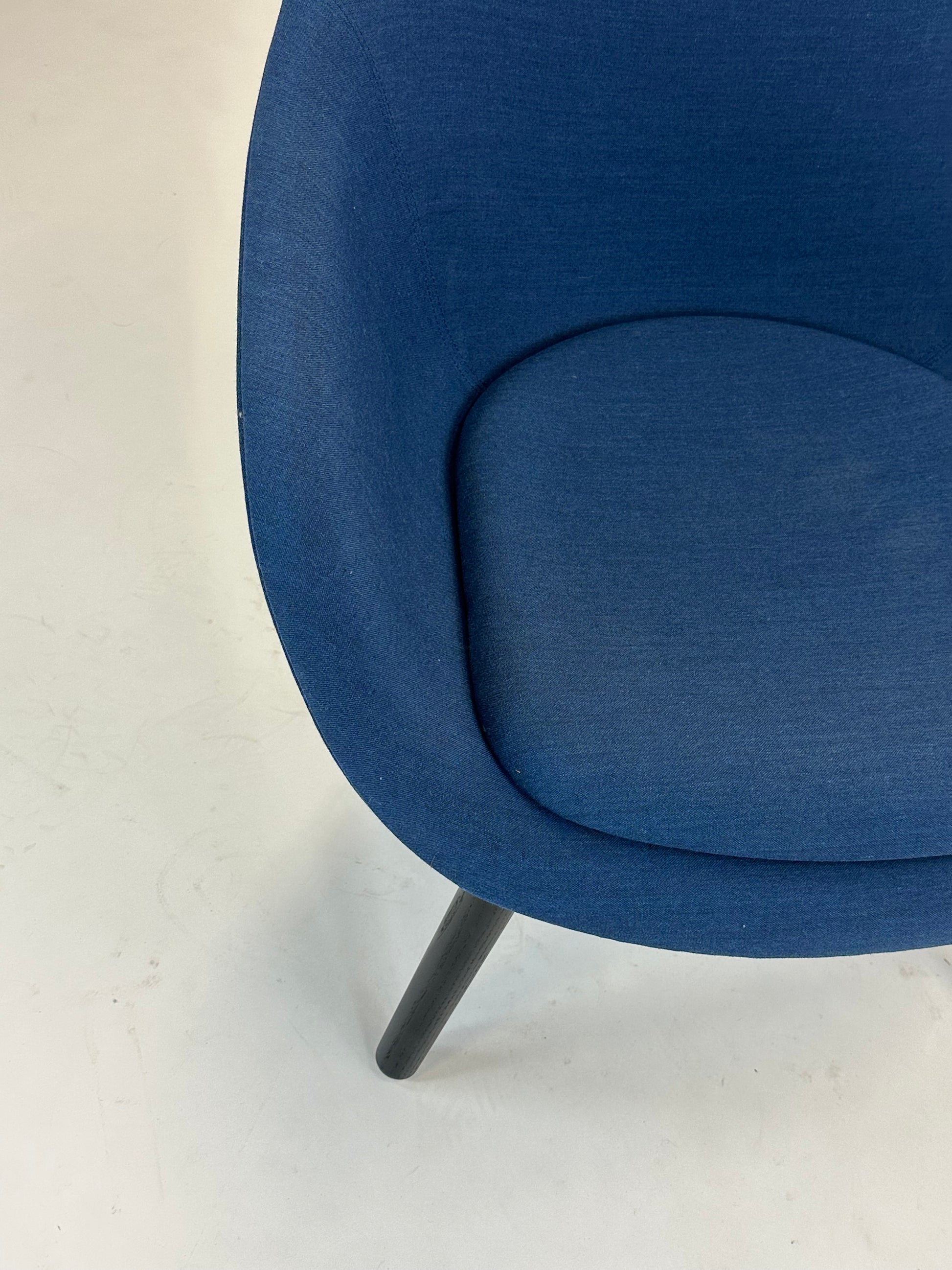 Stolen er polstret i en smuk blå nuance, som tilføjer varme og karakter til rummet, mens de sorte træben giver et solidt og moderne udtryk. Den lave, afrundede ryg og de integrerede armlæn omfavner kroppen og gør stolen perfekt til afslappende øjeblikke – hvad enten det er i receptionen, loungen eller det moderne hjemmekontor.
