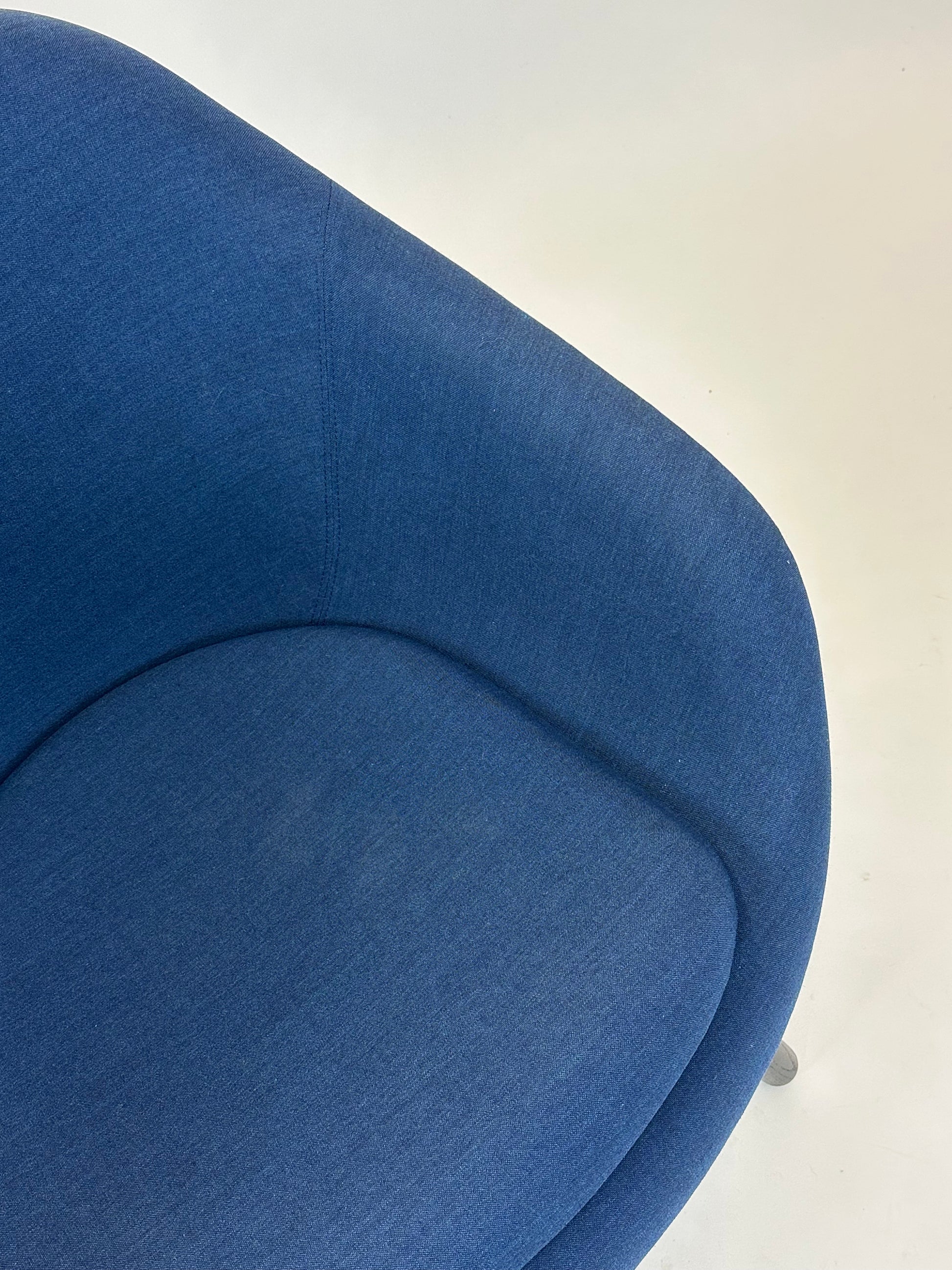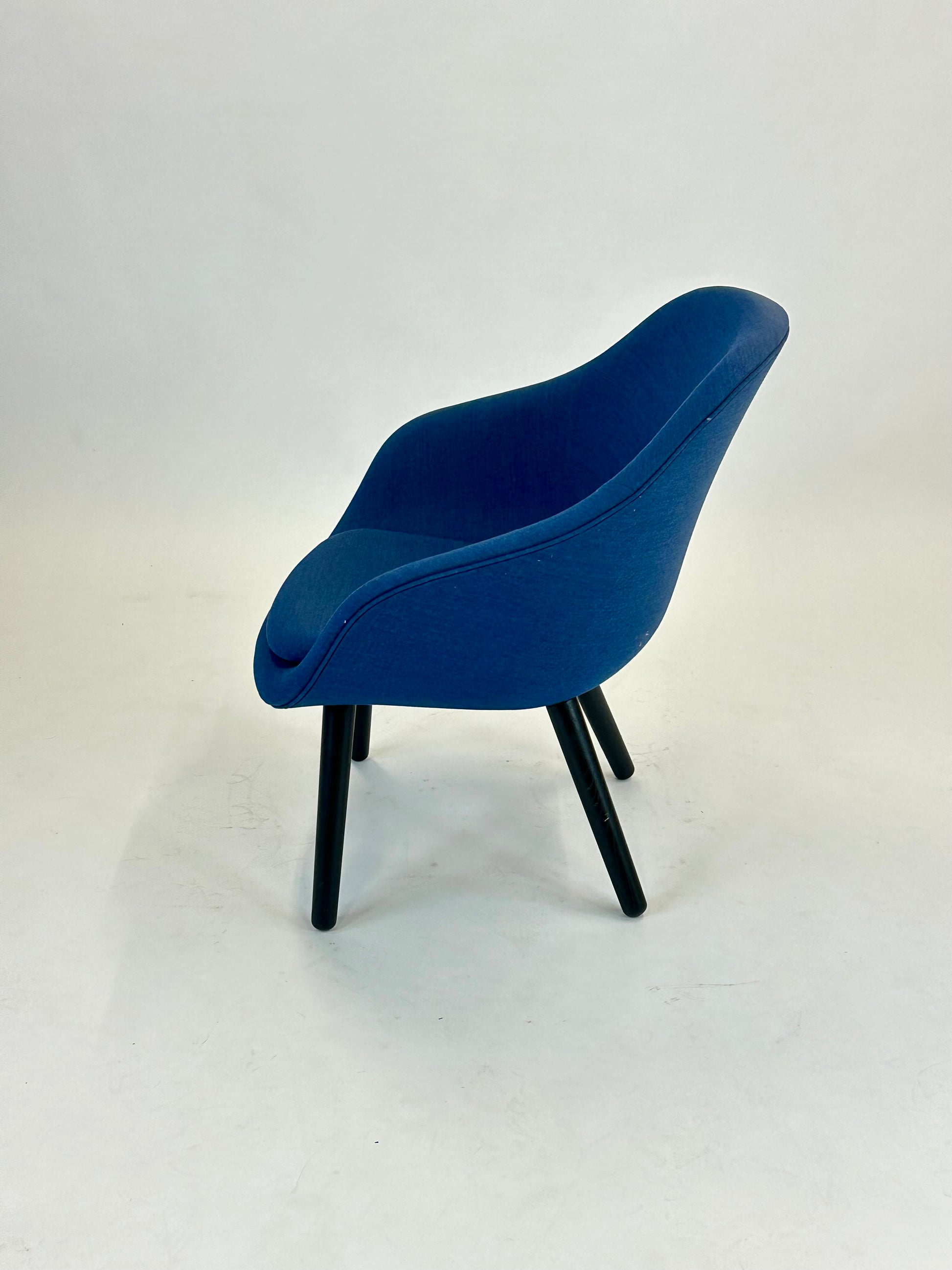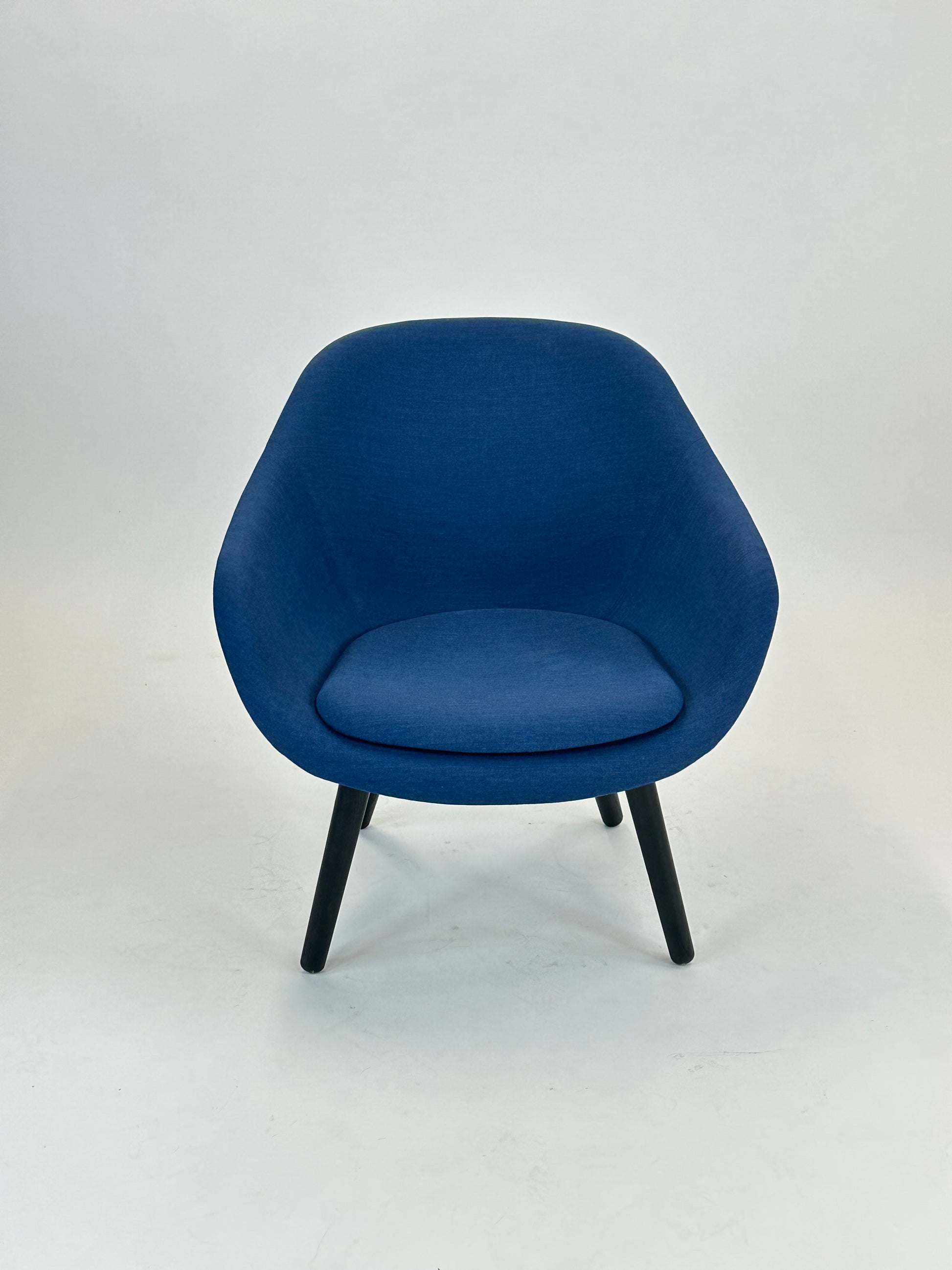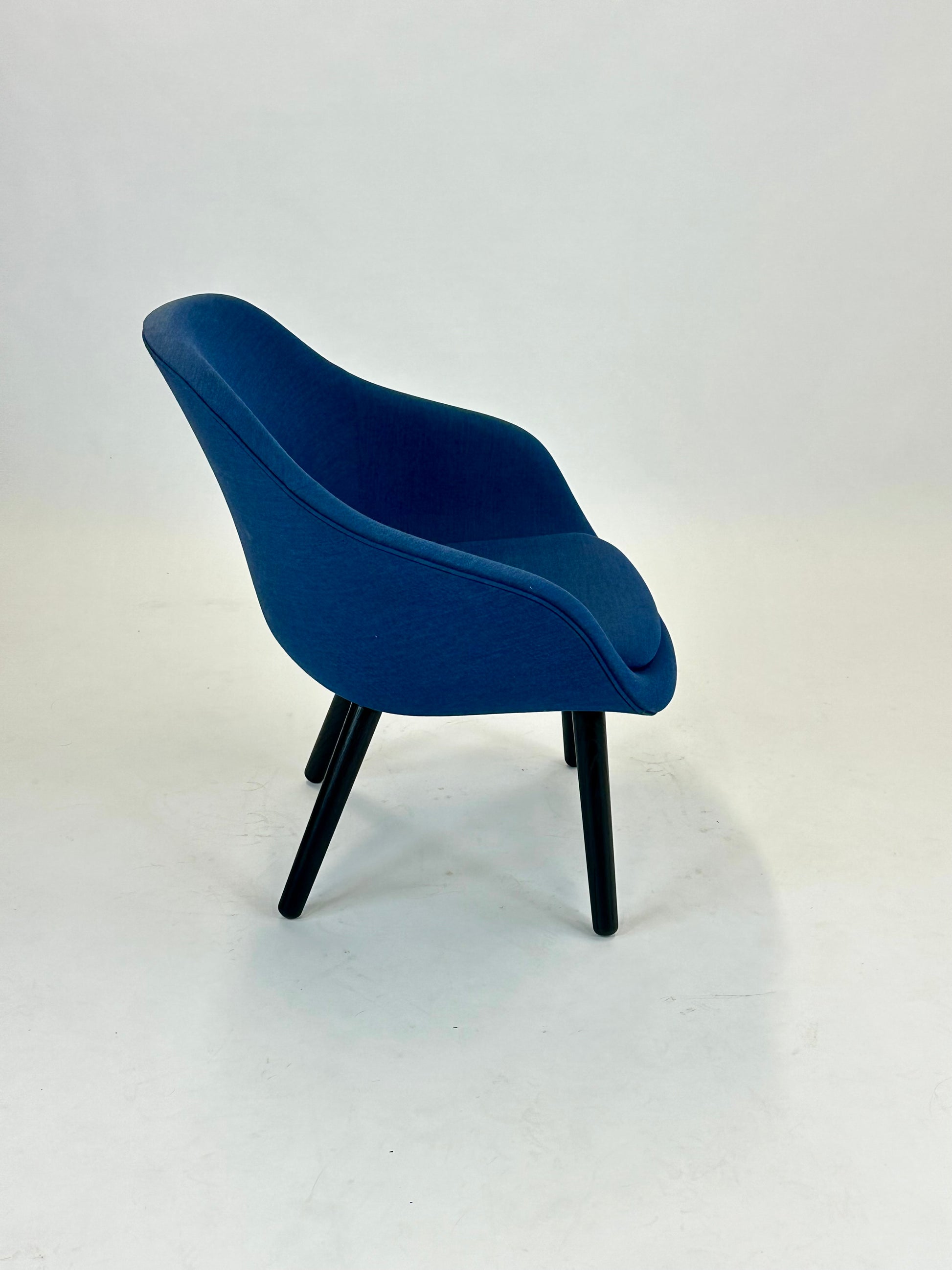 Stolen er polstret i en smuk blå nuance, som tilføjer varme og karakter til rummet, mens de sorte træben giver et solidt og moderne udtryk. Den lave, afrundede ryg og de integrerede armlæn omfavner kroppen og gør stolen perfekt til afslappende øjeblikke – hvad enten det er i receptionen, loungen eller det moderne hjemmekontor.