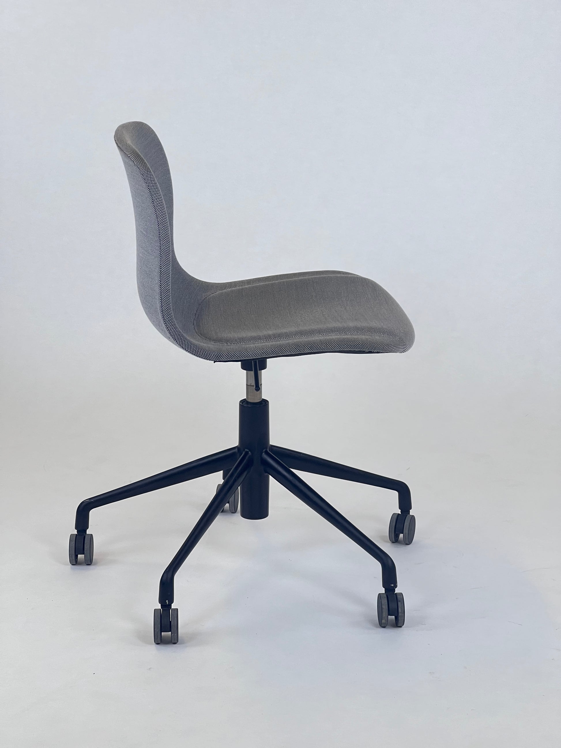 - Sæde: Stolen har en lysegrå polstring med en raffineret tekstur, der tilføjer et elegant og tidløst look. Den kurvede skal giver en ergonomisk korrekt siddeoplevelse og fremmer komfort, selv under længere møder.