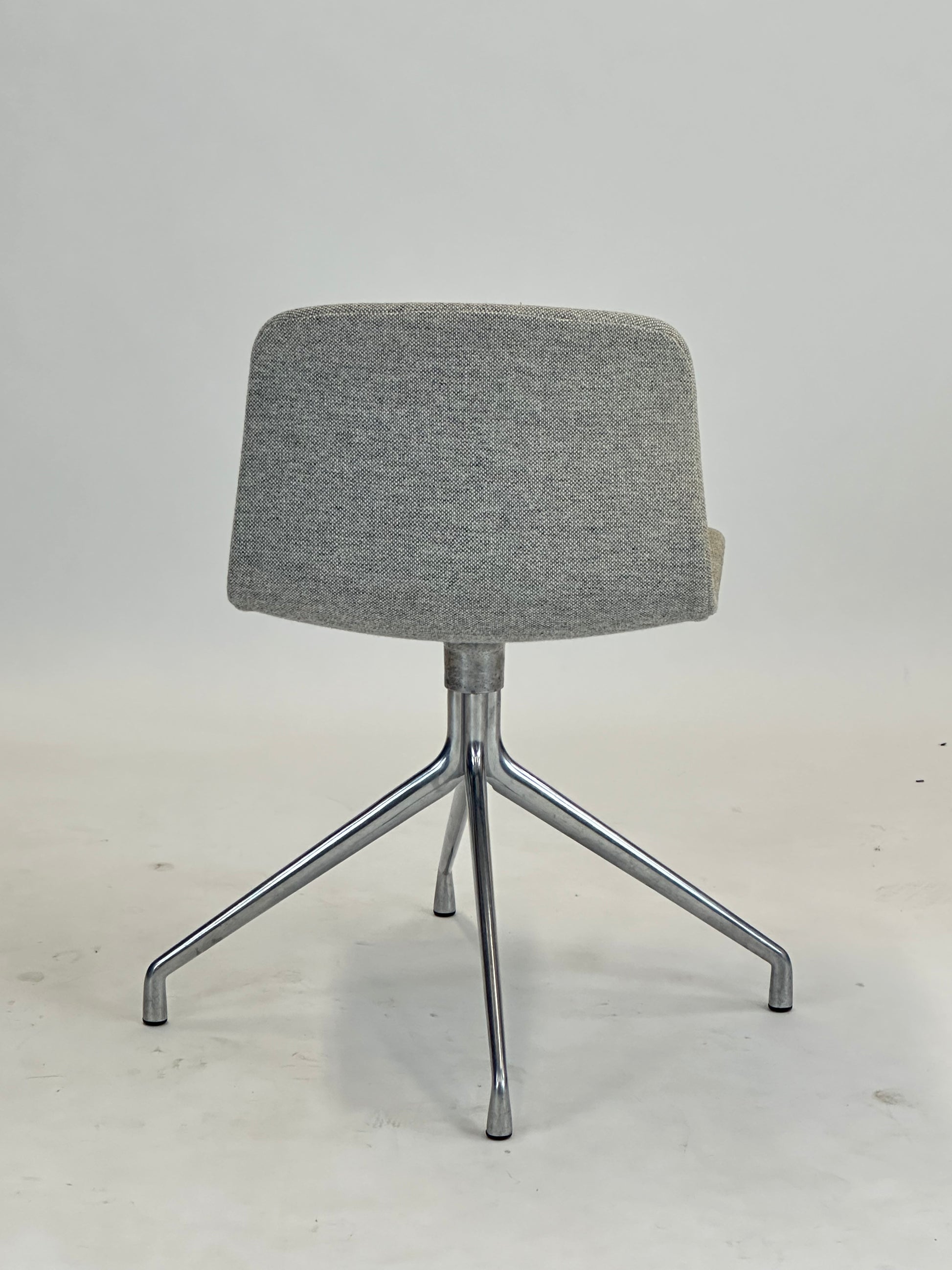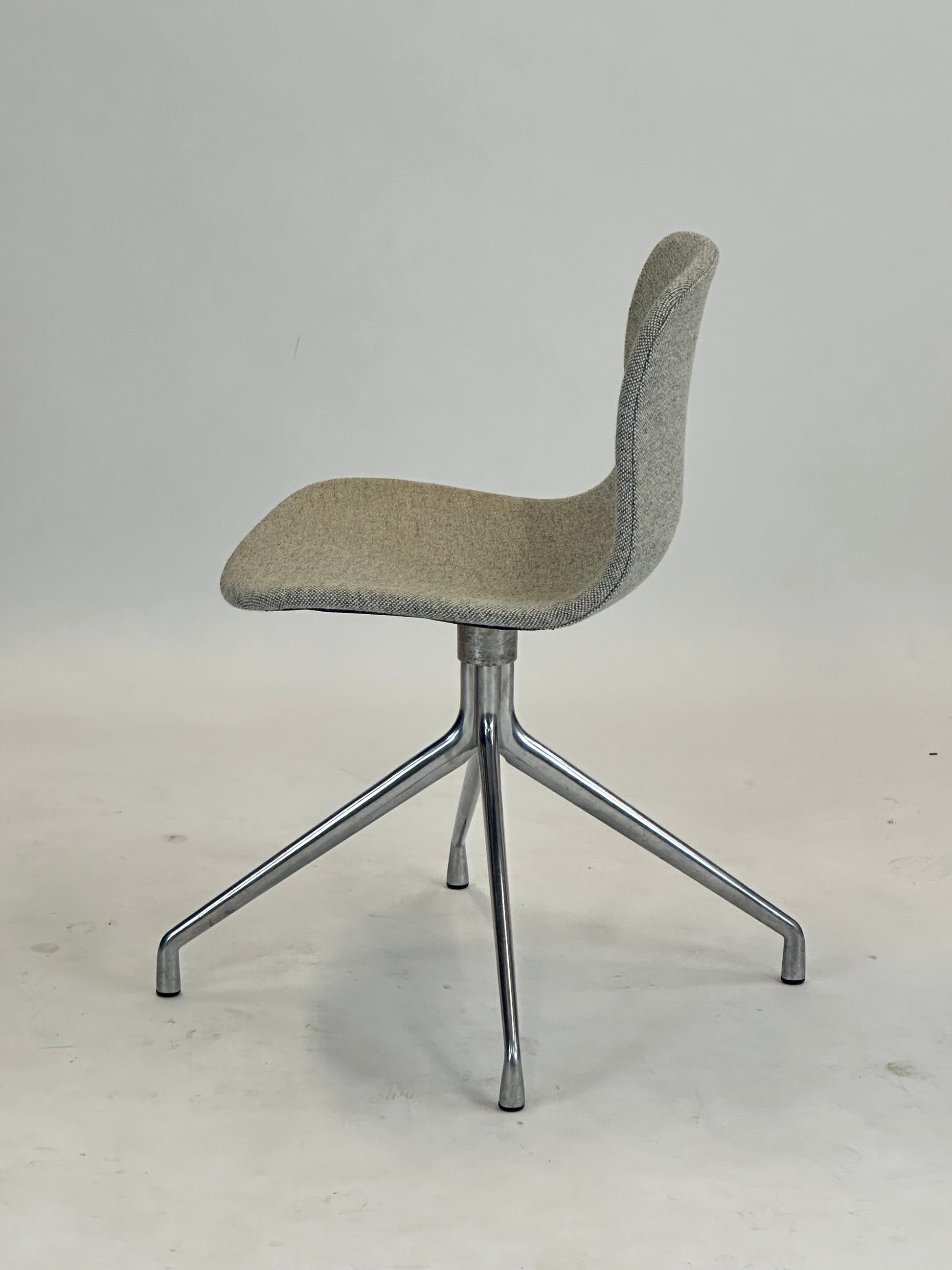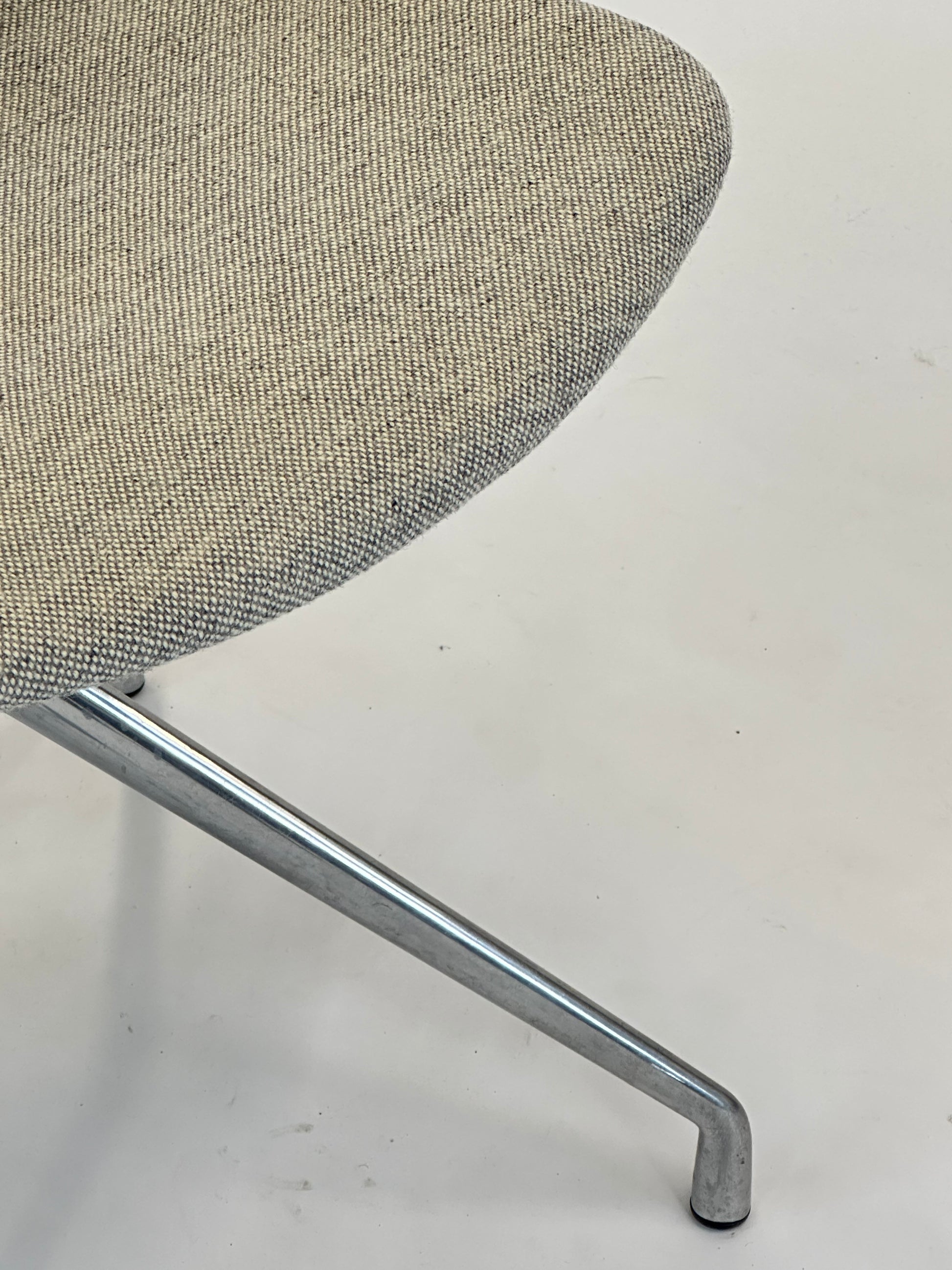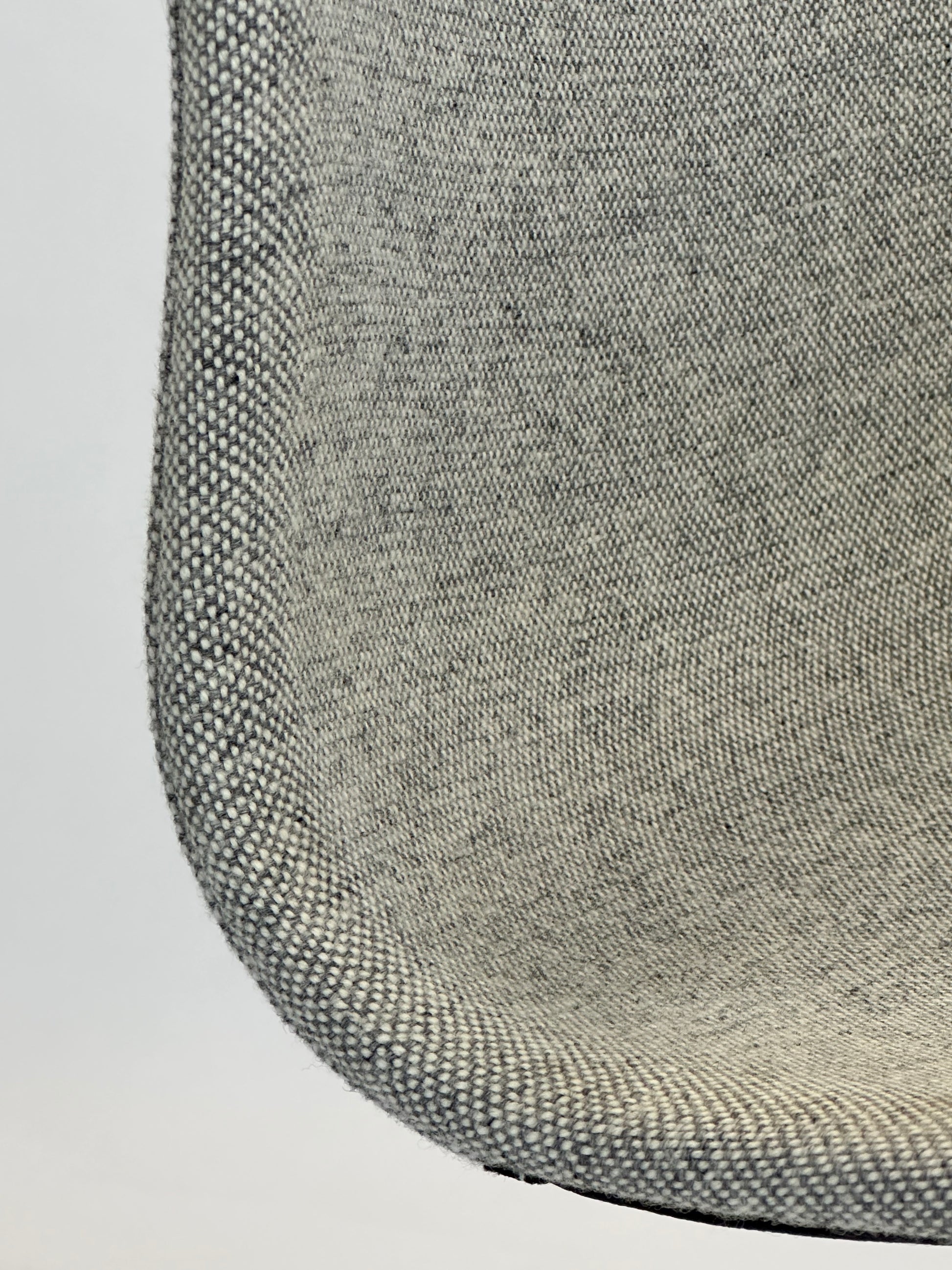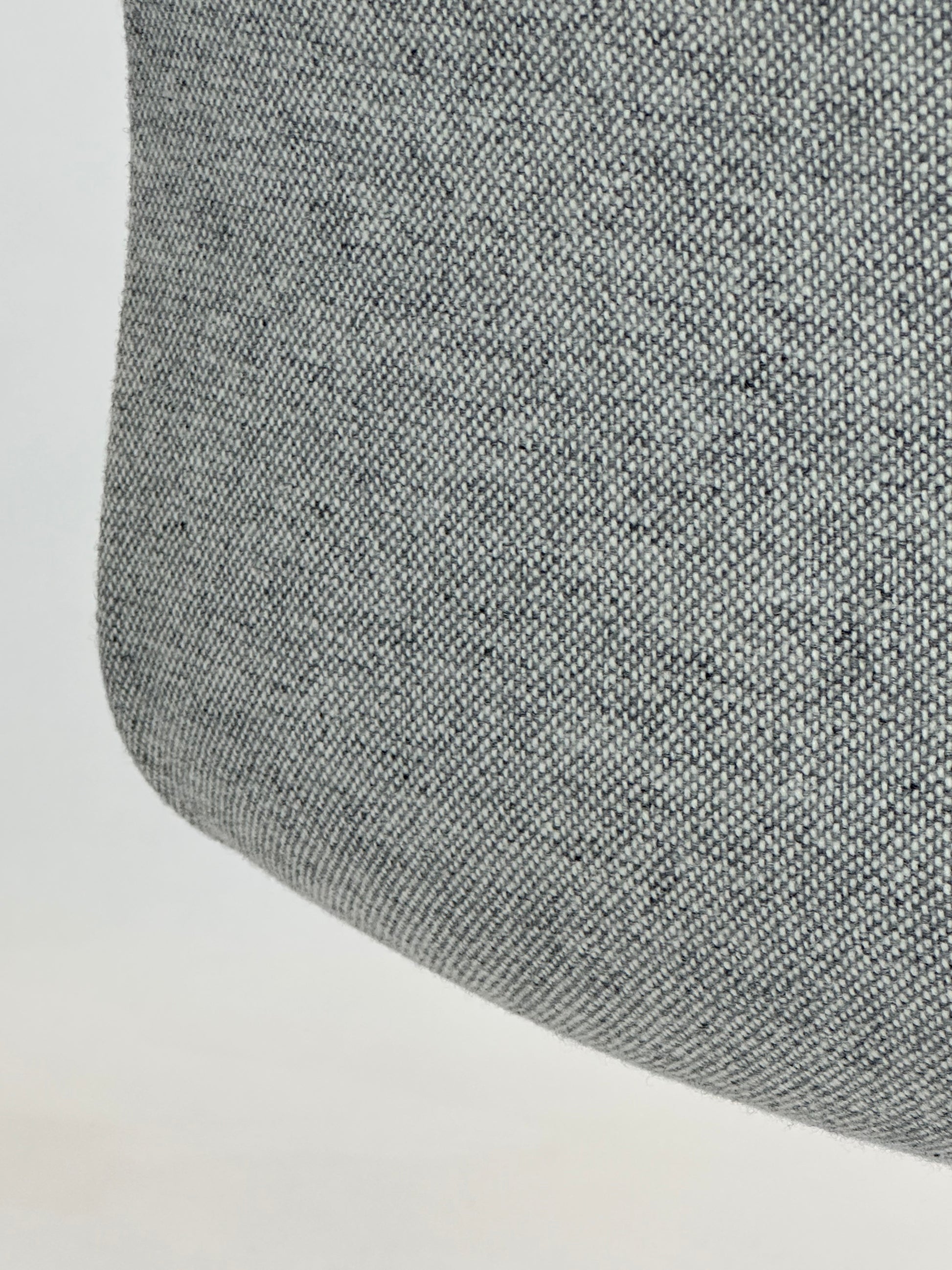 - Sæde: Stolen har en lysegrå polstring med en raffineret tekstur, der tilføjer et elegant og tidløst look. Den kurvede skal giver en ergonomisk korrekt siddeoplevelse og fremmer komfort, selv under længere møder.