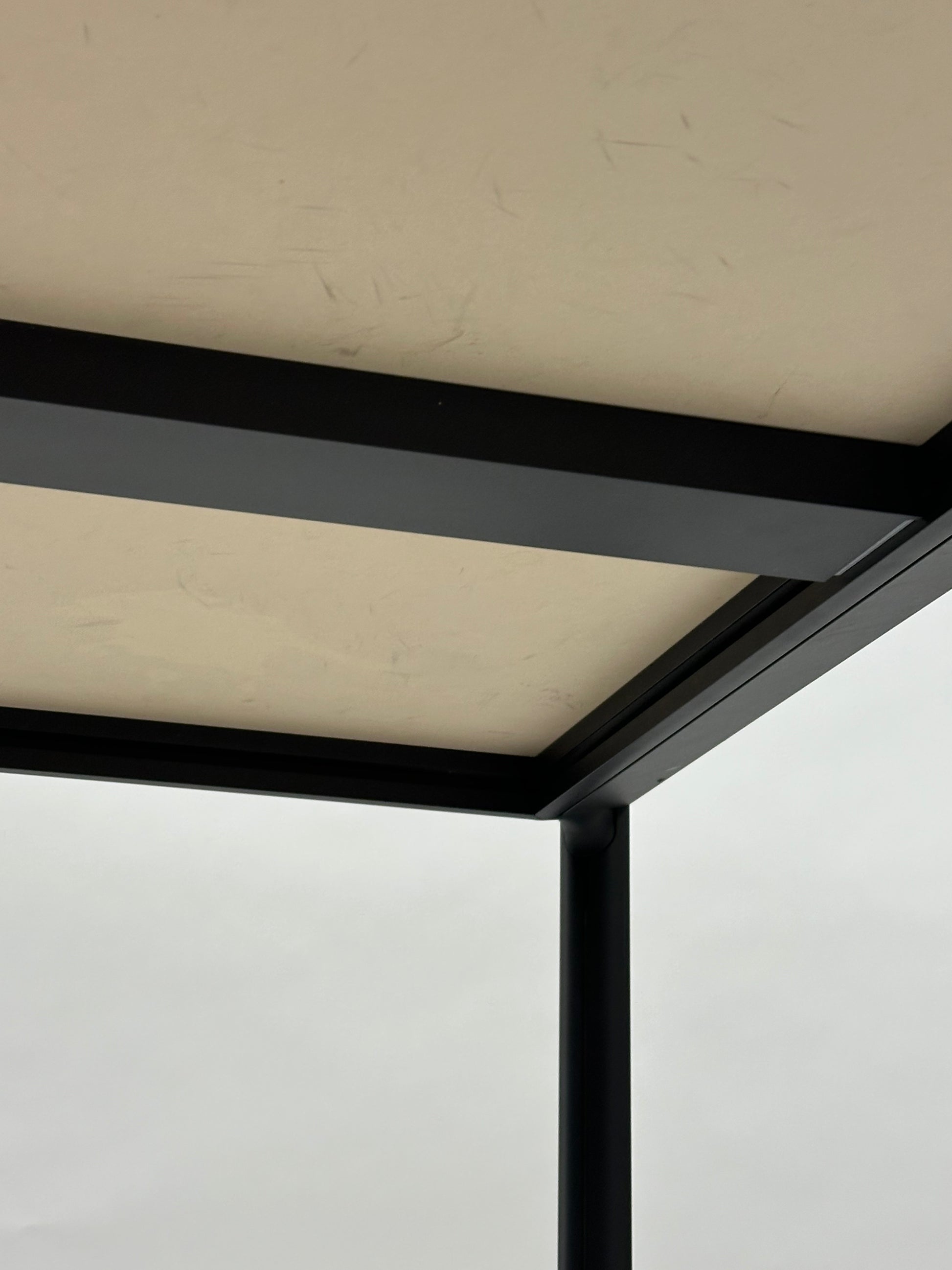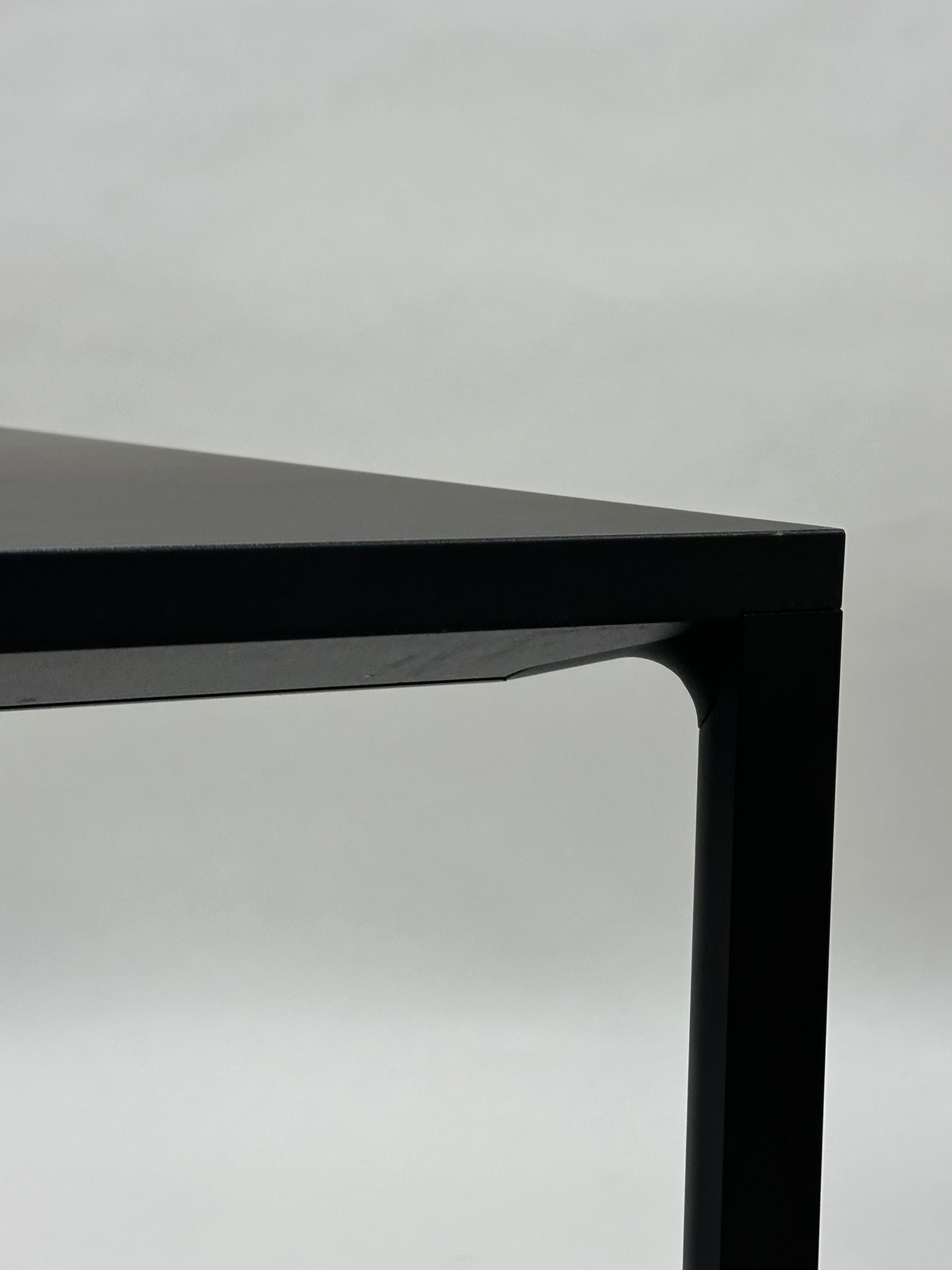 Bordet har en sortlakeret aluminiumsramme og en matchende sort bordplade, hvilket giver et ensartet, professionelt udtryk. Kombinationen af det lette stel og de skarpe linjer resulterer i et møbel, der fremstår svævende og enkelt, men stadig robust nok til intensiv brug. New Order-serien er kendt for sin modulopbygning, hvilket gør bordet ideelt i sammenhænge, hvor der ønskes mulighed for skalering eller kombination med andre enheder i samme serie.