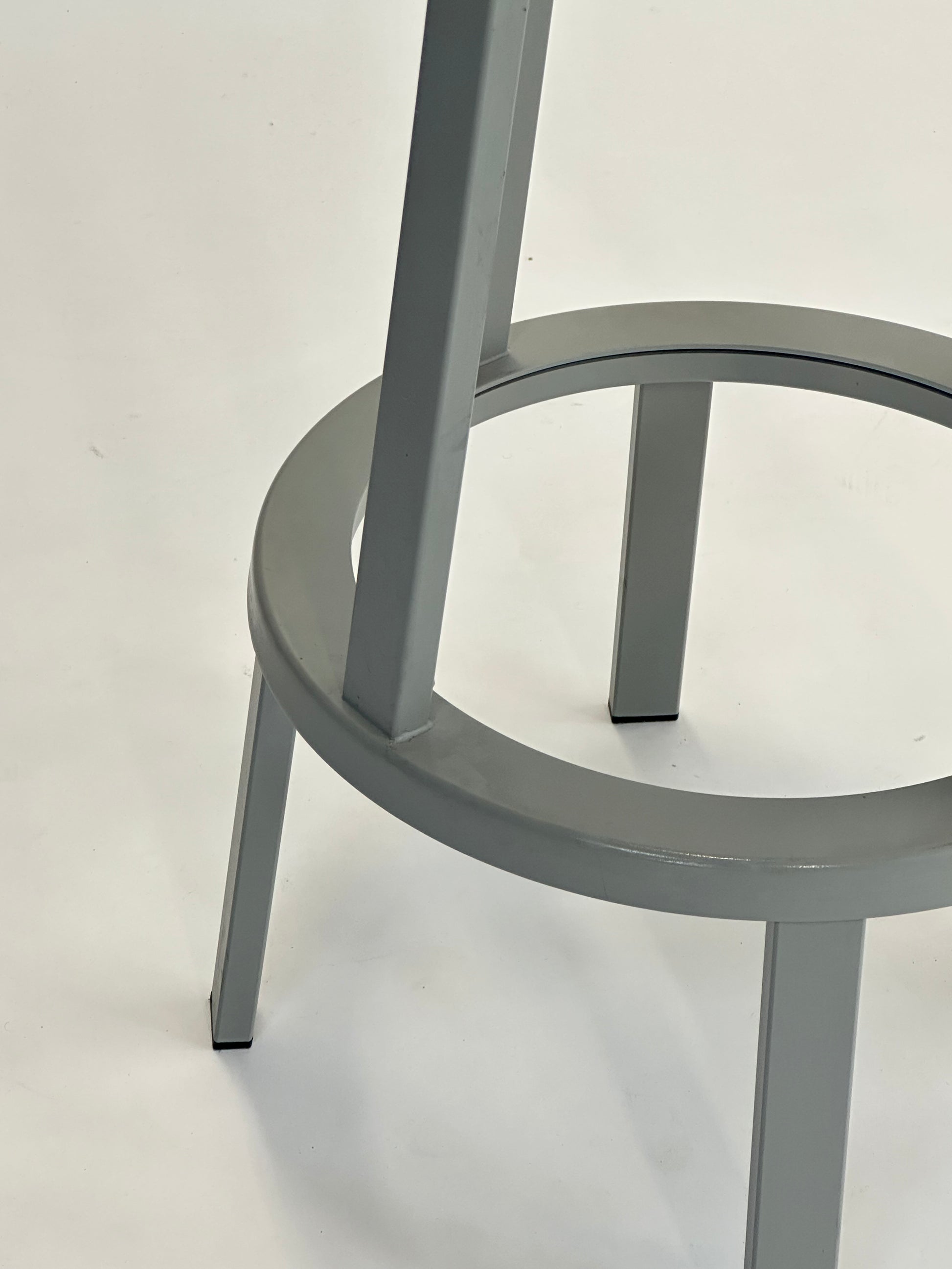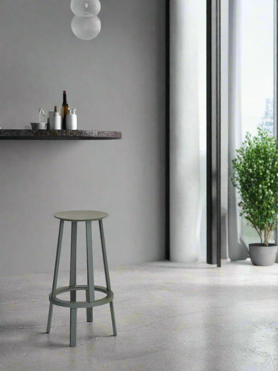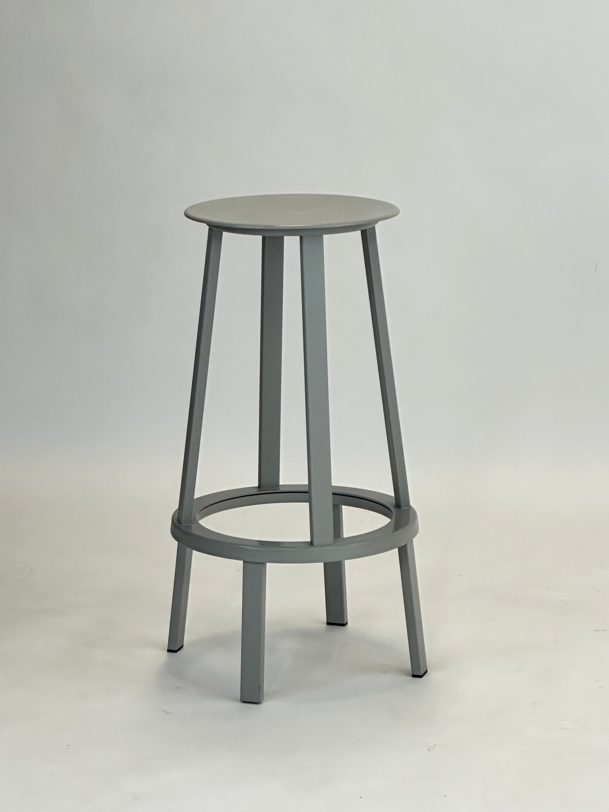 - Materialer: Fremstillet i robust og lakeret stål, denne version af Revolver barstolen er grå, hvilket giver et minimalistisk og stilrent udtryk, der let passer ind i forskellige indretningsstile.