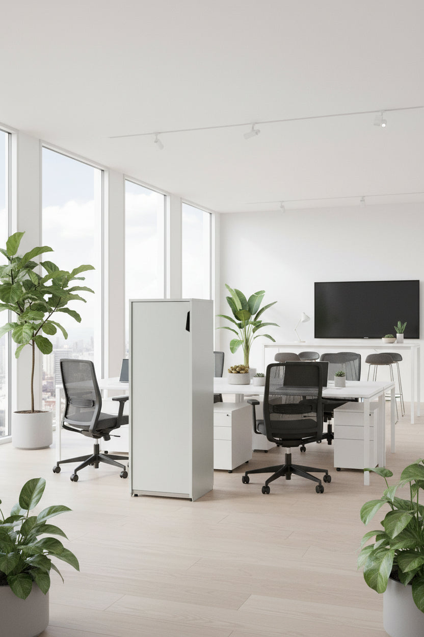 Dette Genese udtræksskab i hvid fremstår med et minimalistisk og strømlinet design, der nemt integreres i både åbne kontormiljøer og individuelle arbejdsstationer. Skabets udtræksfunktion giver let adgang til indholdet, samtidig med at det optager minimal gulvplads – ideelt til opbevaring af mapper, kontorartikler eller personlige ejendele. Den hvide overflade bidrager til et lyst og professionelt udtryk, som passer ind i de fleste indretninger. Kombinationen af funktionalitet og diskret design gør modellen til et tidløst valg i erhvervsmiljøer.