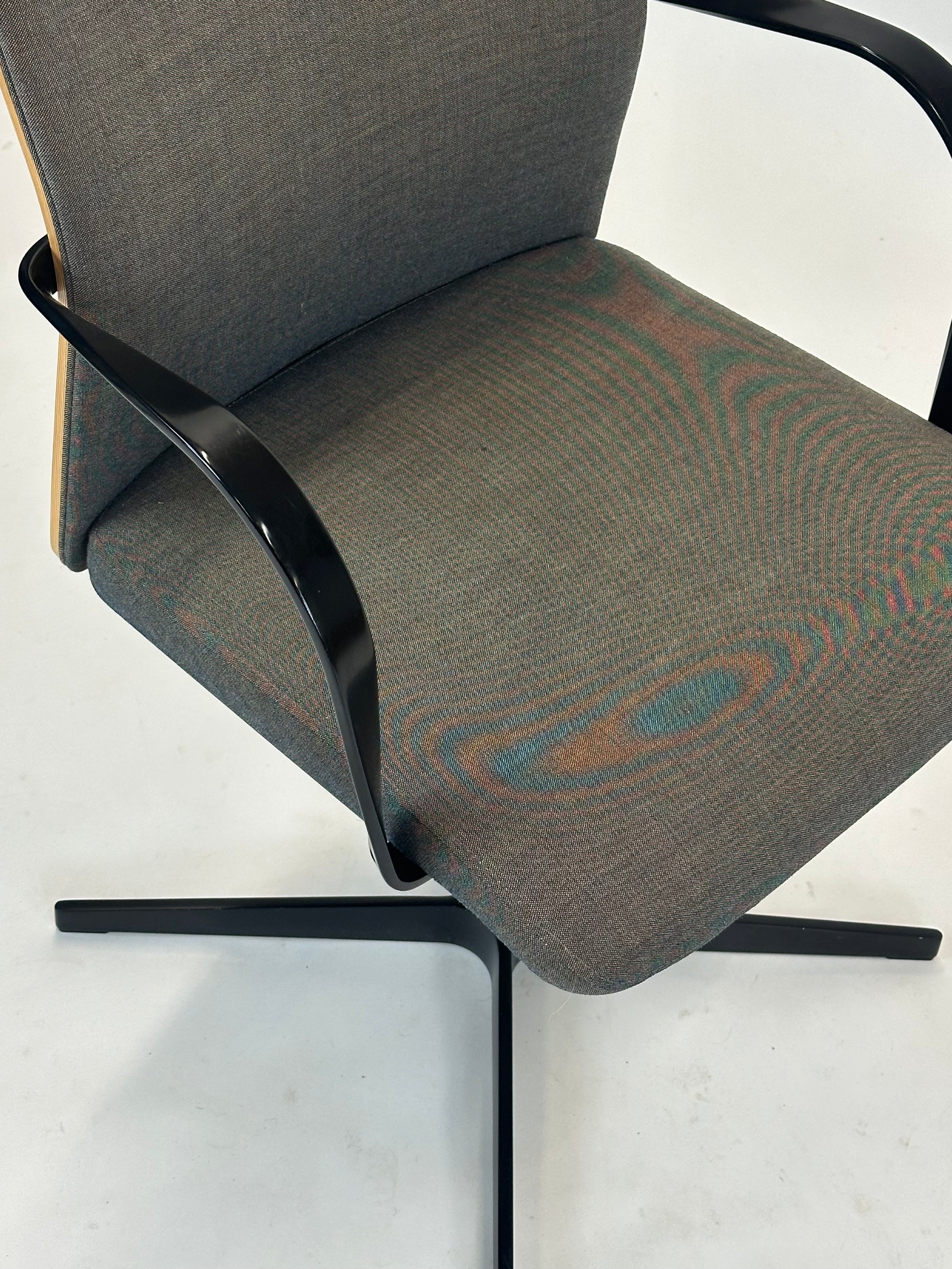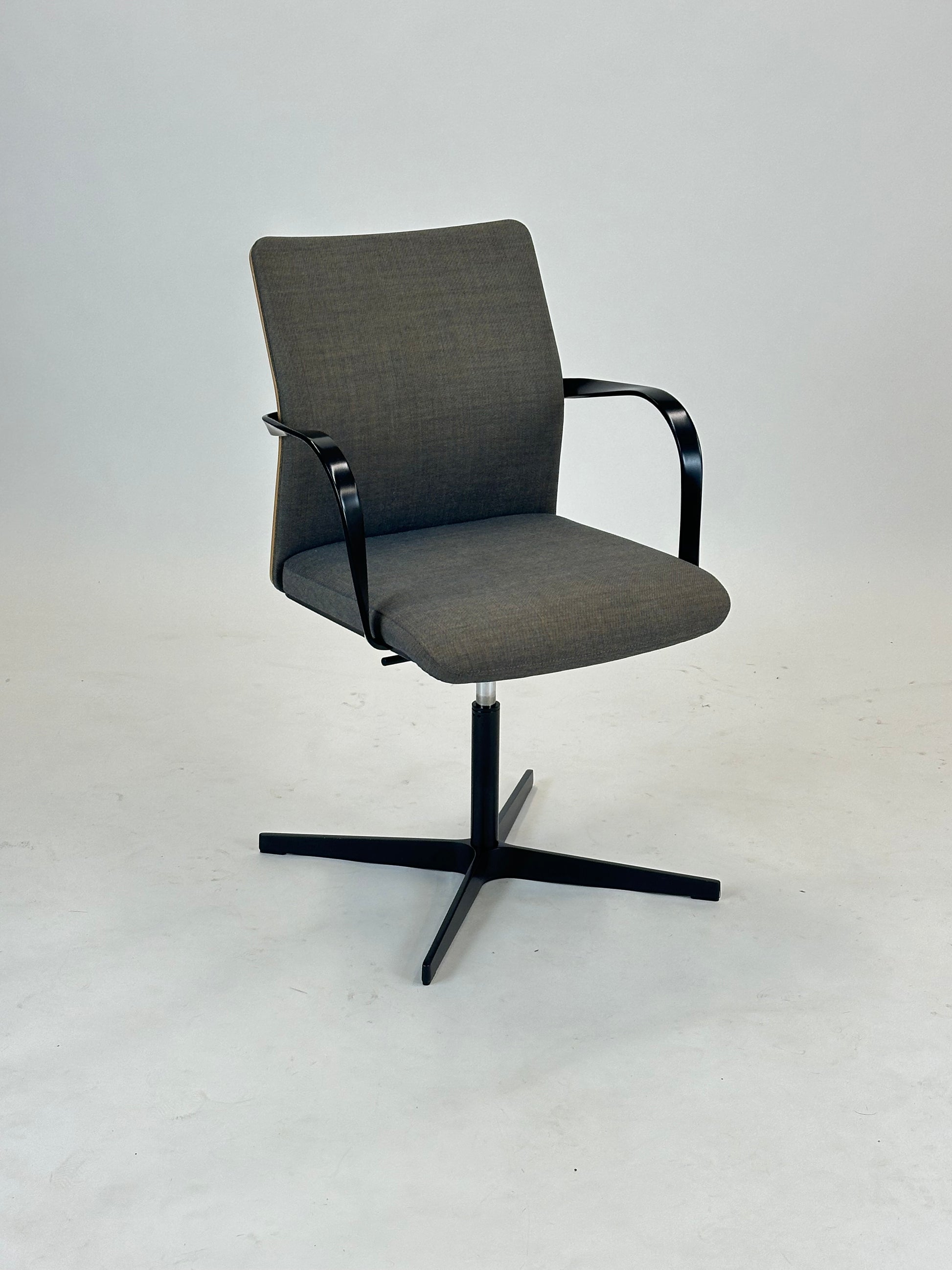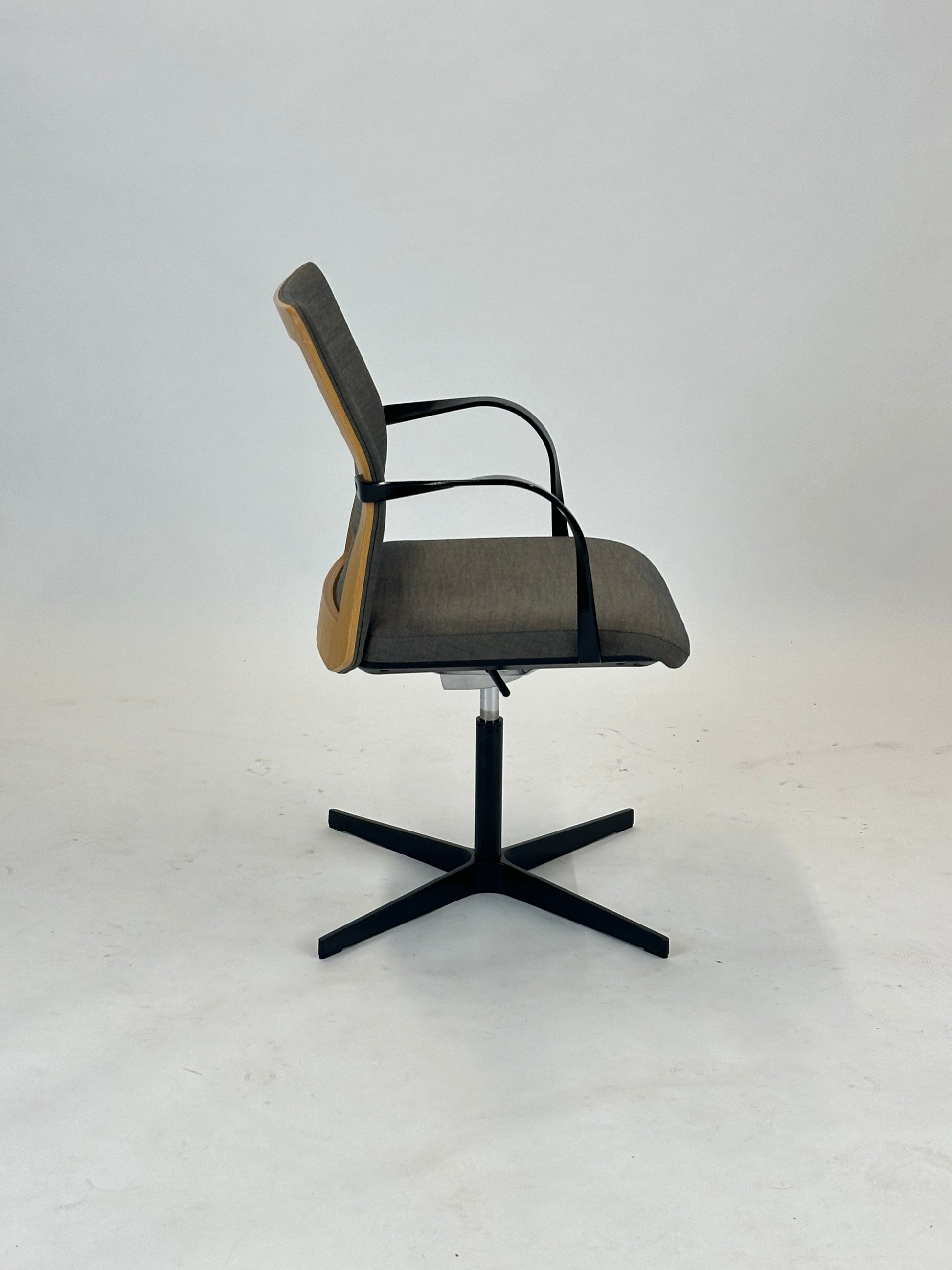 Stolens ryglæn er udført i en smuk træramme med stofpolstring. Sædet er komfortabelt polstret og sikrer en behagelig siddeoplevelse – selv under længere møder eller arbejdsdage. De elegante armlæn understøtter en ergonomisk siddestilling, mens det stabile drejestel giver fleksibilitet og bevægelsesfrihed i rummet.