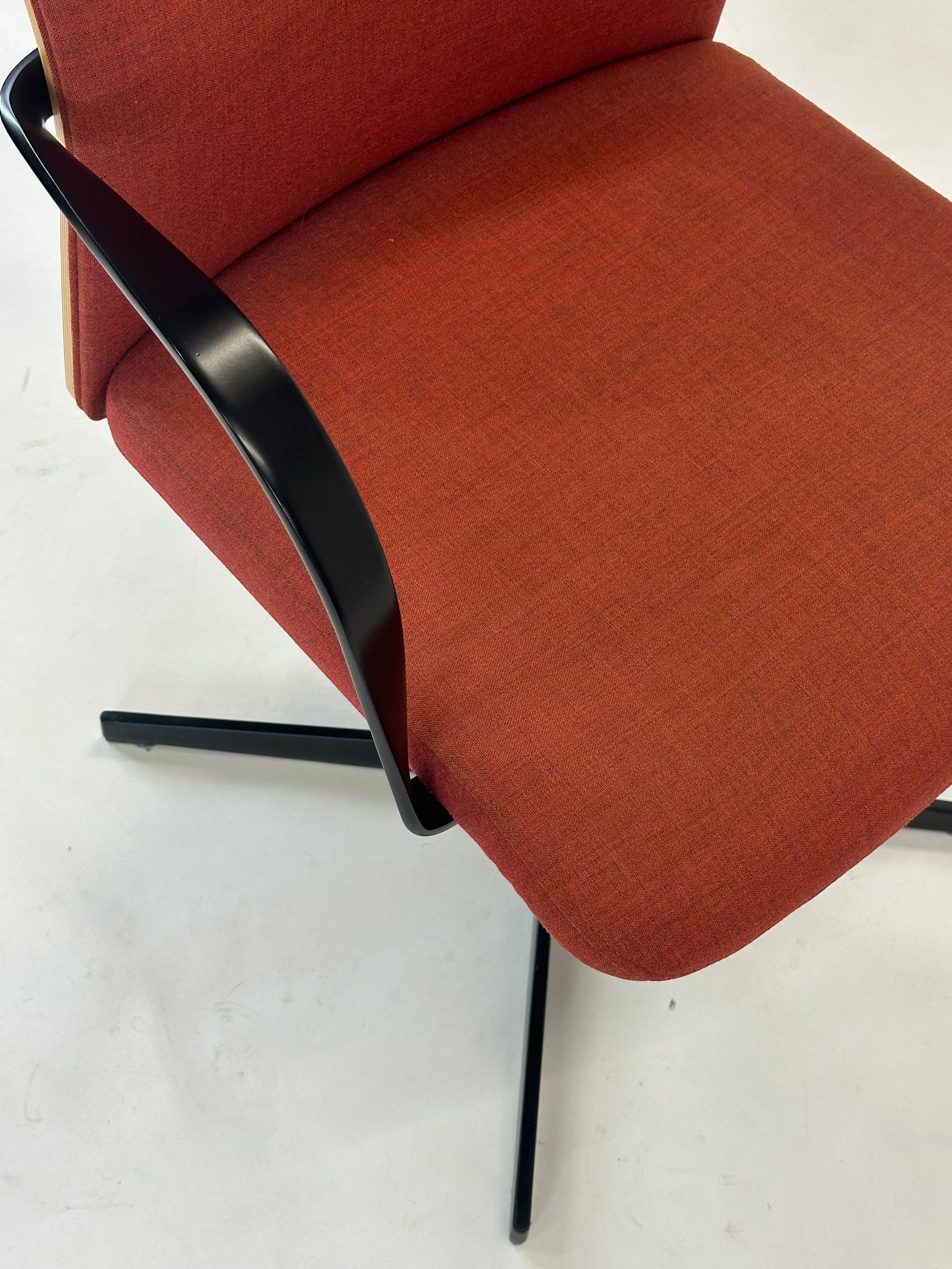 Stolens ryglæn er udført i en smuk træramme med stofpolstring, der giver både visuel lethed og optimal komfort. Sædet har stofpolstring og sikrer en behagelig siddeoplevelse – selv under længere møder eller arbejdsdage. De elegante armlæn understøtter en ergonomisk siddestilling, mens det stabile drejestel giver fleksibilitet og bevægelsesfrihed i rummet.